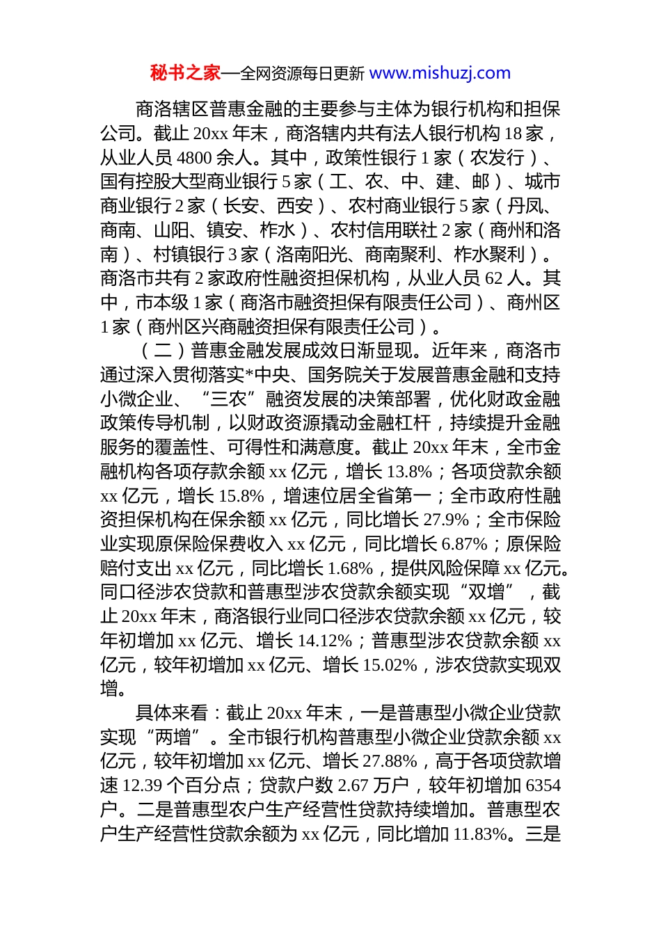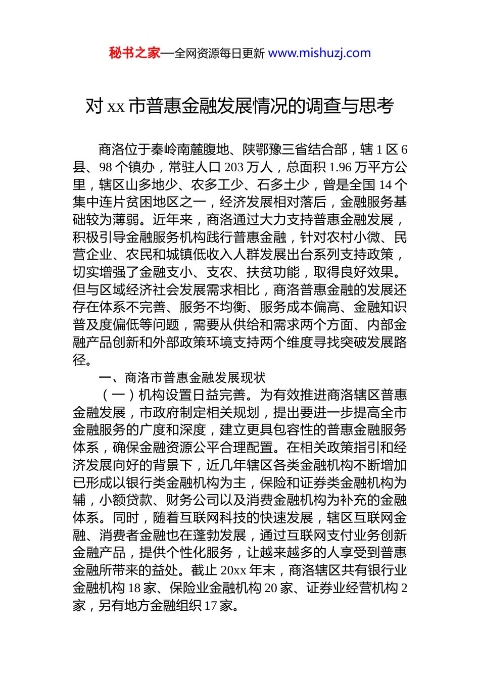 秘书之家—全网资源每日更新 www.mishuzj.com对 xx 市普惠金融发展情况的调查与思考商洛位于秦岭南麓腹地、陕鄂豫三省结合部,辖 1 区 6县、98 个镇办,常驻人口 203 万人,总面积 1.96 万平方公里,辖区山多地少、农多工少、石多土少,曾是全国 14 个集中连片贫困地区之一,经济发展相对落后,金融服务基础较为薄弱。近年来,商洛通过大力支持普惠金融发展,积极引导金融服务机构践行普惠金融,针对农村小微、民营企业、农民和城镇低收入人群发展出台系列支持政策,切实增强了金融支小、支农、扶贫功能,取得良好效果。但与区域经济社会发展需求相比,商洛普惠金融的发展还存在体系不完善、服务不均衡、服务成本偏高、金融知识普及度偏低等问题,需要从供给和需求两个方面、内部金融产品创新和外部政策环境支持两个维度寻找突破发展路径。一、商洛市普惠金融发展现状(一)机构设置日益完善。为有效推进商洛辖区普惠金融发展,市政府制定相关规划,提出要进一步提高全市金融服务的广度和深度,建立更具包容性的普惠金融服务体系,确保金融资源公平合理配置。在相关政策指引和经济发展向好的背景下,近几年辖区各类金融机构不断增加已形成以银行类金融机构为主,保险和证券类金融机构为辅,小额贷款、财务公司以及消费金融机构为补充的金融体系。同时,随着互联网科技的快速发展,辖区互联网金融、消费者金融也在蓬勃发展,通过互联网支付业务创新金融产品,提供个性化服务,让越来越多的人享受到普惠金融所带来的益处。截止 20xx 年末,商洛辖区共有银行业金融机构 18 家、保险业金融机构 20 家、证券业经营机构 2家,另有地方金融组织 17 家。秘书之家—全网资源每日更新 www.mishuzj.com商洛辖区普惠金融的主要参与主体为银行机构和担保公司。截止 20xx 年末,商洛辖内共有法人银行机构 18 家,从业人员 4800 余人。其中,政策性银行 1 家(农发行)、国有控股大型商业银行 5 家(工、农、中、建、邮)、城市商业银行 2 家(长安、西安)、农村商业银行 5 家(丹凤、商南、山阳、镇安、柞水)、农村信用联社 2 家(商州和洛南)、村镇银行 3 家(洛南阳光、商南聚利、柞水聚利)。商洛市共有 2 家政府性融资担保机构,从业人员 62 人。其中,市本级 1 家(商洛市融资担保有限责任公司)、商州区1 家(商州区兴商融资担保有限责任公司)。(二)普惠金融发展成效日渐显现。近年来,商洛市通过深入贯彻落实*中央、国务院关于发展普惠金融和支持小微企业、“三农”融资发展的决策部署,优化财政金融政策传导机制,以财政资源撬动金融杠杆,持续提升金融服务的覆盖性、可得性和满意度。截止 20xx 年末,全市金融机构各项存款余额 xx 亿元,增长 13.8%;各项贷款余额xx 亿元,增长 15.8%,增速位居全省第一;全市政府性融资担保机构在保余额 xx 亿元,同比增长 27.9%;全市保险业实现原保险保费收入 xx 亿元,同比增长 6.87%;原保险赔付支出 xx 亿元,同比增长 1.68%,提供风险保障 xx 亿元。同口径涉农贷款和普惠型涉农贷款余额实现“双增”,截止 20xx 年末,商洛银行业同口径涉农贷款余额 xx 亿元,较年初增加 xx 亿元、增长 14.12%;普惠型涉农贷款余额 xx亿元,较年初增加 xx 亿元、增长 15.02%,涉农贷款实现双增。具体来看:截止 20xx 年末,一是普惠型小微企业贷款实现“两增”。全市银行机构普惠型小微企业贷款余额 xx亿元,较年初增加 xx 亿元、增长 27.88%,高于各项贷款增速 12.39 个百分点;贷款户数 2.67 万户,较年初增加 6354户。二是普惠型农户生产经营性贷款持续增加。普惠型农户生产经营性贷款余额为 xx 亿元,同比增加 11.83%。三是秘书之家—全网资源每日更新 www.mishuzj.com普惠型小微企业综合融资成本稳中有降。全市银行机构当年累计发放普惠型小微企业贷款平均利率为 6.70%,较上年下降 0.35 个百分点;累计为小微企业承担或减免信贷相关费用 xx 万元。四是政府性融资担保业务快速发展。全市政府性融资担保机构在保余额 xx 亿元,较上年增长 27.9%...