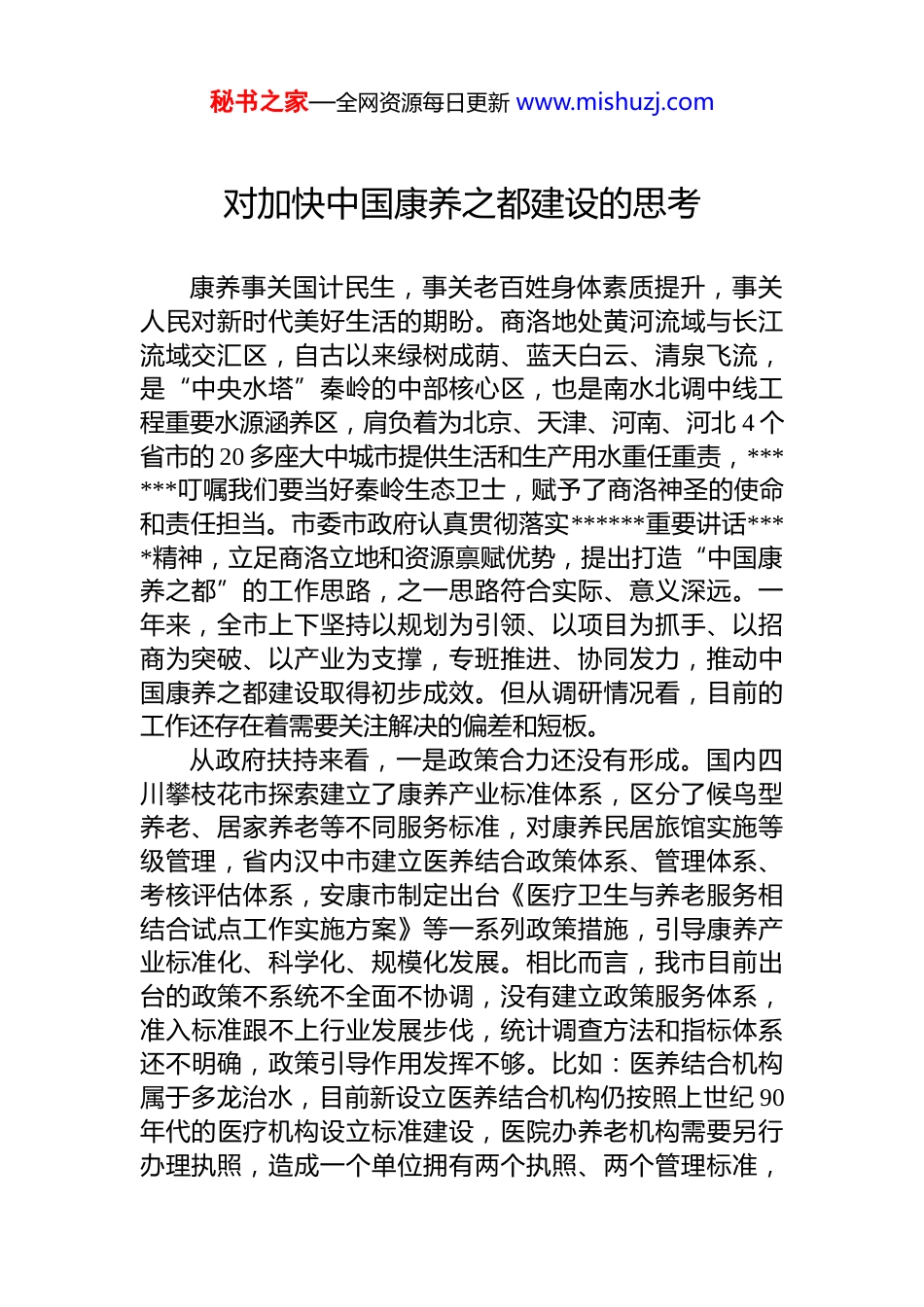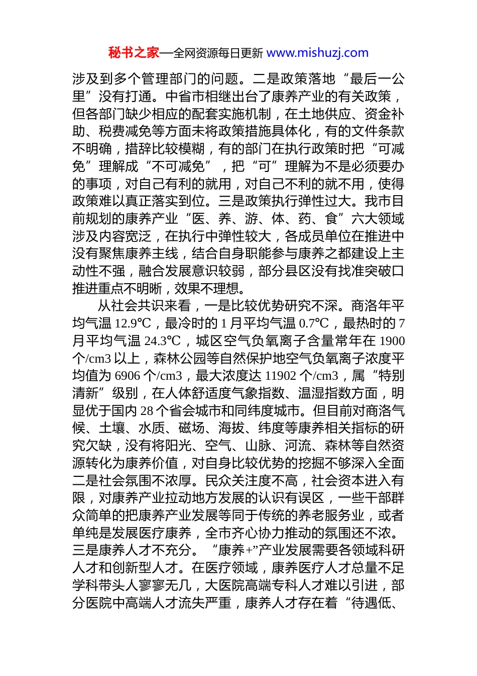 秘书之家—全网资源每日更新 www.mishuzj.com对加快中国康养之都建设的思考康养事关国计民生,事关老百姓身体素质提升,事关人民对新时代美好生活的期盼。商洛地处黄河流域与长江流域交汇区,自古以来绿树成荫、蓝天白云、清泉飞流,是“中央水塔”秦岭的中部核心区,也是南水北调中线工程重要水源涵养区,肩负着为北京、天津、河南、河北 4 个省市的 20 多座大中城市提供生活和生产用水重任重责,******叮嘱我们要当好秦岭生态卫士,赋予了商洛神圣的使命和责任担当。市委市政府认真贯彻落实******重要讲话****精神,立足商洛立地和资源禀赋优势,提出打造“中国康养之都”的工作思路,之一思路符合实际、意义深远。一年来,全市上下坚持以规划为引领、以项目为抓手、以招商为突破、以产业为支撑,专班推进、协同发力,推动中国康养之都建设取得初步成效。但从调研情况看,目前的工作还存在着需要关注解决的偏差和短板。从政府扶持来看,一是政策合力还没有形成。国内四川攀枝花市探索建立了康养产业标准体系,区分了候鸟型养老、居家养老等不同服务标准,对康养民居旅馆实施等级管理,省内汉中市建立医养结合政策体系、管理体系、考核评估体系,安康市制定出台《医疗卫生与养老服务相结合试点工作实施方案》等一系列政策措施,引导康养产业标准化、科学化、规模化发展。相比而言,我市目前出台的政策不系统不全面不协调,没有建立政策服务体系,准入标准跟不上行业发展步伐,统计调查方法和指标体系还不明确,政策引导作用发挥不够。比如:医养结合机构属于多龙治水,目前新设立医养结合机构仍按照上世纪 90年代的医疗机构设立标准建设,医院办养老机构需要另行办理执照,造成一个单位拥有两个执照、两个管理标准,秘书之家—全网资源每日更新 www.mishuzj.com涉及到多个管理部门的问题。二是政策落地“最后一公里”没有打通。中省市相继出台了康养产业的有关政策,但各部门缺少相应的配套实施机制,在土地供应、资金补助、税费减免等方面未将政策措施具体化,有的文件条款不明确,措辞比较模糊,有的部门在执行政策时把“可减免”理解成“不可减免”,把“可”理解为不是必须要办的事项,对自己有利的就用,对自己不利的就不用,使得政策难以真正落实到位。三是政策执行弹性过大。我市目前规划的康养产业“医、养、游、体、药、食”六大领域涉及内容宽泛,在执行中弹性较大,各成员单位在推进中没有聚焦康养主线,结合自身职能参与康养之都建设上主动性不强,融合发展意识较弱,部分县区没有找准突破口推进重点不明晰,效果不理想。从社会共识来看,一是比较优势研究不深。商洛年平均气温 12.9℃,最冷时的 1 月平均气温 0.7℃,最热时的 7月平均气温 24.3℃,城区空气负氧离子含量常年在 1900个/cm3 以上,森林公园等自然保护地空气负氧离子浓度平均值为 6906 个/cm3,最大浓度达 11902 个/cm3,属“特别清新”级别,在人体舒适度气象指数、温湿指数方面,明显优于国内 28 个省会城市和同纬度城市。但目前对商洛气候、土壤、水质、磁场、海拔、纬度等康养相关指标的研究欠缺,没有将阳光、空气、山脉、河流、森林等自然资源转化为康养价值,对自身比较优势的挖掘不够深入全面二是社会氛围不浓厚。民众关注度不高,社会资本进入有限,对康养产业拉动地方发展的认识有误区,一些干部群众简单的把康养产业发展等同于传统的养老服务业,或者单纯是发展医疗康养,全市齐心协力推动的氛围还不浓。三是康养人才不充分。“康养+”产业发展需要各领域科研人才和创新型人才。在医疗领域,康养医疗人才总量不足学科带头人寥寥无几,大医院高端专科人才难以引进,部分医院中高端人才流失严重,康养人才存在着“待遇低、秘书之家—全网资源每日更新 www.mishuzj.com引不进、留不住、做不好”等问题。从市场反馈来看,一是产品供给不足。目前许多企业纷纷跨界入局,没有规划,紧跟“流行”,全靠“抄袭”大部分康养产业还处于初级阶段,在一定程度存在一哄而上、同质化等问题,影响和制约着康养产业健康发展。比如,在健康医疗方面,全市近 3000 家医疗机构中,三级...