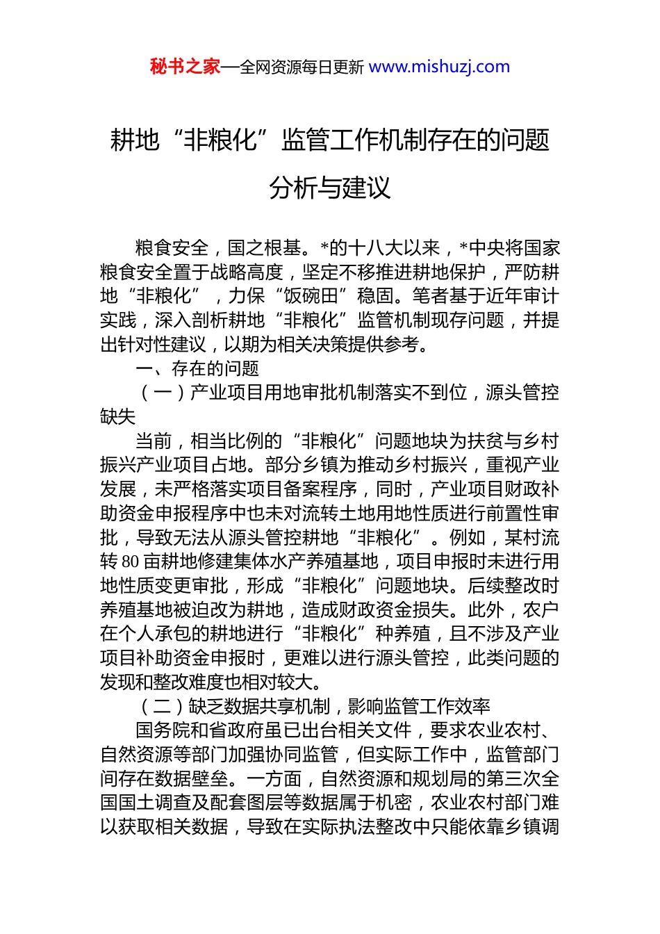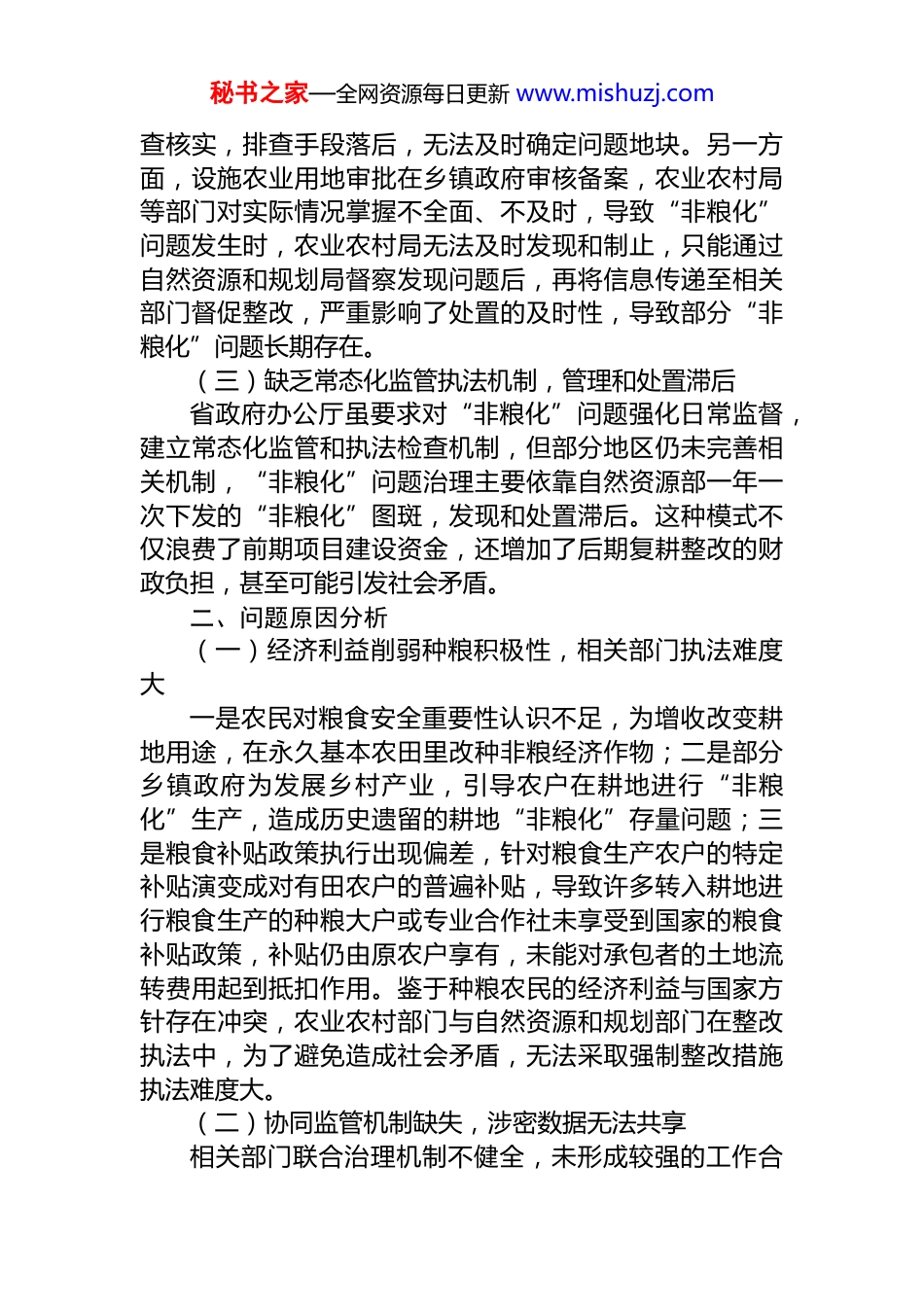 秘书之家—全网资源每日更新 www.mishuzj.com耕地“非粮化”监管工作机制存在的问题分析与建议粮食安全,国之根基。*的十八大以来,*中央将国家粮食安全置于战略高度,坚定不移推进耕地保护,严防耕地“非粮化”,力保“饭碗田”稳固。笔者基于近年审计实践,深入剖析耕地“非粮化”监管机制现存问题,并提出针对性建议,以期为相关决策提供参考。一、存在的问题(一)产业项目用地审批机制落实不到位,源头管控缺失当前,相当比例的“非粮化”问题地块为扶贫与乡村振兴产业项目占地。部分乡镇为推动乡村振兴,重视产业发展,未严格落实项目备案程序,同时,产业项目财政补助资金申报程序中也未对流转土地用地性质进行前置性审批,导致无法从源头管控耕地“非粮化”。例如,某村流转 80 亩耕地修建集体水产养殖基地,项目申报时未进行用地性质变更审批,形成“非粮化”问题地块。后续整改时养殖基地被迫改为耕地,造成财政资金损失。此外,农户在个人承包的耕地进行“非粮化”种养殖,且不涉及产业项目补助资金申报时,更难以进行源头管控,此类问题的发现和整改难度也相对较大。(二)缺乏数据共享机制,影响监管工作效率国务院和省政府虽已出台相关文件,要求农业农村、自然资源等部门加强协同监管,但实际工作中,监管部门间存在数据壁垒。一方面,自然资源和规划局的第三次全国国土调查及配套图层等数据属于机密,农业农村部门难以获取相关数据,导致在实际执法整改中只能依靠乡镇调秘书之家—全网资源每日更新 www.mishuzj.com查核实,排查手段落后,无法及时确定问题地块。另一方面,设施农业用地审批在乡镇政府审核备案,农业农村局等部门对实际情况掌握不全面、不及时,导致“非粮化”问题发生时,农业农村局无法及时发现和制止,只能通过自然资源和规划局督察发现问题后,再将信息传递至相关部门督促整改,严重影响了处置的及时性,导致部分“非粮化”问题长期存在。(三)缺乏常态化监管执法机制,管理和处置滞后省政府办公厅虽要求对“非粮化”问题强化日常监督,建立常态化监管和执法检查机制,但部分地区仍未完善相关机制,“非粮化”问题治理主要依靠自然资源部一年一次下发的“非粮化”图斑,发现和处置滞后。这种模式不仅浪费了前期项目建设资金,还增加了后期复耕整改的财政负担,甚至可能引发社会矛盾。二、问题原因分析(一)经济利益削弱种粮积极性,相关部门执法难度大一是农民对粮食安全重要性认识不足,为增收改变耕地用途,在永久基本农田里改种非粮经济作物;二是部分乡镇政府为发展乡村产业,引导农户在耕地进行“非粮化”生产,造成历史遗留的耕地“非粮化”存量问题;三是粮食补贴政策执行出现偏差,针对粮食生产农户的特定补贴演变成对有田农户的普遍补贴,导致许多转入耕地进行粮食生产的种粮大户或专业合作社未享受到国家的粮食补贴政策,补贴仍由原农户享有,未能对承包者的土地流转费用起到抵扣作用。鉴于种粮农民的经济利益与国家方针存在冲突,农业农村部门与自然资源和规划部门在整改执法中,为了避免造成社会矛盾,无法采取强制整改措施执法难度大。(二)协同监管机制缺失,涉密数据无法共享相关部门联合治理机制不健全,未形成较强的工作合秘书之家—全网资源每日更新 www.mishuzj.com力,导致耕地保护存在漏洞和风险。自然资源和规划局的相关耕地数据信息涉密,且与农业农村局等部门之间缺乏耕地“非粮化”信息共享机制,农业农村局等部门现有数据资源不能有效满足自身业务需要。同时,工作情况通报机制、联席会议制度和协同监管执法工作机制不完善,导致耕地“非粮化”问题发现和处理不及时。三、意见建议(一)强化政策宣传,精准落实种粮补贴扶持组织开展耕地“非粮化”相关政策法规学习,提高相关部门政策执行能力水平。深入镇村开展宣传教育工作,通过播放宣传片、举办现场宣讲会、分发宣传册等形式,宣传农村耕地相关政策,提高农村基层干部以及广大农户的耕地保护意识。建议财政部门完善种粮补贴政策,以“谁种粮,谁受益”为原则,确保补贴发放至种粮主体,提高农民和种粮大户的种粮积极性。(二)健全土地流转程序,做好耕...