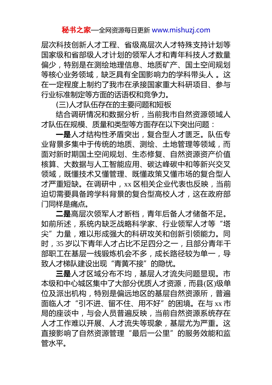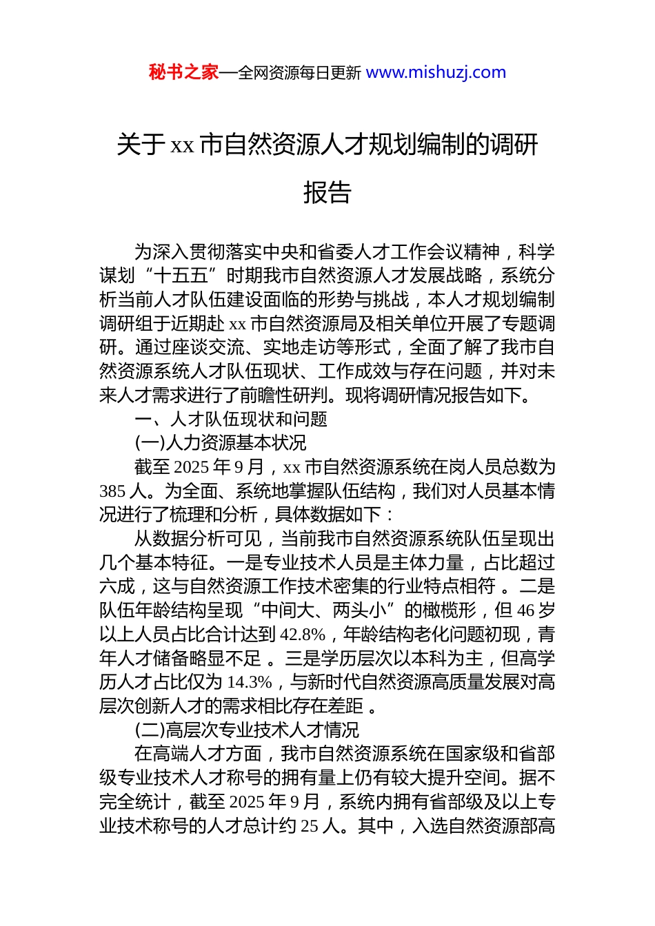 秘书之家—全网资源每日更新 www.mishuzj.com关于 xx 市自然资源人才规划编制的调研报告为深入贯彻落实中央和省委人才工作会议精神,科学谋划“十五五”时期我市自然资源人才发展战略,系统分析当前人才队伍建设面临的形势与挑战,本人才规划编制调研组于近期赴 xx 市自然资源局及相关单位开展了专题调研。通过座谈交流、实地走访等形式,全面了解了我市自然资源系统人才队伍现状、工作成效与存在问题,并对未来人才需求进行了前瞻性研判。现将调研情况报告如下。一、人才队伍现状和问题(一)人力资源基本状况截至 2025 年 9 月,xx 市自然资源系统在岗人员总数为385 人。为全面、系统地掌握队伍结构,我们对人员基本情况进行了梳理和分析,具体数据如下:从数据分析可见,当前我市自然资源系统队伍呈现出几个基本特征。一是专业技术人员是主体力量,占比超过六成,这与自然资源工作技术密集的行业特点相符 。二是队伍年龄结构呈现“中间大、两头小”的橄榄形,但 46 岁以上人员占比合计达到 42.8%,年龄结构老化问题初现,青年人才储备略显不足 。三是学历层次以本科为主,但高学历人才占比仅为 14.3%,与新时代自然资源高质量发展对高层次创新人才的需求相比存在差距 。(二)高层次专业技术人才情况在高端人才方面,我市自然资源系统在国家级和省部级专业技术人才称号的拥有量上仍有较大提升空间。据不完全统计,截至 2025 年 9 月,系统内拥有省部级及以上专业技术称号的人才总计约 25 人。其中,入选自然资源部高秘书之家—全网资源每日更新 www.mishuzj.com层次科技创新人才工程、省级高层次人才特殊支持计划等国家级和省部级人才计划的领军人才和青年科技人才数量偏少,特别是在测绘地理信息、地质矿产、国土空间规划等核心业务领域,缺乏具有全国影响力的学科带头人 。这在一定程度上制约了我市在承接国家重大科研项目、参与行业标准制定等方面的话语权和竞争力。(三)人才队伍存在的主要问题和短板结合调研情况和数据分析,当前我市自然资源领域人才队伍在规模、质量和类型等方面存在以下突出问题:一是人才结构性矛盾突出,复合型人才匮乏。队伍专业背景多集中于传统的地质、测绘、土地管理等领域,而面对新时期国土空间规划、生态修复、自然资源资产价值核算、大数据与人工智能应用、碳达峰碳中和等新兴交叉领域,既懂技术又懂管理、既懂政策又懂市场的复合型人才严重短缺。在调研中,xx 区相关企业代表也反映,当前迫切需要具备跨学科背景的复合型高校人才,这在政府部门同样是痛点。二是高层次领军人才断档,青年后备人才储备不足。如前所述,系统内缺乏战略科学家、行业领军人才等“塔尖”力量,难以形成强大的科研攻关和创新引领能力。同时,35 岁以下青年人才占比不足四分之一,且部分青年干部职工在基层一线锻炼机会不多,成长路径较为单一,导致人才梯队建设出现“青黄不接”的隐忧。三是人才区域分布不均,基层人才流失问题显现。市本级和中心城区集中了大部分优质人才资源,而县(区)级单位及派出机构,特别是偏远地区的基层自然资源所,普遍面临人才“引不进、留不住、用不好”的困境。在与 xx 市局的座谈中,与会人员普遍反映,当前自然资源系统存在人才工作难以开展、人才流失等现象,基层尤为严重。这直接影响了自然资源管理“最后一公里”的服务效能和监管水平。秘书之家—全网资源每日更新 www.mishuzj.com二、人才工作创新做法和存在问题(一)人才工作主要做法和成效自 2018 年自然资源部门组建以来,xx 市自然资源局*组高度重视人才工作,将其纳入单位中心工作,积极探索创新,取得了一系列积极成效。一是不断完善*管人才工作格局。局*组坚决贯彻*管人才原则,将人才工作纳入重要议事日程和年度工作要点,定期召开会议专题研究人才工作,形成了*组统一领导,组织人事部门牵头抓总,相关业务科室和下属单位协同配合的人才工作新格局。通过强化 dj 引领,加强单位文化建设营造了尊重人才、见贤思齐的良好工作氛围。二是创新搭建人才培养和实践载体。一方面,积极“走出去”,与 xx 大学、省内重点科研院所建立战略合作...