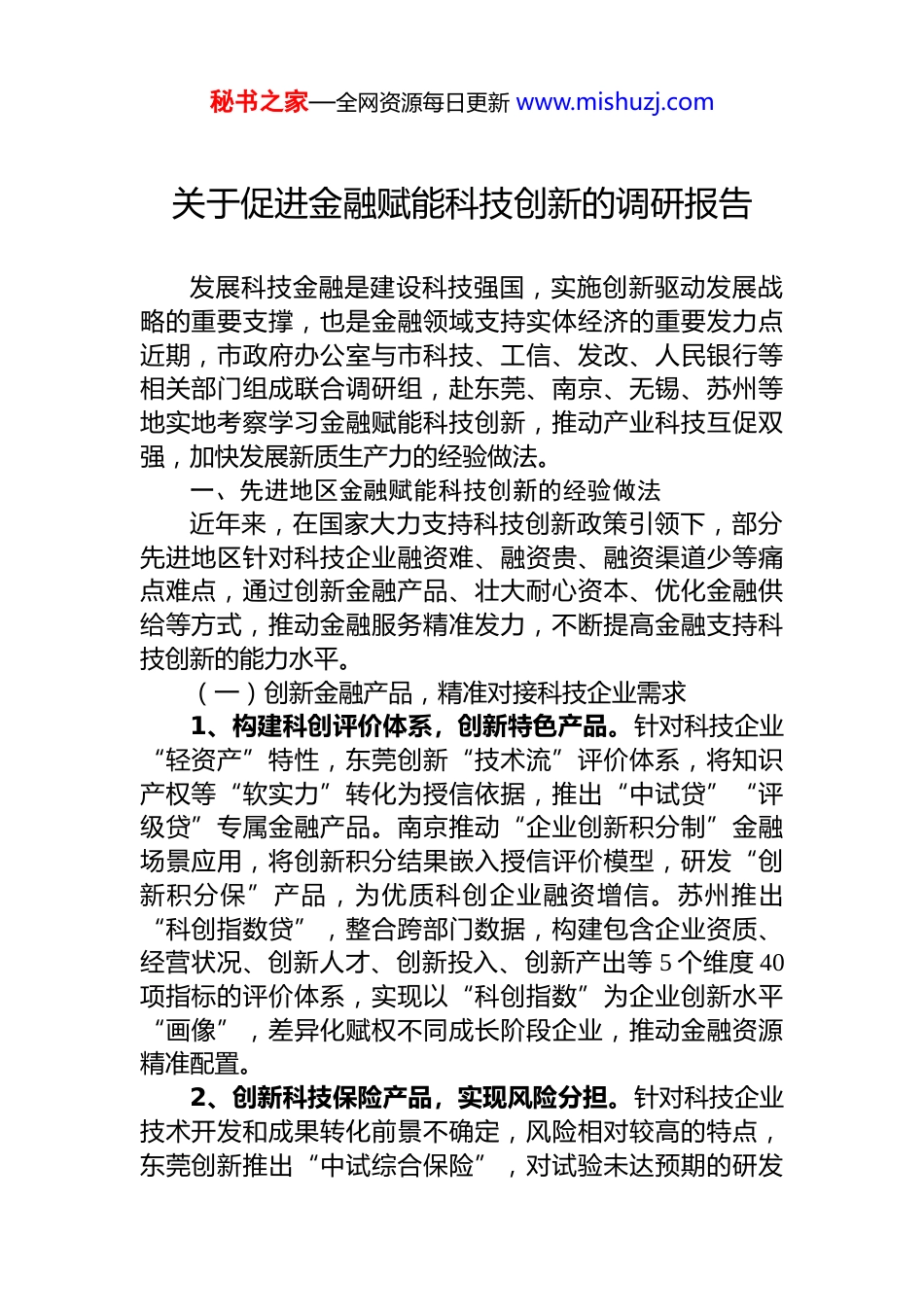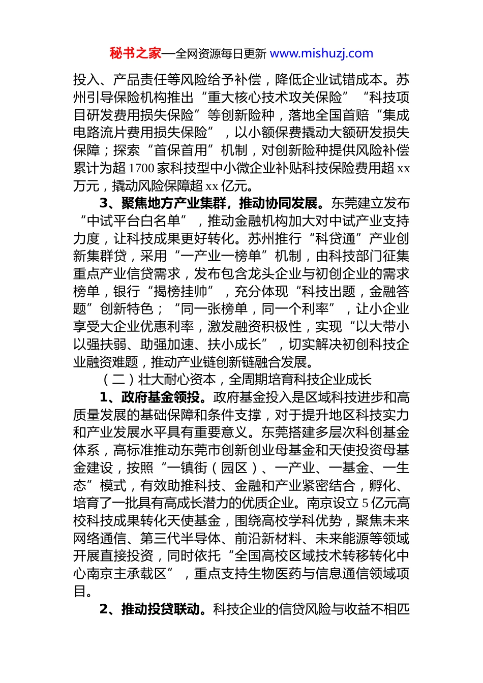 秘书之家—全网资源每日更新 www.mishuzj.com关于促进金融赋能科技创新的调研报告发展科技金融是建设科技强国,实施创新驱动发展战略的重要支撑,也是金融领域支持实体经济的重要发力点近期,市政府办公室与市科技、工信、发改、人民银行等相关部门组成联合调研组,赴东莞、南京、无锡、苏州等地实地考察学习金融赋能科技创新,推动产业科技互促双强,加快发展新质生产力的经验做法。一、先进地区金融赋能科技创新的经验做法近年来,在国家大力支持科技创新政策引领下,部分先进地区针对科技企业融资难、融资贵、融资渠道少等痛点难点,通过创新金融产品、壮大耐心资本、优化金融供给等方式,推动金融服务精准发力,不断提高金融支持科技创新的能力水平。(一)创新金融产品,精准对接科技企业需求1、构建科创评价体系,创新特色产品。针对科技企业“轻资产”特性,东莞创新“技术流”评价体系,将知识产权等“软实力”转化为授信依据,推出“中试贷”“评级贷”专属金融产品。南京推动“企业创新积分制”金融场景应用,将创新积分结果嵌入授信评价模型,研发“创新积分保”产品,为优质科创企业融资增信。苏州推出“科创指数贷”,整合跨部门数据,构建包含企业资质、经营状况、创新人才、创新投入、创新产出等 5 个维度 40项指标的评价体系,实现以“科创指数”为企业创新水平“画像”,差异化赋权不同成长阶段企业,推动金融资源精准配置。2、创新科技保险产品,实现风险分担。针对科技企业技术开发和成果转化前景不确定,风险相对较高的特点,东莞创新推出“中试综合保险”,对试验未达预期的研发秘书之家—全网资源每日更新 www.mishuzj.com投入、产品责任等风险给予补偿,降低企业试错成本。苏州引导保险机构推出“重大核心技术攻关保险”“科技项目研发费用损失保险”等创新险种,落地全国首赔“集成电路流片费用损失保险”,以小额保费撬动大额研发损失保障;探索“首保首用”机制,对创新险种提供风险补偿累计为超 1700 家科技型中小微企业补贴科技保险费用超 xx万元,撬动风险保障超 xx 亿元。3、聚焦地方产业集群,推动协同发展。东莞建立发布“中试平台白名单”,推动金融机构加大对中试产业支持力度,让科技成果更好转化。苏州推行“科贷通”产业创新集群贷,采用“一产业一榜单”机制,由科技部门征集重点产业信贷需求,发布包含龙头企业与初创企业的需求榜单,银行“揭榜挂帅”,充分体现“科技出题,金融答题”创新特色;“同一张榜单,同一个利率”,让小企业享受大企业优惠利率,激发融资积极性,实现“以大带小以强扶弱、助强加速、扶小成长”,切实解决初创科技企业融资难题,推动产业链创新链融合发展。(二)壮大耐心资本,全周期培育科技企业成长1、政府基金领投。政府基金投入是区域科技进步和高质量发展的基础保障和条件支撑,对于提升地区科技实力和产业发展水平具有重要意义。东莞搭建多层次科创基金体系,高标准推动东莞市创新创业母基金和天使投资母基金建设,按照“一镇街(园区)、一产业、一基金、一生态”模式,有效助推科技、金融和产业紧密结合,孵化、培育了一批具有高成长潜力的优质企业。南京设立 5 亿元高校科技成果转化天使基金,围绕高校学科优势,聚焦未来网络通信、第三代半导体、前沿新材料、未来能源等领域开展直接投资,同时依托“全国高校区域技术转移转化中心南京主承载区”,重点支持生物医药与信息通信领域项目。2、推动投贷联动。科技企业的信贷风险与收益不相匹秘书之家—全网资源每日更新 www.mishuzj.com配,“投贷联动”就是对科创企业提供“贷款+入股”的一种综合金融服务,可以实现投资收益抵补信贷风险。东莞统筹不同类型金融机构组建多支“股贷担保租”联动服务队,推动创新投贷联动、贷担联动、贷保联动、贷租联动等产品与服务组合,为科技型企业提供多元化、全方位、接力式金融支撑的综合服务。为有效解决“轻资产抵押难”等难题,苏州围绕关键的首贷、信用贷、无还本续贷转贷四项业务,在全国创新推出“四贷联动”机制,匹配企业不同阶段融资需求,多方联动,为科创、民营、中小微企业提供金融服务。3...