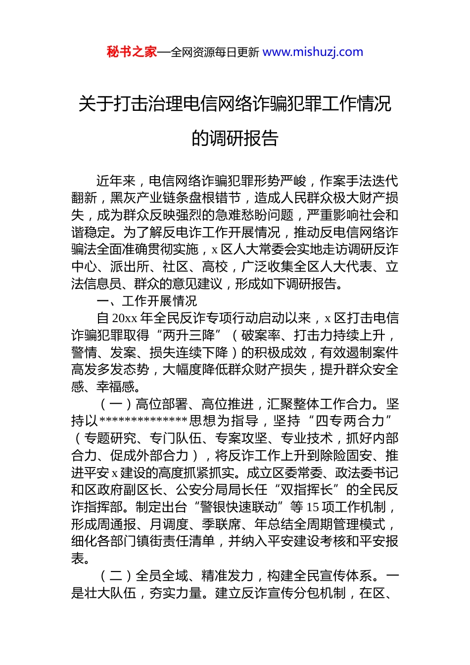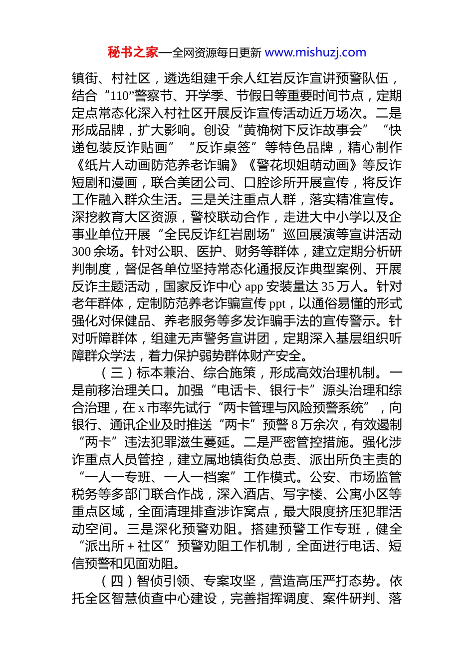 秘书之家—全网资源每日更新 www.mishuzj.com关于打击治理电信网络诈骗犯罪工作情况的调研报告近年来,电信网络诈骗犯罪形势严峻,作案手法迭代翻新,黑灰产业链条盘根错节,造成人民群众极大财产损失,成为群众反映强烈的急难愁盼问题,严重影响社会和谐稳定。为了解反电诈工作开展情况,推动反电信网络诈骗法全面准确贯彻实施,x 区人大常委会实地走访调研反诈中心、派出所、社区、高校,广泛收集全区人大代表、立法信息员、群众的意见建议,形成如下调研报告。一、工作开展情况自 20xx 年全民反诈专项行动启动以来,x 区打击电信诈骗犯罪取得“两升三降”(破案率、打击力持续上升,警情、发案、损失连续下降)的积极成效,有效遏制案件高发多发态势,大幅度降低群众财产损失,提升群众安全感、幸福感。(一)高位部署、高位推进,汇聚整体工作合力。坚持以**************思想为指导,坚持“四专两合力”(专题研究、专门队伍、专案攻坚、专业技术,抓好内部合力、促成外部合力),将反诈工作上升到除险固安、推进平安 x 建设的高度抓紧抓实。成立区委常委、政法委书记和区政府副区长、公安分局局长任“双指挥长”的全民反诈指挥部。制定出台“警银快速联动”等 15 项工作机制,形成周通报、月调度、季联席、年总结全周期管理模式,细化各部门镇街责任清单,并纳入平安建设考核和平安报表。(二)全员全域、精准发力,构建全民宣传体系。一是壮大队伍,夯实力量。建立反诈宣传分包机制,在区、秘书之家—全网资源每日更新 www.mishuzj.com镇街、村社区,遴选组建千余人红岩反诈宣讲预警队伍,结合“110”警察节、开学季、节假日等重要时间节点,定期定点常态化深入村社区开展反诈宣传活动近万场次。二是形成品牌,扩大影响。创设“黄桷树下反诈故事会”“快递包装反诈贴画”“反诈桌签”等特色品牌,精心制作《纸片人动画防范养老诈骗》《警花坝姐萌动画》等反诈短剧和漫画,联合美团公司、口腔诊所开展宣传,将反诈工作融入群众生活。三是关注重点人群,落实精准宣传。深挖教育大区资源,警校联动合作,走进大中小学以及企事业单位开展“全民反诈红岩剧场”巡回展演等宣讲活动300 余场。针对公职、医护、财务等群体,建立定期分析研判制度,督促各单位坚持常态化通报反诈典型案例、开展反诈主题活动,国家反诈中心 app 安装量达 35 万人。针对老年群体,定制防范养老诈骗宣传 ppt,以通俗易懂的形式强化对保健品、养老服务等多发诈骗手法的宣传警示。针对听障群体,组建无声警务宣讲团,定期深入基层组织听障群众学法,着力保护弱势群体财产安全。(三)标本兼治、综合施策,形成高效治理机制。一是前移治理关口。加强“电话卡、银行卡”源头治理和综合治理,在 x 市率先试行“两卡管理与风险预警系统”,向银行、通讯企业及时推送“两卡”预警 8 万余次,有效遏制“两卡”违法犯罪滋生蔓延。二是严密管控措施。强化涉诈重点人员管控,建立属地镇街负总责、派出所负主责的“一人一专班、一人一档案”工作模式。公安、市场监管税务等多部门联合作战,深入酒店、写字楼、公寓小区等重点区域,全面清理排查涉诈窝点,最大限度挤压犯罪活动空间。三是深化预警劝阻。搭建预警工作专班,健全“派出所+社区”预警劝阻工作机制,全面进行电话、短信预警和见面劝阻。(四)智侦引领、专案攻坚,营造高压严打态势。依托全区智慧侦查中心建设,完善指挥调度、案件研判、落秘书之家—全网资源每日更新 www.mishuzj.com地行动等机制流程。建立警银、警通联动协同工作机制,制订《涉诈线索反馈移交工作规范》,常态化组织各银行和四家运营商开展专题研究。开展“跨境打击”“断卡”“断流”“拔钉”等专项行动,运用科技信息化手段,快侦快破全市首例诈骗境外人士及虚拟货币洗钱案等典型案件,破获最高检、公安部双督办“5.11”电信网络诈骗专案,抓获犯罪嫌疑人 154 名,冻结涉诈资金 1300 余万。二、存在的主要问题经过三年的全民反诈专项行动,x 区的打击治理电信网络诈骗工作取得了积极成效,群众的满意度、获得感、安全感明显提升。通过梳理分析,也发现了当...