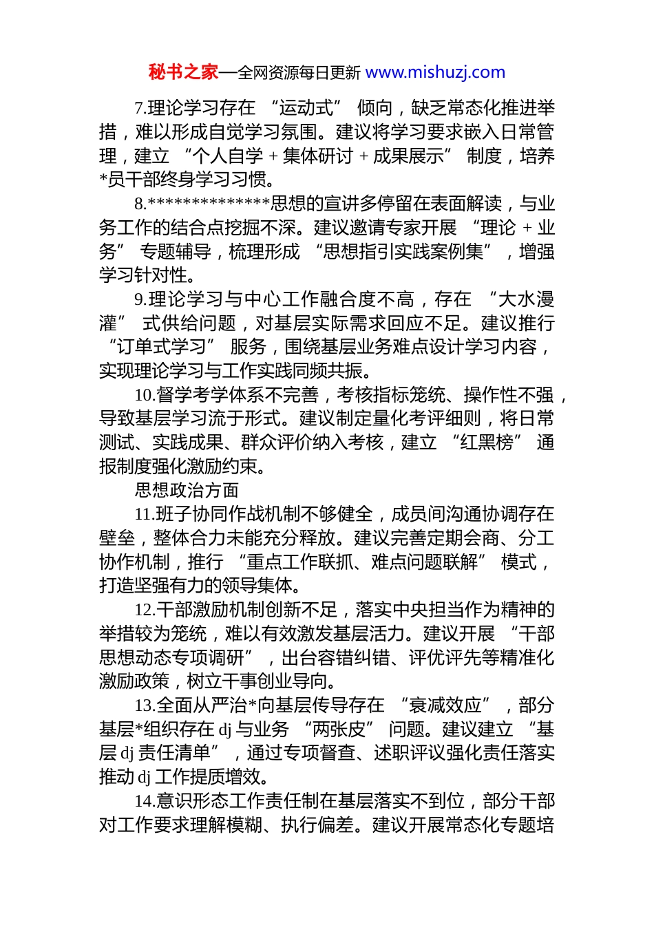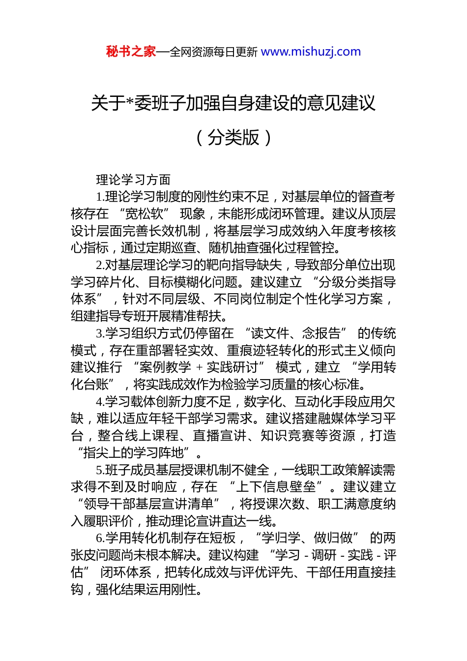 秘书之家—全网资源每日更新 www.mishuzj.com关于*委班子加强自身建设的意见建议(分类版)理论学习方面1.理论学习制度的刚性约束不足,对基层单位的督查考核存在 “宽松软” 现象,未能形成闭环管理。建议从顶层设计层面完善长效机制,将基层学习成效纳入年度考核核心指标,通过定期巡查、随机抽查强化过程管控。2.对基层理论学习的靶向指导缺失,导致部分单位出现学习碎片化、目标模糊化问题。建议建立 “分级分类指导体系”,针对不同层级、不同岗位制定个性化学习方案,组建指导专班开展精准帮扶。3.学习组织方式仍停留在 “读文件、念报告” 的传统模式,存在重部署轻实效、重痕迹轻转化的形式主义倾向建议推行 “案例教学 + 实践研讨” 模式,建立 “学用转化台账”,将实践成效作为检验学习质量的核心标准。4.学习载体创新力度不足,数字化、互动化手段应用欠缺,难以适应年轻干部学习需求。建议搭建融媒体学习平台,整合线上课程、直播宣讲、知识竞赛等资源,打造“指尖上的学习阵地”。5.班子成员基层授课机制不健全,一线职工政策解读需求得不到及时响应,存在 “上下信息壁垒”。建议建立“领导干部基层宣讲清单”,将授课次数、职工满意度纳入履职评价,推动理论宣讲直达一线。6.学用转化机制存在短板,“学归学、做归做” 的两张皮问题尚未根本解决。建议构建 “学习 - 调研 - 实践 - 评估” 闭环体系,把转化成效与评优评先、干部任用直接挂钩,强化结果运用刚性。秘书之家—全网资源每日更新 www.mishuzj.com7.理论学习存在 “运动式” 倾向,缺乏常态化推进举措,难以形成自觉学习氛围。建议将学习要求嵌入日常管理,建立 “个人自学 + 集体研讨 + 成果展示” 制度,培养*员干部终身学习习惯。8.**************思想的宣讲多停留在表面解读,与业务工作的结合点挖掘不深。建议邀请专家开展 “理论 + 业务” 专题辅导,梳理形成 “思想指引实践案例集”,增强学习针对性。9.理论学习与中心工作融合度不高,存在 “大水漫灌” 式供给问题,对基层实际需求回应不足。建议推行“订单式学习” 服务,围绕基层业务难点设计学习内容,实现理论学习与工作实践同频共振。10.督学考学体系不完善,考核指标笼统、操作性不强,导致基层学习流于形式。建议制定量化考评细则,将日常测试、实践成果、群众评价纳入考核,建立 “红黑榜” 通报制度强化激励约束。思想政治方面11.班子协同作战机制不够健全,成员间沟通协调存在壁垒,整体合力未能充分释放。建议完善定期会商、分工协作机制,推行 “重点工作联抓、难点问题联解” 模式,打造坚强有力的领导集体。12.干部激励机制创新不足,落实中央担当作为精神的举措较为笼统,难以有效激发基层活力。建议开展 “干部思想动态专项调研”,出台容错纠错、评优评先等精准化激励政策,树立干事创业导向。13.全面从严治*向基层传导存在 “衰减效应”,部分基层*组织存在 dj 与业务 “两张皮” 问题。建议建立 “基层 dj 责任清单”,通过专项督查、述职评议强化责任落实推动 dj 工作提质增效。14.意识形态工作责任制在基层落实不到位,部分干部对工作要求理解模糊、执行偏差。建议开展常态化专题培秘书之家—全网资源每日更新 www.mishuzj.com训,编制 “意识形态工作操作手册”,通过案例教学明晰工作边界与方法。15.改革推进过程中对基层指导缺位,存在 “只定目标、不给路径” 现象,导致部分单位陷入 “盲目摸索”。建议建立 “改革指导员” 制度,班子成员分片联系基层,实时提供政策解读与实操指导。16.基层班子建设统筹规划不足,年龄、专业结构搭配不合理,影响决策执行力。建议建立 “基层班子动态研判机制”,结合工作需要开展轮岗交流,优化班子整体功能。17.乡村振兴工作中存在形式主义倾向,重台账完善轻实际成效,帮扶措施精准度不足。建议推行 “清单化帮扶+ 实效化评估” 模式,将群众满意度作为核心考核指标,推动工作重心下沉。18.中央决策部署落地存在 “层级温差”,政策红利未能充分直达基层市场主体。建议建立 “政策落实跟踪问效机制”,打通...