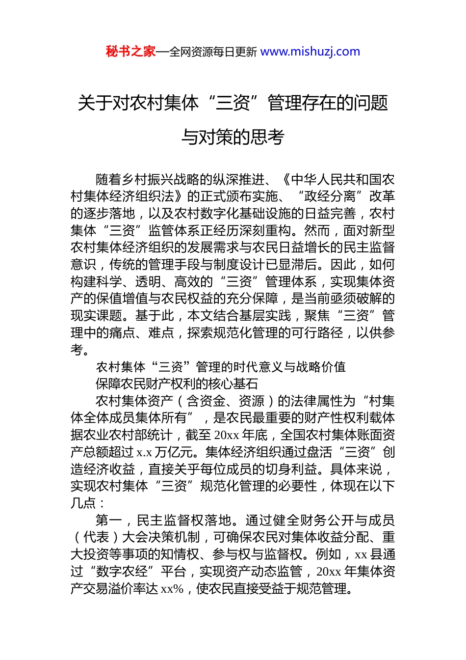 秘书之家—全网资源每日更新 www.mishuzj.com关于对农村集体“三资”管理存在的问题与对策的思考随着乡村振兴战略的纵深推进、《中华人民共和国农村集体经济组织法》的正式颁布实施、“政经分离”改革的逐步落地,以及农村数字化基础设施的日益完善,农村集体“三资”监管体系正经历深刻重构。然而,面对新型农村集体经济组织的发展需求与农民日益增长的民主监督意识,传统的管理手段与制度设计已显滞后。因此,如何构建科学、透明、高效的“三资”管理体系,实现集体资产的保值增值与农民权益的充分保障,是当前亟须破解的现实课题。基于此,本文结合基层实践,聚焦“三资”管理中的痛点、难点,探索规范化管理的可行路径,以供参考。农村集体“三资”管理的时代意义与战略价值保障农民财产权利的核心基石农村集体资产(含资金、资源)的法律属性为“村集体全体成员集体所有”,是农民最重要的财产性权利载体据农业农村部统计,截至 20xx 年底,全国农村集体账面资产总额超过 x.x 万亿元。集体经济组织通过盘活“三资”创造经济收益,直接关乎每位成员的切身利益。具体来说,实现农村集体“三资”规范化管理的必要性,体现在以下几点:第一,民主监督权落地。通过健全财务公开与成员(代表)大会决策机制,可确保农民对集体收益分配、重大投资等事项的知情权、参与权与监督权。例如,xx 县通过“数字农经”平台,实现资产动态监管,20xx 年集体资产交易溢价率达 xx%,使农民直接受益于规范管理。秘书之家—全网资源每日更新 www.mishuzj.com第二,资产保值增值制度化。建立科学的投资决策、风险评估与审计制度,可以防止因管理不善导致的资产流失;通过定期资产清查与市场化运营,可以避免资源闲置浪费。第三,收益分配公平化。通过明确提取公积金、公益金比例与成员分红规则,可避免因分配不公引发的矛盾。例如,xx 部分村庄通过制订量化分配方案,实现了收益分配透明化。保护基层干部的“制度铠甲”乡村振兴要求基层部门积极盘活资源、发展产业。然而,由于缺乏规范约束的权力,易滋生风险。实现农村集体“三资”规范化管理的作用,主要表现为以下几点:第一,提供操作标尺。明确资金审批权限(如单笔支出分级审批)、资产处置流程(如评估、公开竞价)、资源发包规则(如最短年限、价格调整机制),可以压缩基层部门自由裁量的空间。例如,xx 市推行“村务卡”非现金结算,使每笔资金流向可追溯,干部廉政投诉率下降 xx%。第二,预防履职风险。通过流程留痕(如“四议两公开”全程记录)与第三方监督(如引入会计师事务所审计),可以为干部提供履职合规证明,避免“好心办坏事”引发的违纪风险。巩固基层政权的信任根基“三资”管理乱象是激化干群矛盾的主要诱因。中纪委数据显示,在 20xx—20xx 年查处的农村基层腐败案件中,涉及“三资”问题的占比超过 xx%。具体来说,实现农村集体“三资”规范化管理的效能主要表现为以下几点:第一,遏制“微腐败”。通过堵塞白条抵账、坐收坐支、低价发包等漏洞,可从源头上减少权力寻租空间。例如,xx 市建立“阳光村务”平台后,涉“三资”信访量下降 xx%。第二,重建公信力。通过“线上+线下”双公开(如秘书之家—全网资源每日更新 www.mishuzj.com“微信小程序+村务栏”),可确保财务数据实时可查,化解群众疑虑。同时,透明化管理有助于增强农民对基层政权的信任,夯实乡村治理基础。维护国家财经纪律严肃性惠农资金(如产业扶持、高标准农田补贴等)的精准落地,高度依赖健全的财务监管。审计署 20xx 年报告指出,我国有 xx 个省存在涉农资金挤占挪用或虚报套取问题,涉及金额 x.x 亿元。具体来说,实现农村集体“三资”规范化管理的核心作用主要有以下几点:第一,专款专用闭环管理。通过建立项目资金专用账户与独立核算制度,配合 gps 定位、图像识别等技术验证项目真实性,可确保资金流向可追溯。第二,穿透式审计监督。推行“村账乡管”升级版,由县级农业农村部门直接监管乡镇代理中心,定期交叉审计,可强化对基层财务的垂直监督。农村集体“三资”管理的深层次问题剖析1.1 财务管理失范:制...