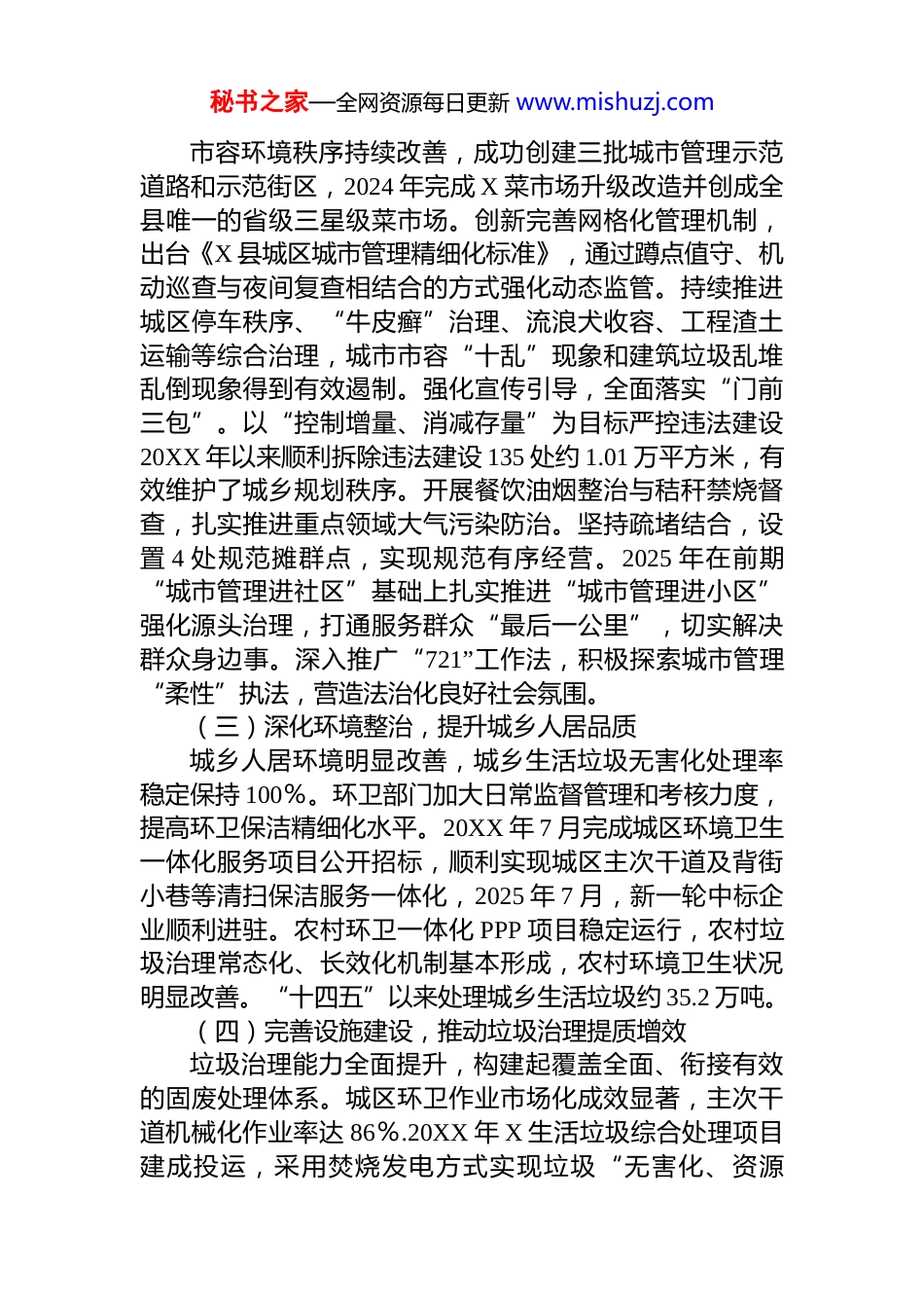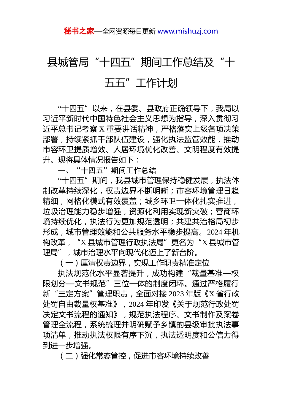 秘书之家—全网资源每日更新 www.mishuzj.com县城管局“十四五”期间工作总结及“十五五”工作计划“十四五”以来,在县委、县政府正确领导下,我局以习近平新时代中国特色社会主义思想为指导,深入贯彻习近平总书记考察 X 重要讲话精神,严格落实上级各项决策部署,持续紧抓干部队伍建设,强化执法监管效能,推动市容环卫提质增效、人居环境优化改善、文明程度有效提升。现将具体情况报告如下:一、“十四五”期间工作总结“十四五”期间,我县城市管理保持稳健发展,执法体制改革持续深化,权责边界不断明晰;市容环境管理日趋精细,网格化模式有效覆盖;城乡环卫一体化扎实推进,垃圾治理能力稳步增强,资源化利用实现新突破;营商环境持续优化,执法行为更加规范透明;共建共治格局初步形成,城市管理效能和公共服务水平稳步提高。2024 年机构改革,“X 县城市管理行政执法局”更名为“X 县城市管理局”,城市治理水平向现代化迈上了新台阶。(一)厘清权责边界,实现工作职责精准定位执法规范化水平显著提升,成功构建“裁量基准—权限划分—文书规范”三位一体的制度闭环。通过严格履行新“三定方案”管理职责,全面对接 2023 年版《X 省行政处罚自由裁量权基准》,2024 年印发《关于规范行政处罚决定文书流程的通知》,规范执法程序、文书制作及案卷管理全流程,系统梳理并明确赋予乡镇的县级审批执法事项清单,推动执法权限有序下沉,执法透明度和公信力得到进一步增强。(二)强化常态管控,促进市容环境持续改善秘书之家—全网资源每日更新 www.mishuzj.com市容环境秩序持续改善,成功创建三批城市管理示范道路和示范街区,2024 年完成 X 菜市场升级改造并创成全县唯一的省级三星级菜市场。创新完善网格化管理机制,出台《X 县城区城市管理精细化标准》,通过蹲点值守、机动巡查与夜间复查相结合的方式强化动态监管。持续推进城区停车秩序、“牛皮癣”治理、流浪犬收容、工程渣土运输等综合治理,城市市容“十乱”现象和建筑垃圾乱堆乱倒现象得到有效遏制。强化宣传引导,全面落实“门前三包”。以“控制增量、消减存量”为目标严控违法建设20XX 年以来顺利拆除违法建设 135 处约 1.01 万平方米,有效维护了城乡规划秩序。开展餐饮油烟整治与秸秆禁烧督查,扎实推进重点领域大气污染防治。坚持疏堵结合,设置 4 处规范摊群点,实现规范有序经营。2025 年在前期“城市管理进社区”基础上扎实推进“城市管理进小区”强化源头治理,打通服务群众“最后一公里”,切实解决群众身边事。深入推广“721”工作法,积极探索城市管理“柔性”执法,营造法治化良好社会氛围。(三)深化环境整治,提升城乡人居品质城乡人居环境明显改善,城乡生活垃圾无害化处理率稳定保持 100%。环卫部门加大日常监督管理和考核力度,提高环卫保洁精细化水平。20XX 年 7 月完成城区环境卫生一体化服务项目公开招标,顺利实现城区主次干道及背街小巷等清扫保洁服务一体化,2025 年 7 月,新一轮中标企业顺利进驻。农村环卫一体化 PPP 项目稳定运行,农村垃圾治理常态化、长效化机制基本形成,农村环境卫生状况明显改善。“十四五”以来处理城乡生活垃圾约 35.2 万吨。(四)完善设施建设,推动垃圾治理提质增效垃圾治理能力全面提升,构建起覆盖全面、衔接有效的固废处理体系。城区环卫作业市场化成效显著,主次干道机械化作业率达 86%.20XX 年 X 生活垃圾综合处理项目建成投运,采用焚烧发电方式实现垃圾“无害化、资源秘书之家—全网资源每日更新 www.mishuzj.com化”处理,年处理垃圾约 15 万吨,年发电量 5040 万千瓦时,减排成效突出。20XX 年实施县城生活垃圾填埋场垃圾开挖转运运营管理服务项目,督促中标企业严格按照规范要求安全运营,累计开挖转运垃圾约 14.7 万吨,处理渗滤液约11.9 万吨,指导环卫企业落实专人值守,全天候管护等措施,保障建筑垃圾临时处置场稳定运行,启动年处理能力 10 万吨的建筑垃圾资源化利用项目,为“无废城市”建设提供坚实支撑,推动城市绿色低碳发展。(五)优化营商环境,激发城市发展新活力营商环境持...