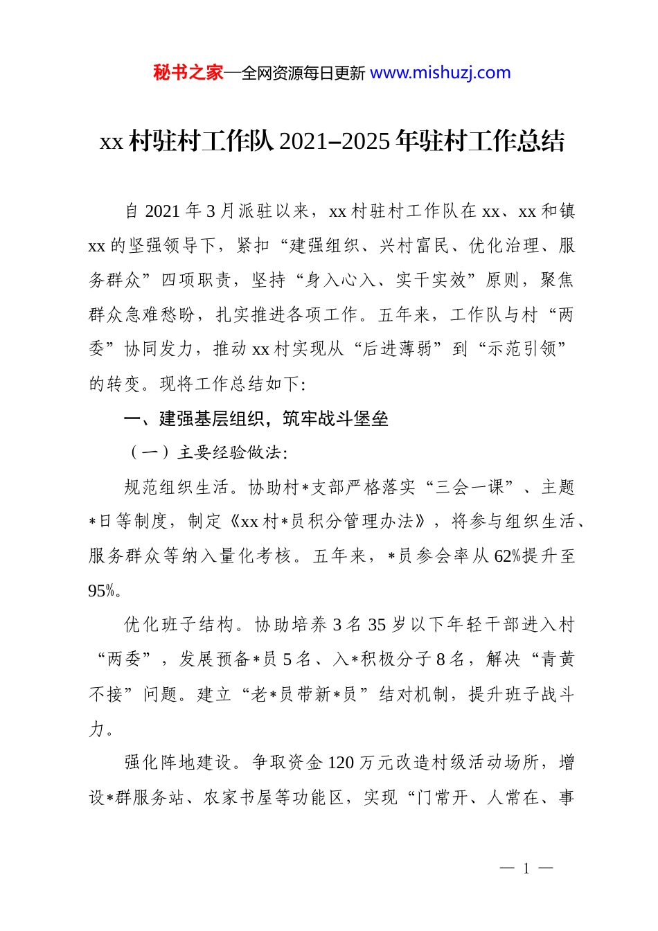 秘书之家—全网资源每日更新 www.mishuzj.comxx 村驻村工作队 2021-2025 年驻村工作总结自 2021 年 3 月派驻以来,xx 村驻村工作队在 xx、xx 和镇xx 的坚强领导下,紧扣“建强组织、兴村富民、优化治理、服务群众”四项职责,坚持“身入心入、实干实效”原则,聚焦群众急难愁盼,扎实推进各项工作。五年来,工作队与村“两委”协同发力,推动 xx 村实现从“后进薄弱”到“示范引领”的转变。现将工作总结如下:一、建强基层组织,筑牢战斗堡垒(一)主要经验做法:规范组织生活。协助村*支部严格落实“三会一课”、主题*日等制度,制定《xx 村*员积分管理办法》,将参与组织生活、服务群众等纳入量化考核。五年来,*员参会率从 62%提升至95%。优化班子结构。协助培养 3 名 35 岁以下年轻干部进入村“两委”,发展预备*员 5 名、入*积极分子 8 名,解决“青黄不接”问题。建立“老*员带新*员”结对机制,提升班子战斗力。强化阵地建设。争取资金 120 万元改造村级活动场所,增设*群服务站、农家书屋等功能区,实现“门常开、人常在、事— 1 —秘书之家—全网资源每日更新 www.mishuzj.com常办”。(二)取得的工作成效:*组织凝聚力显著增强,2023 年获评“镇先进*支部”;*员带头作用凸显,在 2022 年抗旱保苗中,32 名*员义务值守灌溉渠 15 天,保障 800 亩农田用水;村民对村“两委”满意度从 2021 年的 78%升至 2025 年的98%。二、聚焦产业发展,激活富民动能(一)主要经验做法:精准规划引路。编制《xx 村产业发展五年规划》,确立“特色种植+生态养殖+乡村旅游”主线。召开村民代表大会 23次,确保规划“接地气、能落地”。盘活资源资产。整合闲置土地 210 亩,引进“合作社+农户”模式,成立果蔬种植合作社,吸纳社员 128 户。推动土地流转率从 35%提升至 85%。强化技术赋能。联合县农技站开展培训 42 场,推广水稻旱育秧、林下养鸡等实用技术,惠及农户 600 余人次。(二)取得的工作成效:集体经济翻番:村集体收入从 2021 年的 5.8 万元增至 2025年的 32 万元;— 2 —秘书之家—全网资源每日更新 www.mishuzj.com特色产业壮大:建成 50 亩大棚蔬菜基地,年产瓜菜 300 吨,带动户均增收 1.2 万元;发展稻田养鱼 200 亩,亩均利润提高40%;就业渠道拓宽:创建“扶贫车间”2 个,解决留守妇女、老人就业 83 人,人均月收入 1800 元。三、夯实民生基础,提升生活品质(一)主要经验做法:补齐设施短板。协调项目资金 480 万元,硬化村组道路 8.2公里,实现“户户通”;实施安全饮水工程,铺设管网 12 公里,惠及全村 412 户。优化公共服务。推动村卫生室升级,配备全科医生 1 名、常用药品 50 余种;新建文化广场 2 处,组建广场舞队、锣鼓队,丰富文化生活。兜牢民生底线。建立防返贫动态监测机制,对 28 户脱贫不稳定户落实“一户一策”,发放临时救助金 15.6 万元。(二)取得的工作成效:行路难变通畅路:过去“晴天一身土、雨天两脚泥”,如今农用车直达田间地头,农产品运输成本降低 30%;用水难变放心水:村民王大爷感慨:“再不用半夜排队挑井水了,水管一拧,清水哗哗来!”;— 3 —秘书之家—全网资源每日更新 www.mishuzj.com就医难变家门口:2023 年村民李婶突发腹痛,村医 10 分钟到场处置,避免病情恶化。四、创新治理模式,构建和谐乡村(一)主要经验做法:推行网格化管理。将全村划分为 5 个网格,由*员、乡贤担任网格员,包片负责矛盾调解、环境监督等工作。完善村规民约。修订《xx 村村规民约》,新增“红白事简办”“垃圾分类”等条款,通过“积分超市”激励遵守,兑换物品价值 3.2 万元。深化法治建设。设立“法律明白人”12 名,每季度开展普法讲座,成功调解宅基地纠纷、赡养矛盾等 47 起。(二)取得的工作成效:矛盾纠纷锐减:2021 年调解纠纷 58 起,2025 年仅 9 起,同比下降 84%;环境焕然一新:拆除乱搭乱建 43 处,户厕改造率 100%,获评“省级卫生村”;乡风显著改善:2024 年村民张某嫁女,主动取消“高价彩礼...