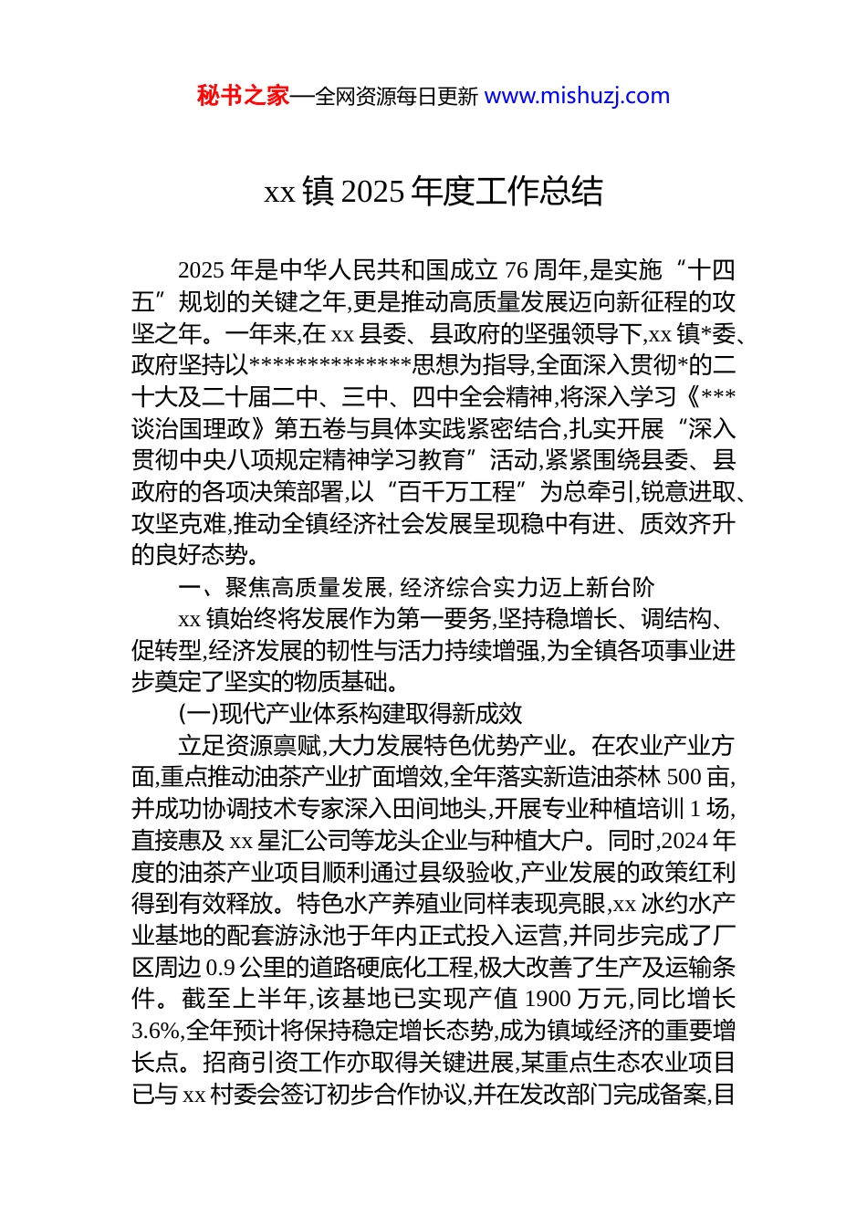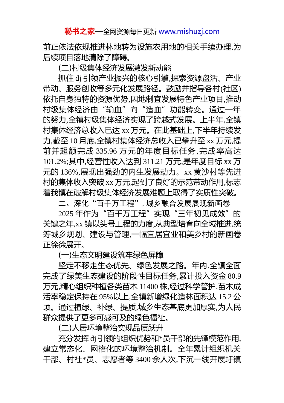 秘书之家—全网资源每日更新 www.mishuzj.comxx 镇 2025 年度工作总结2025 年是中华人民共和国成立 76 周年,是实施“十四五”规划的关键之年,更是推动高质量发展迈向新征程的攻坚之年。一年来,在 xx 县委、县政府的坚强领导下,xx 镇*委、政府坚持以**************思想为指导,全面深入贯彻*的二十大及二十届二中、三中、四中全会精神,将深入学习《***谈治国理政》第五卷与具体实践紧密结合,扎实开展“深入贯彻中央八项规定精神学习教育”活动,紧紧围绕县委、县政府的各项决策部署,以“百千万工程”为总牵引,锐意进取、攻坚克难,推动全镇经济社会发展呈现稳中有进、质效齐升的良好态势。一、聚焦高质量发展,经济综合实力迈上新台阶xx 镇始终将发展作为第一要务,坚持稳增长、调结构、促转型,经济发展的韧性与活力持续增强,为全镇各项事业进步奠定了坚实的物质基础。(一)现代产业体系构建取得新成效立足资源禀赋,大力发展特色优势产业。在农业产业方面,重点推动油茶产业扩面增效,全年落实新造油茶林 500 亩,并成功协调技术专家深入田间地头,开展专业种植培训 1 场,直接惠及 xx 星汇公司等龙头企业与种植大户。同时,2024 年度的油茶产业项目顺利通过县级验收,产业发展的政策红利得到有效释放。特色水产养殖业同样表现亮眼,xx 冰约水产业基地的配套游泳池于年内正式投入运营,并同步完成了厂区周边 0.9 公里的道路硬底化工程,极大改善了生产及运输条件。截至上半年,该基地已实现产值 1900 万元,同比增长3.6%,全年预计将保持稳定增长态势,成为镇域经济的重要增长点。招商引资工作亦取得关键进展,某重点生态农业项目已与 xx 村委会签订初步合作协议,并在发改部门完成备案,目秘书之家—全网资源每日更新 www.mishuzj.com前正依法依规推进林地转为设施农用地的相关手续办理,为后续项目落地清除了障碍。(二)村级集体经济发展激发新动能抓住 dj 引领产业振兴的核心引擎,探索资源盘活、产业带动、服务创收等多元化发展路径。鼓励并指导各村(社区)依托自身独特的资源优势,因地制宜发展特色产业项目,推动村级集体经济由“输血”向“造血”功能转变。通过一年的努力,全镇村级集体经济实现了跨越式发展。上半年,全镇村集体经济总收入已达 xx 万元。在此基础上,下半年持续发力,截至 10 月底,全镇村集体经济总收入已攀升至 xx 万元,提前并超额完成 335.96 万元的年度目标任务,完成率高达101.2%;其中,经营性收入达到 311.21 万元,是年度目标 xx 万元的 136%,展现出强劲的内生发展动力。xx 黄沙村等先进村的集体收入突破 xx 万元,起到了良好的示范带动作用,标志着我镇在破解村级集体经济发展难题上取得了实质性突破。二、深化“百千万工程”,城乡融合发展展现新画卷2025 年作为“百千万工程”实现“三年初见成效”的关键之年,xx 镇以头号工程的力度,从典型培育向全域推进,统筹城乡规划、建设与管理,一幅宜居宜业和美乡村的新画卷正徐徐展开。(一)生态文明建设筑牢绿色屏障坚定不移走生态优先、绿色发展之路。年内,全镇全面完成了绿美生态建设的阶段性目标任务,累计投入资金 80.9万元,精心组织种植各类苗木 11400 株,经过科学管护,苗木成活率稳定保持在 95%以上,全镇新增绿化造林面积达 15.2 公顷。通过植绿、补绿、提质,城乡生态基底更加厚实,为人民群众提供了更多可感可及的绿色福祉。(二)人居环境整治实现品质跃升充分发挥 dj 引领的组织优势和*员干部的先锋模范作用,建立常态化、网格化的环境整治机制。全年累计组织机关干部、村社*员、志愿者等 3400 余人次,下沉一线开展圩镇秘书之家—全网资源每日更新 www.mishuzj.com及村庄清洁整治行动。行动中,共清理乱堆乱放的杂物 80 处、清除“牛皮癣”小广告 280 余处、拆除破旧宣传横幅 7 条及广告牌 1 个,疏通清理沟渠长度约 4.9 公里,清理鱼塘面积1.89 亩,村容村貌焕然一新。在重点区域整治方面,积极推进“三线”整治工作,共计破除路面 140 余米用于管线入地,完成三线管道铺设 1280 多米,线路整治长达 18880 米,新建杆路1000 米,从根本上解决了空中“蜘蛛网”问题。在农村生...