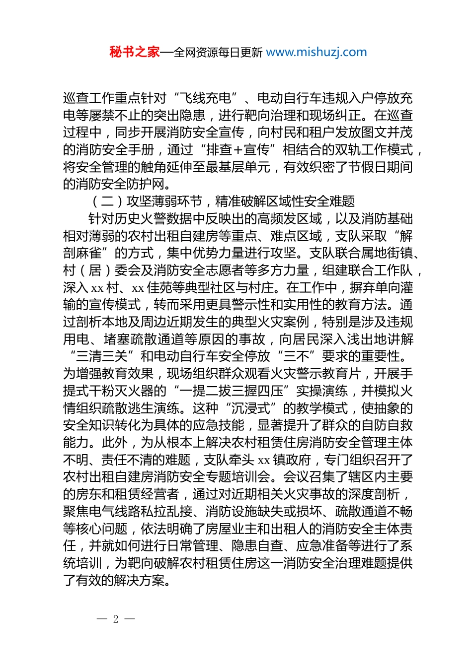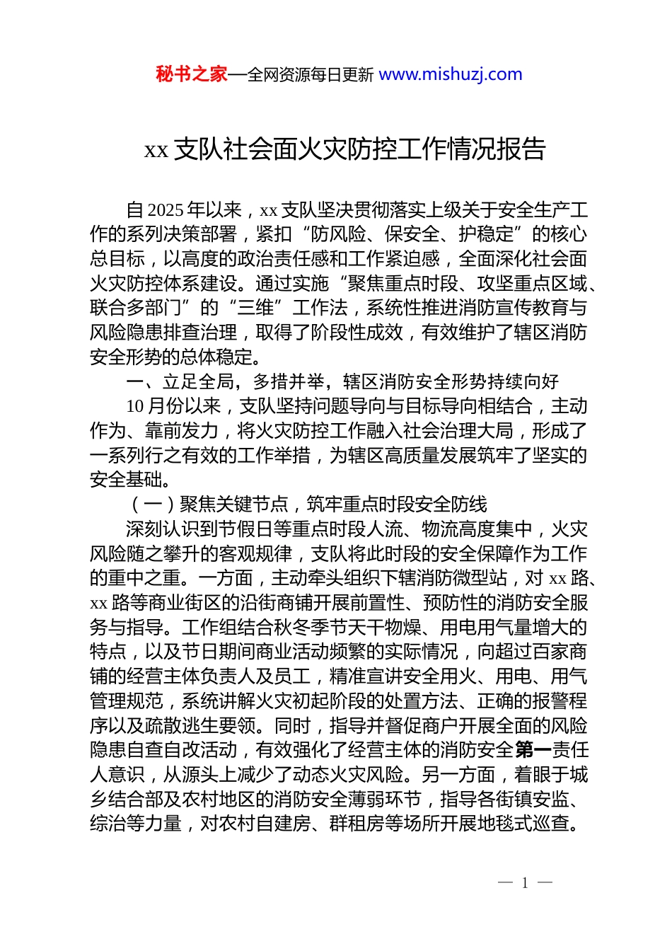 秘书之家—全网资源每日更新 www.mishuzj.comxx 支队社会面火灾防控工作情况报告自 2025 年以来,xx 支队坚决贯彻落实上级关于安全生产工作的系列决策部署,紧扣“防风险、保安全、护稳定”的核心总目标,以高度的政治责任感和工作紧迫感,全面深化社会面火灾防控体系建设。通过实施“聚焦重点时段、攻坚重点区域、联合多部门”的“三维”工作法,系统性推进消防宣传教育与风险隐患排查治理,取得了阶段性成效,有效维护了辖区消防安全形势的总体稳定。一、立足全局,多措并举,辖区消防安全形势持续向好10 月份以来,支队坚持问题导向与目标导向相结合,主动作为、靠前发力,将火灾防控工作融入社会治理大局,形成了一系列行之有效的工作举措,为辖区高质量发展筑牢了坚实的安全基础。(一)聚焦关键节点,筑牢重点时段安全防线深刻认识到节假日等重点时段人流、物流高度集中,火灾风险随之攀升的客观规律,支队将此时段的安全保障作为工作的重中之重。一方面,主动牵头组织下辖消防微型站,对 xx 路、xx 路等商业街区的沿街商铺开展前置性、预防性的消防安全服务与指导。工作组结合秋冬季节天干物燥、用电用气量增大的特点,以及节日期间商业活动频繁的实际情况,向超过百家商铺的经营主体负责人及员工,精准宣讲安全用火、用电、用气管理规范,系统讲解火灾初起阶段的处置方法、正确的报警程序以及疏散逃生要领。同时,指导并督促商户开展全面的风险隐患自查自改活动,有效强化了经营主体的消防安全第一责任人意识,从源头上减少了动态火灾风险。另一方面,着眼于城乡结合部及农村地区的消防安全薄弱环节,指导各街镇安监、综治等力量,对农村自建房、群租房等场所开展地毯式巡查。— 1 —秘书之家—全网资源每日更新 www.mishuzj.com巡查工作重点针对“飞线充电”、电动自行车违规入户停放充电等屡禁不止的突出隐患,进行靶向治理和现场纠正。在巡查过程中,同步开展消防安全宣传,向村民和租户发放图文并茂的消防安全手册,通过“排查+宣传”相结合的双轨工作模式,将安全管理的触角延伸至最基层单元,有效织密了节假日期间的消防安全防护网。(二)攻坚薄弱环节,精准破解区域性安全难题针对历史火警数据中反映出的高频发区域,以及消防基础相对薄弱的农村出租自建房等重点、难点区域,支队采取“解剖麻雀”的方式,集中优势力量进行攻坚。支队联合属地街镇、村(居)委会及消防安全志愿者等多方力量,组建联合工作队,深入 xx 村、xx 佳苑等典型社区与村庄。在工作中,摒弃单向灌输的宣传模式,转而采用更具警示性和实用性的教育方法。通过剖析本地及周边近期发生的典型火灾案例,特别是涉及违规用电、堵塞疏散通道等原因的事故,向居民深入浅出地讲解“三清三关”和电动自行车安全停放“三不”要求的重要性。为增强教育效果,现场组织群众观看火灾警示教育片,开展手提式干粉灭火器的“一提二拔三握四压”实操演练,并模拟火情组织疏散逃生演练。这种“沉浸式”的教学模式,使抽象的安全知识转化为具体的应急技能,显著提升了群众的自防自救能力。此外,为从根本上解决农村租赁住房消防安全管理主体不明、责任不清的难题,支队牵头 xx 镇政府,专门组织召开了农村出租自建房消防安全专题培训会。会议召集了辖区内主要的房东和租赁经营者,通过对近期相关火灾事故的深度剖析,聚焦电气线路私拉乱接、消防设施缺失或损坏、疏散通道不畅等核心问题,依法明确了房屋业主和出租人的消防安全主体责任,并就如何进行日常管理、隐患自查、应急准备等进行了系统培训,为靶向破解农村租赁住房这一消防安全治理难题提供了有效的解决方案。— 2 —秘书之家—全网资源每日更新 www.mishuzj.com(三)整合社会资源,构建多元化消防宣传格局为突破以往消防部门单打独斗的工作局限,支队积极探索并实践“大宣传”工作理念,主动联合多部门、多主体搭建社会化宣传平台,显著拓宽了消防知识的传播广度和深度。针对高层建筑火灾扑救难、人员疏散难的安全痛点,支队联合 xx 镇xx 社区*委,面向社区居民及物业管理人员举办了一场高层建筑火灾防范与逃生专题宣讲会。超过...