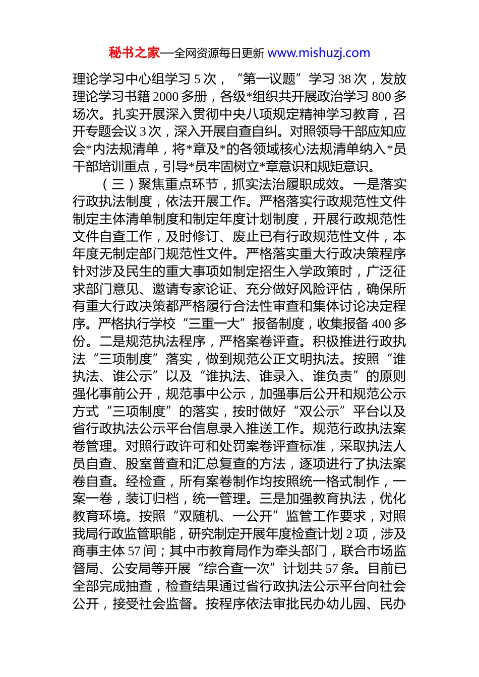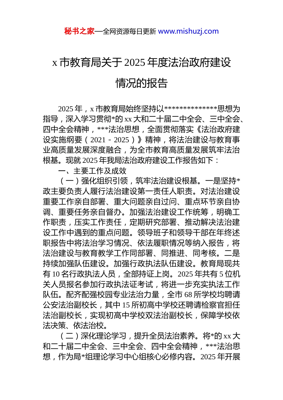 秘书之家—全网资源每日更新 www.mishuzj.comx 市教育局关于 2025 年度法治政府建设情况的报告2025 年,x 市教育局始终坚持以**************思想为指导,深入学习贯彻*的 xx 大和二十届二中全会、三中全会、四中全会精神,***法治思想,全面贯彻落实《法治政府建设实施纲要(2021-2025)》精神,将法治建设与教育事业高质量发展深度融合,为全市教育高质量发展筑牢法治根基。现就 2025 年我局法治政府建设工作报告如下:一、主要工作及成效(一)强化组织引领,筑牢法治建设根基。一是坚持*政主要负责人履行法治建设第一责任人职责。对法治建设重要工作亲自部署、重大问题亲自过问、重点环节亲自协调、重要任务亲自督办。加强法治建设工作统筹,明确工作职责,压实工作责任,定期研究部署、推动解决法治建设工作中遇到的重点问题。领导班子和领导干部在年终述职报告中将法治学习情况、依法履职情况等纳入报告,将法治建设与教育教学工作同部署、同推进、同考核。二是持续加强队伍建设。加强行政执法队伍建设。教育局现共有 10 名行政执法人员,全部持证上岗。2025 年共有 5 位机关人员报名参加行政执法证考试,将进一步充实执法工作队伍。配齐配强校园专业法治力量,全市 68 所学校均聘请公安法治副校长,其中 15 所初高中学校还聘请检察官担任法治副校长,实现初高中学校双法治副校长,保障学校依法决策、依法治校。(二)深化理论学习,提升全员法治素养。将*的 xx 大和二十届二中全会、三中全会、四中全会精神,***法治思想,作为局*组理论学习中心组核心必修内容。2025 年开展秘书之家—全网资源每日更新 www.mishuzj.com理论学习中心组学习 5 次,“第一议题”学习 38 次,发放理论学习书籍 2000 多册,各级*组织共开展政治学习 800 多场次。扎实开展深入贯彻中央八项规定精神学习教育,召开专题会议 3 次,深入开展自查自纠。对照领导干部应知应会*内法规清单,将*章及*的各领域核心法规清单纳入*员干部培训重点,引导*员牢固树立*章意识和规矩意识。(三)聚焦重点环节,抓实法治履职成效。一是落实行政执法制度,依法开展工作。严格落实行政规范性文件制定主体清单制度和制定年度计划制度,开展行政规范性文件自查工作,及时修订、废止已有行政规范性文件,本年度无制定部门规范性文件。严格落实重大行政决策程序针对涉及民生的重大事项如制定招生入学政策时,广泛征求部门意见、邀请专家论证、充分做好风险评估,确保所有重大行政决策都严格履行合法性审查和集体讨论决定程序。严格执行学校“三重一大”报备制度,收集报备 400 多份。二是规范执法程序,严格案卷评查。积极推进行政执法“三项制度”落实,做到规范公正文明执法。按照“谁执法、谁公示”以及“谁执法、谁录入、谁负责”的原则强化事前公开,规范事中公示,加强事后公开和规范公示方式“三项制度”的落实,按时做好“双公示”平台以及省行政执法公示平台信息录入推送工作。规范行政执法案卷管理。对照行政许可和处罚案卷评查标准,采取执法人员自查、股室普查和汇总复查的方法,逐项进行了执法案卷自查。经检查,所有案卷制作均按照统一格式制作,一案一卷,装订归档,统一管理。三是加强教育执法,优化教育环境。按照“双随机、一公开”监管工作要求,对照我局行政监管职能,研究制定开展年度检查计划 2 项,涉及商事主体 57 间;其中市教育局作为牵头部门,联合市场监督局、公安局等开展“综合查一次”计划共 57 条。目前已全部完成抽查,检查结果通过省行政执法公示平台向社会公开,接受社会监督。按程序依法审批民办幼儿园、民办秘书之家—全网资源每日更新 www.mishuzj.com学校及校外培训机构。严格落实办事流程和办结时限,严格把关,依法审批,提高依法行政水平。今年,我市受理审批发放校外培训机构办学许可证共 5 张,目前全市持证机构共 113 所,机构学员 4200 多人。加强校外培训机构监督管理,通过突击执法检查,查看 30 天内视频监信息等方式持续开展学科类隐形变异培训防范治理。对 1 家存在违法行为的机构法人进行约谈,2 家存在违规...