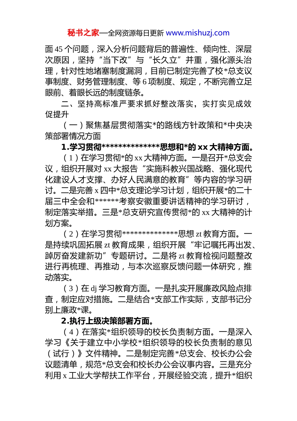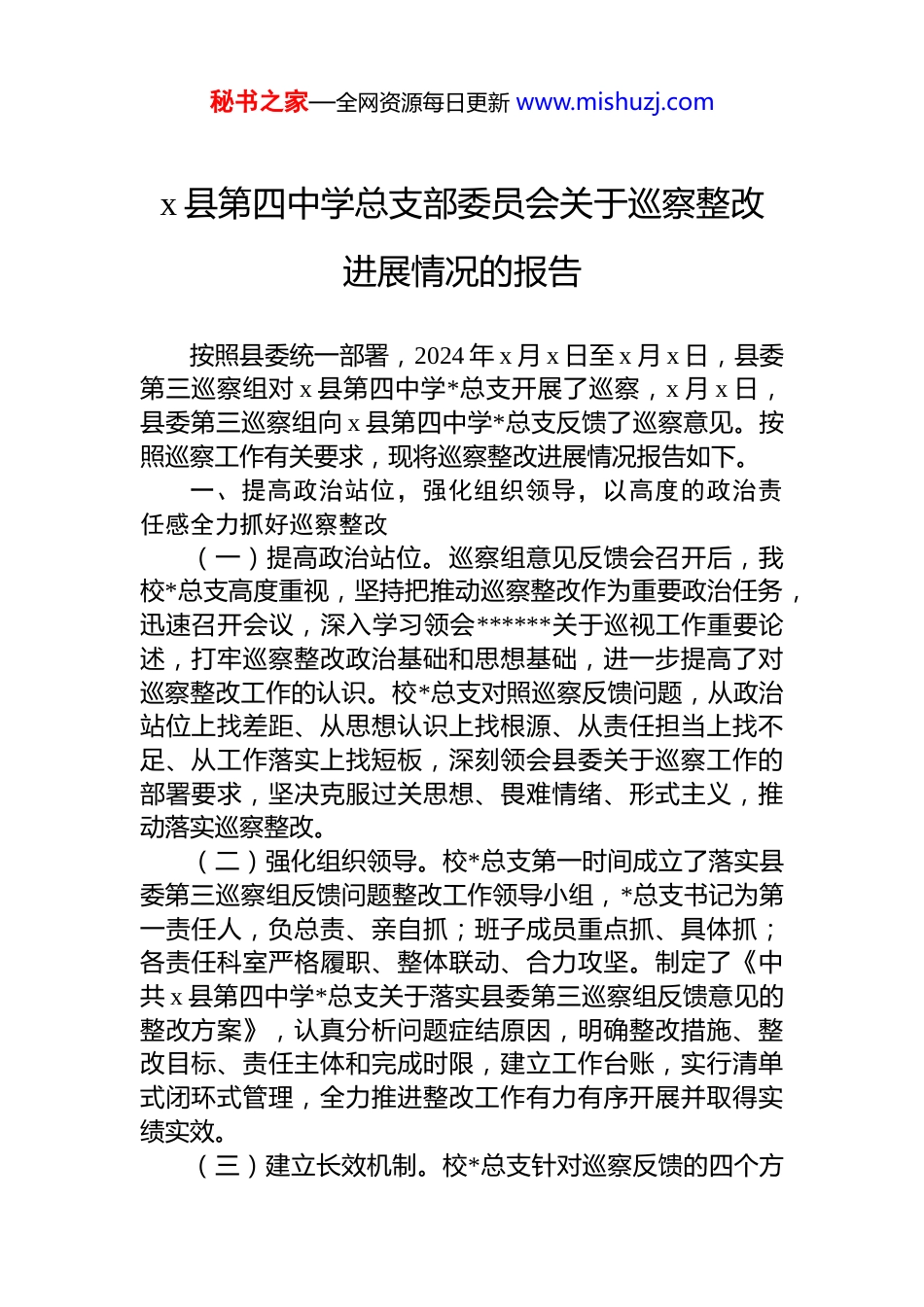秘书之家—全网资源每日更新 www.mishuzj.comx 县第四中学总支部委员会关于巡察整改进展情况的报告按照县委统一部署,2024 年 x 月 x 日至 x 月 x 日,县委第三巡察组对 x 县第四中学*总支开展了巡察,x 月 x 日,县委第三巡察组向 x 县第四中学*总支反馈了巡察意见。按照巡察工作有关要求,现将巡察整改进展情况报告如下。一、提高政治站位,强化组织领导,以高度的政治责任感全力抓好巡察整改(一)提高政治站位。巡察组意见反馈会召开后,我校*总支高度重视,坚持把推动巡察整改作为重要政治任务,迅速召开会议,深入学习领会******关于巡视工作重要论述,打牢巡察整改政治基础和思想基础,进一步提高了对巡察整改工作的认识。校*总支对照巡察反馈问题,从政治站位上找差距、从思想认识上找根源、从责任担当上找不足、从工作落实上找短板,深刻领会县委关于巡察工作的部署要求,坚决克服过关思想、畏难情绪、形式主义,推动落实巡察整改。(二)强化组织领导。校*总支第一时间成立了落实县委第三巡察组反馈问题整改工作领导小组,*总支书记为第一责任人,负总责、亲自抓;班子成员重点抓、具体抓;各责任科室严格履职、整体联动、合力攻坚。制定了《中共 x 县第四中学*总支关于落实县委第三巡察组反馈意见的整改方案》,认真分析问题症结原因,明确整改措施、整改目标、责任主体和完成时限,建立工作台账,实行清单式闭环式管理,全力推进整改工作有力有序开展并取得实绩实效。(三)建立长效机制。校*总支针对巡察反馈的四个方秘书之家—全网资源每日更新 www.mishuzj.com面 45 个问题,深入分析问题背后的普遍性、倾向性、深层次原因,坚持“当下改”与“长久立”并重,强化源头治理,针对性地堵塞制度漏洞,目前已制定完善了校*总支议事制度、财务管理制度、等 6 项制度、规定,不断完善立足眼前、着眼长远的制度链条。二、坚持高标准严要求抓好整改落实,实打实见成效促提升(一)聚焦基层贯彻落实*的路线方针政策和*中央决策部署情况方面1.学习贯彻**************思想和*的 xx 大精神方面。(1)在学习贯彻*的 xx 大精神方面。一是召开*总支会议,组织开展对 xx 大报告“实施科教兴国战略、强化现代化建设人才支撑、办好人民满意的教育”等内容的学习研讨。二是完善 x 四中*总支理论学习计划,组织开展*的二十届三中全会和******考察安徽重要讲话精神的学习研讨,制定落实举措。三是*总支研究宣传贯彻*的 xx 大精神的计划方案。(2)在学习贯彻**************思想 zt 教育方面。一是持续巩固拓展 zt 教育成果,组织开展“牢记嘱托再出发、踔厉奋发建新功”专题研讨。二是将 zt 教育检视问题整改进行再梳理、再推动,与本次巡察反馈问题一体研究,推动落实。(3)在 dj 学习教育方面。一是扎实开展廉政风险点排查,制定应对措施。二是结合*支部工作实际,支部书记分别上廉政*课。2.执行上级决策部署方面。(4)在落实*组织领导的校长负责制方面。一是深入学习《关于建立中小学校*组织领导的校长负责制的意见(试行)》文件精神。二是制定完善*总支会、校长办公会议题清单,规范*总支会和校长办公会议事内容。三是充分利用 x 工业大学帮扶工作平台,开展经验交流,提升*组织秘书之家—全网资源每日更新 www.mishuzj.com领导的校长负责制治校水平。(5)在推进思政课建设方面。一是明确专人分管学校思政课建设工作。二是结合工作实际,建立校领导联系思政课教师制度和思政课教师评价标准,组织开展开展谈心活动。三是制定科学的思政课教师评价标准,定期开展思政课教师思想政治建设专题学习或研讨。(6)在托管帮扶质效方面。一是召开会议,全面解读托管帮扶协议,准确理解帮扶工作的实质。二是完善托管帮扶工作 x 四中任务清单,按照任务安排,组织人员赴合工大附中跟岗学习。三是充分征求“双师星火班”师生的意见建议,结合我校学生基础与合工大附中学生基础差距较大实际,与合工大附中协商签订“双师星火班”补充协议取消视频教学方面的帮扶措施。四是主动沟通,查找帮扶工作存在的不足,做好补短强链工作。(7)在执行...