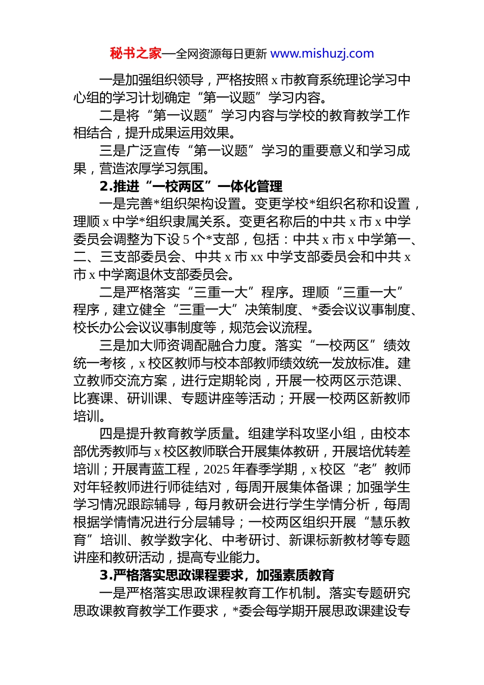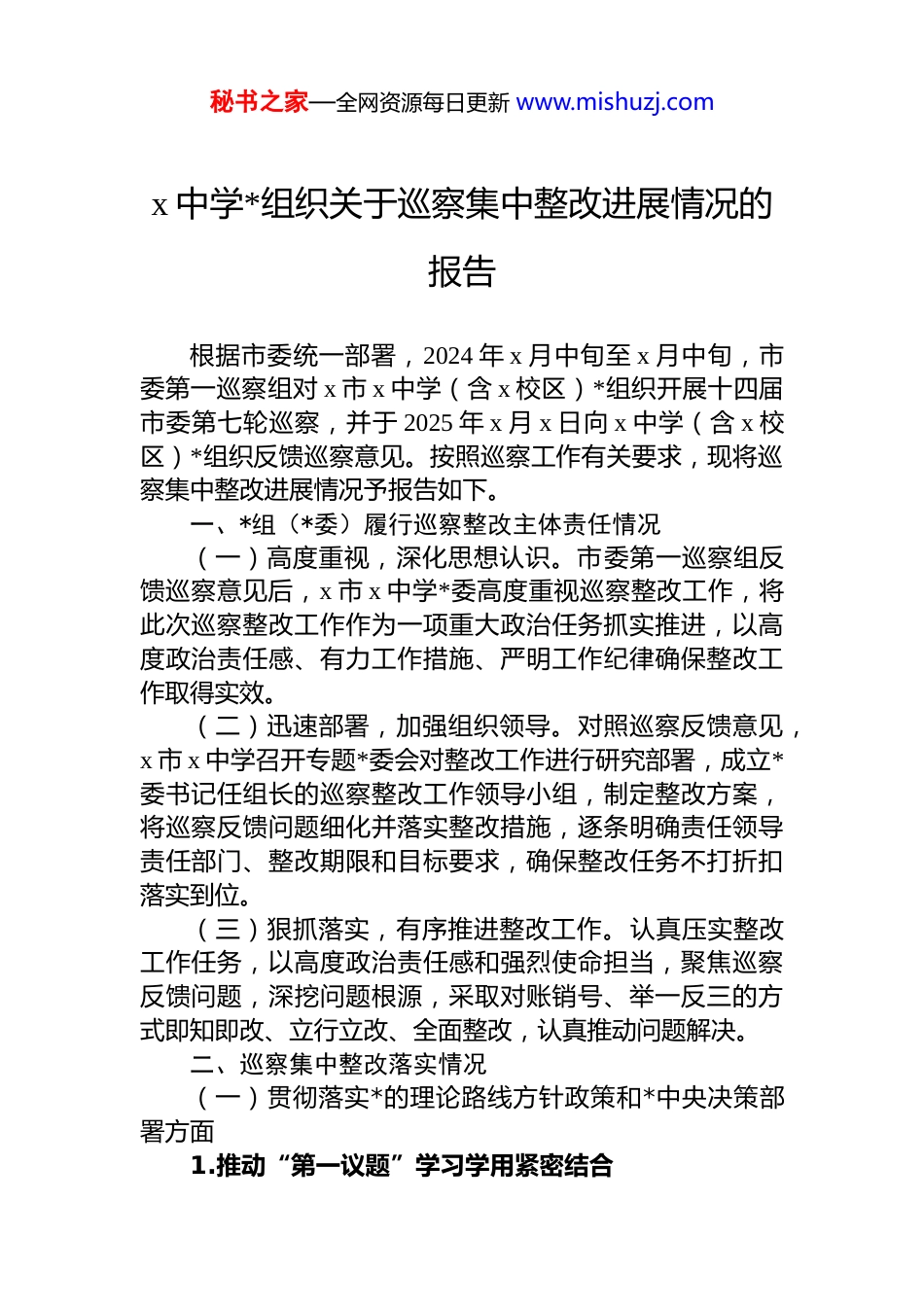 秘书之家—全网资源每日更新 www.mishuzj.comx 中学*组织关于巡察集中整改进展情况的报告根据市委统一部署,2024 年 x 月中旬至 x 月中旬,市委第一巡察组对 x 市 x 中学(含 x 校区)*组织开展十四届市委第七轮巡察,并于 2025 年 x 月 x 日向 x 中学(含 x 校区)*组织反馈巡察意见。按照巡察工作有关要求,现将巡察集中整改进展情况予报告如下。一、*组(*委)履行巡察整改主体责任情况(一)高度重视,深化思想认识。市委第一巡察组反馈巡察意见后,x 市 x 中学*委高度重视巡察整改工作,将此次巡察整改工作作为一项重大政治任务抓实推进,以高度政治责任感、有力工作措施、严明工作纪律确保整改工作取得实效。(二)迅速部署,加强组织领导。对照巡察反馈意见,x 市 x 中学召开专题*委会对整改工作进行研究部署,成立*委书记任组长的巡察整改工作领导小组,制定整改方案,将巡察反馈问题细化并落实整改措施,逐条明确责任领导责任部门、整改期限和目标要求,确保整改任务不打折扣落实到位。(三)狠抓落实,有序推进整改工作。认真压实整改工作任务,以高度政治责任感和强烈使命担当,聚焦巡察反馈问题,深挖问题根源,采取对账销号、举一反三的方式即知即改、立行立改、全面整改,认真推动问题解决。二、巡察集中整改落实情况(一)贯彻落实*的理论路线方针政策和*中央决策部署方面1.推动“第一议题”学习学用紧密结合秘书之家—全网资源每日更新 www.mishuzj.com一是加强组织领导,严格按照 x 市教育系统理论学习中心组的学习计划确定“第一议题”学习内容。二是将“第一议题”学习内容与学校的教育教学工作相结合,提升成果运用效果。三是广泛宣传“第一议题”学习的重要意义和学习成果,营造浓厚学习氛围。2.推进“一校两区”一体化管理一是完善*组织架构设置。变更学校*组织名称和设置,理顺 x 中学*组织隶属关系。变更名称后的中共 x 市 x 中学委员会调整为下设 5 个*支部,包括:中共 x 市 x 中学第一、二、三支部委员会、中共 x 市 xx 中学支部委员会和中共 x市 x 中学离退休支部委员会。二是严格落实“三重一大”程序。理顺“三重一大”程序,建立健全“三重一大”决策制度、*委会议议事制度、校长办公会议议事制度等,规范会议流程。三是加大师资调配融合力度。落实“一校两区”绩效统一考核,x 校区教师与校本部教师绩效统一发放标准。建立教师交流方案,进行定期轮岗,开展一校两区示范课、比赛课、研训课、专题讲座等活动;开展一校两区新教师培训。四是提升教育教学质量。组建学科攻坚小组,由校本部优秀教师与 x 校区教师联合开展集体教研,开展培优转差培训;开展青蓝工程,2025 年春季学期,x 校区“老”教师对年轻教师进行师徒结对,每周开展集体备课;加强学生学习情况跟踪辅导,每月教研会进行学生学情分析,每周根据学情情况进行分层辅导;一校两区组织开展“慧乐教育”培训、教学数字化、中考研讨、新课标新教材等专题讲座和教研活动,提高专业能力。3.严格落实思政课程要求,加强素质教育一是严格落实思政课程教育工作机制。落实专题研究思政课教育教学工作要求,*委会每学期开展思政课建设专秘书之家—全网资源每日更新 www.mishuzj.com题研讨,组织开展“开学思政第一课”教育活动。创新思政教育方法,开展思政电影浸润课程,组织学生观看《钱学森》、《邓稼先》《长津湖》等优秀影视作品,开展“行走的思政课”,组织学生到烈士陵园、博物馆等红色基地参观学习。二是发挥教学功能场所作用。组织人员对 x 校区藏书进行整理,在阅读室按类别重新上架图书、投入一台移动触控一体平台、配置相应桌椅及管理人员,定期组织对阅读室、藏书馆进行检查。自 2025 年 2 月起,x 校区各教学功能场室(含阅读馆)已恢复正常使用。4.提高风险防范意识,消除校园安全隐患一是加强反诈教育,保护师生“钱袋子”。通过国旗下讲话、主题班会、“天天讲安全”等活动加强师生反诈宣传,师生覆盖率达 100%;利用“每周安全提醒”向教师、学生家长发送防诈骗知识宣传,并重点转发“国家反诈平台、x ...
