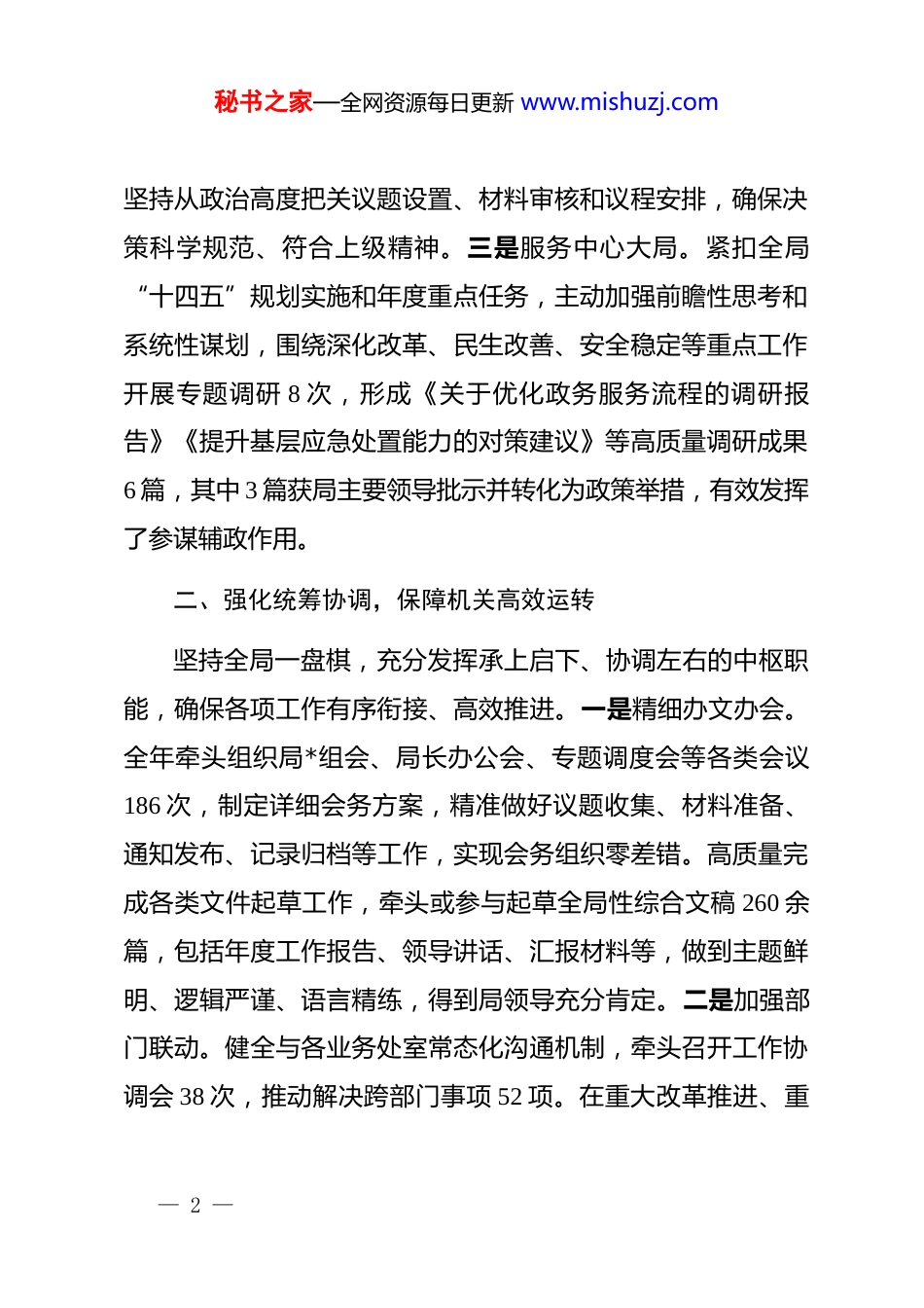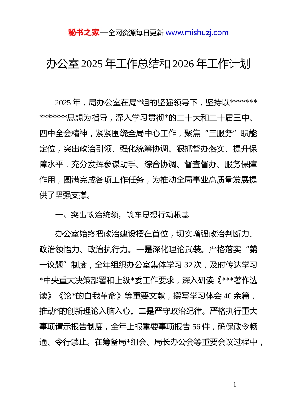秘书之家—全网资源每日更新 www.mishuzj.com办公室 2025 年工作总结和 2026 年工作计划2025 年,局办公室在局*组的坚强领导下,坚持以**************思想为指导,深入学习贯彻*的二十大和二十届三中、四中全会精神,紧紧围绕全局中心工作,聚焦“三服务”职能定位,突出政治引领、强化统筹协调、狠抓督办落实、提升保障水平,充分发挥参谋助手、综合协调、督查督办、服务保障作用,圆满完成各项工作任务,为推动全局事业高质量发展提供了坚强支撑。 一、突出政治统领,筑牢思想行动根基办公室始终把政治建设摆在首位,切实增强政治判断力、政治领悟力、政治执行力。一是深化理论武装。严格落实“第一议题”制度,全年组织办公室集体学习 32 次,及时传达学习*中央重大决策部署和上级*委工作要求,深入研读《***著作选读》《论*的自我革命》等重要文献,撰写学习体会 40 余篇,推动*的创新理论入脑入心。二是严守政治纪律。严格执行重大事项请示报告制度,全年上报重要事项报告 56 件,确保政令畅通、令行禁止。在筹备局*组会、局长办公会等重要会议过程中,— 1 —秘书之家—全网资源每日更新 www.mishuzj.com坚持从政治高度把关议题设置、材料审核和议程安排,确保决策科学规范、符合上级精神。三是服务中心大局。紧扣全局“十四五”规划实施和年度重点任务,主动加强前瞻性思考和系统性谋划,围绕深化改革、民生改善、安全稳定等重点工作开展专题调研 8 次,形成《关于优化政务服务流程的调研报告》《提升基层应急处置能力的对策建议》等高质量调研成果6 篇,其中 3 篇获局主要领导批示并转化为政策举措,有效发挥了参谋辅政作用。二、强化统筹协调,保障机关高效运转坚持全局一盘棋,充分发挥承上启下、协调左右的中枢职能,确保各项工作有序衔接、高效推进。一是精细办文办会。全年牵头组织局*组会、局长办公会、专题调度会等各类会议186 次,制定详细会务方案,精准做好议题收集、材料准备、通知发布、记录归档等工作,实现会务组织零差错。高质量完成各类文件起草工作,牵头或参与起草全局性综合文稿 260 余篇,包括年度工作报告、领导讲话、汇报材料等,做到主题鲜明、逻辑严谨、语言精练,得到局领导充分肯定。二是加强部门联动。健全与各业务处室常态化沟通机制,牵头召开工作协调会 38 次,推动解决跨部门事项 52 项。在重大改革推进、重— 2 —秘书之家—全网资源每日更新 www.mishuzj.com点项目建设、突发事件应对等工作中,主动靠前协调,强化信息共享和资源整合,形成齐抓共管工作合力。三是提升应急保障能力。严格落实 24 小时值班值守制度,修订完善《局机关突发事件应急处置预案》,规范信息报送流程,全年妥善处置紧急情况报告 98 件,均做到第一时间上传下达、快速响应处置,未发生迟报、漏报、误报问题,切实维护了机关安全稳定运行。三、狠抓督查落实,推动决策部署落地见效坚持把抓落实作为检验工作成效的根本标准,健全督查机制,提升督办质效,确保上级部署和局*组决策落地生根。一是完善督查体系。建立“台账管理+动态跟踪+限期反馈+结果通报”闭环式督查机制,对局*组会、局长办公会确定的重点任务实行项目化管理,逐项明确责任处室、完成时限和进度要求,形成督查清单 96 项。创新开展“回头看”专项督查行动,对历年未结事项进行集中攻坚,推动历史遗留问题销号清零 24 项。二是聚焦重点发力。围绕年度重点工作任务,组织开展专项督查 32 次,形成督查专报 45 期,提出改进建议 78 条,推动解决群众反映强烈的办事难、审批慢、监管不到位等问题 63 个。在“优化营商环境”专项督查中,推动审批时限平均压缩 40%,企业满意度显著提升。三是强化结果运用。将督查结果纳入处— 3 —秘书之家—全网资源每日更新 www.mishuzj.com室年度绩效考核体系,对推进不力的处室下发整改提醒函 18 份,约谈责任人 12 人次,有效传导压力、压实责任,形成真抓实干的良好导向。四、夯实基础管理,提升服务保障水平坚持精细管理、精准服务,着力在规范化、制度化、信息化上下功夫,不断提升机关运行保障能力。...