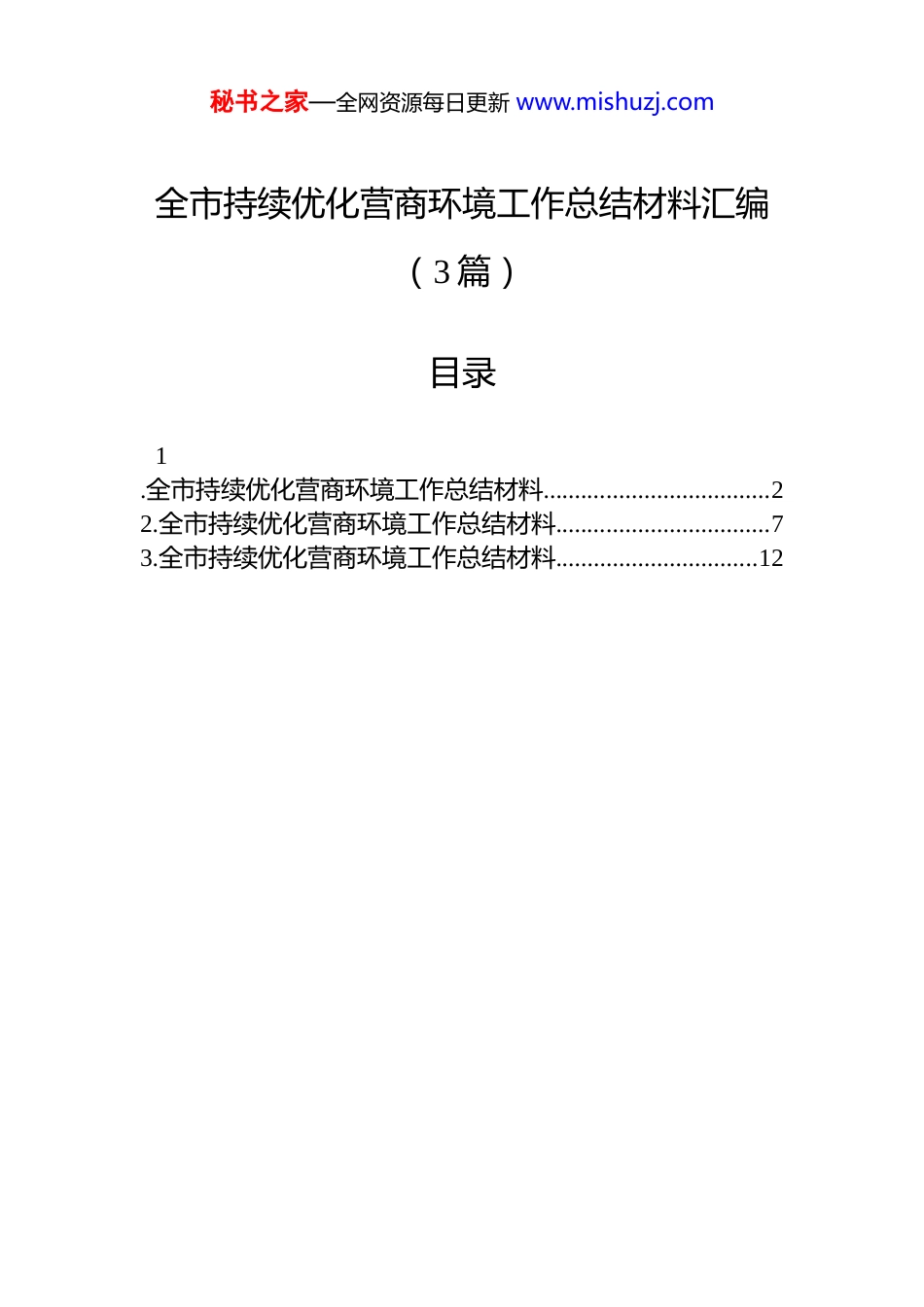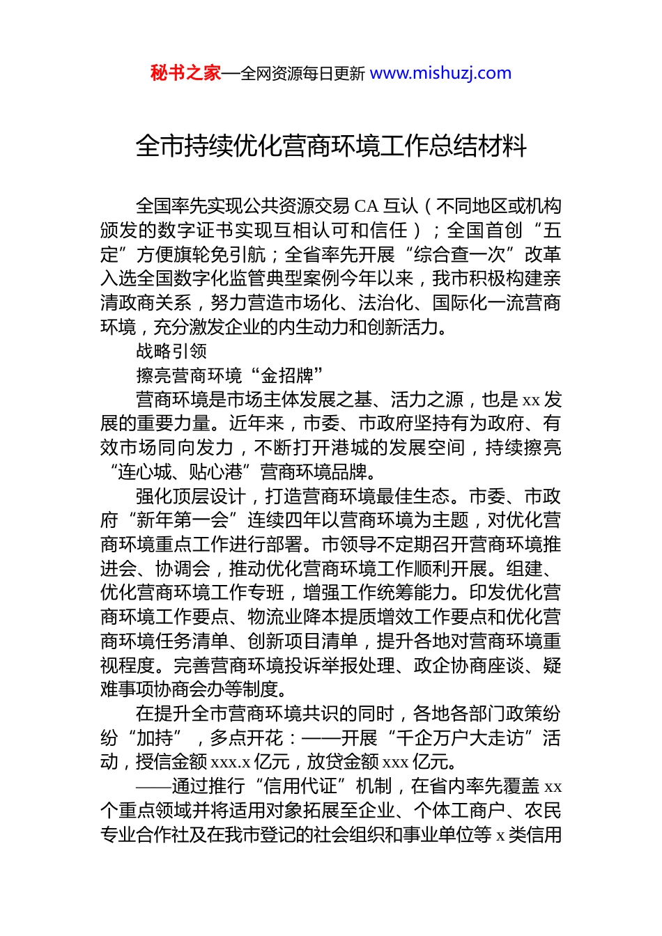 秘书之家—全网资源每日更新 www.mishuzj.com全市持续优化营商环境工作总结材料汇编(3 篇)目录1.全市持续优化营商环境工作总结材料....................................22.全市持续优化营商环境工作总结材料..................................73.全市持续优化营商环境工作总结材料................................12秘书之家—全网资源每日更新 www.mishuzj.com全市持续优化营商环境工作总结材料全国率先实现公共资源交易 CA 互认(不同地区或机构颁发的数字证书实现互相认可和信任);全国首创“五定”方便旗轮免引航;全省率先开展“综合查一次”改革入选全国数字化监管典型案例今年以来,我市积极构建亲清政商关系,努力营造市场化、法治化、国际化一流营商环境,充分激发企业的内生动力和创新活力。战略引领擦亮营商环境“金招牌”营商环境是市场主体发展之基、活力之源,也是 xx 发展的重要力量。近年来,市委、市政府坚持有为政府、有效市场同向发力,不断打开港城的发展空间,持续擦亮“连心城、贴心港”营商环境品牌。强化顶层设计,打造营商环境最佳生态。市委、市政府“新年第一会”连续四年以营商环境为主题,对优化营商环境重点工作进行部署。市领导不定期召开营商环境推进会、协调会,推动优化营商环境工作顺利开展。组建、优化营商环境工作专班,增强工作统筹能力。印发优化营商环境工作要点、物流业降本提质增效工作要点和优化营商环境任务清单、创新项目清单,提升各地对营商环境重视程度。完善营商环境投诉举报处理、政企协商座谈、疑难事项协商会办等制度。在提升全市营商环境共识的同时,各地各部门政策纷纷“加持”,多点开花:——开展“千企万户大走访”活动,授信金额 xxx.x 亿元,放贷金额 xxx 亿元。——通过推行“信用代证”机制,在省内率先覆盖 xx个重点领域并将适用对象拓展至企业、个体工商户、农民专业合作社及在我市登记的社会组织和事业单位等 x 类信用秘书之家—全网资源每日更新 www.mishuzj.com主体。——全国首创“五定”方便旗轮免引航(“五定”:船舶所有权为中资或中资控股、船员为中国籍船员、航班为定期航班、航线为定点航线、停靠在 xx 口岸泊位为定点泊位)作业转入常态化运行,全省首个内河“预约过闸零等待”程序正式运行。创新跨境多式联运船车直取零等待服务模式、实施铁水联运“一单到底”提升多式联运服务质量、打造专兼常备的危险货物道路运输应急救援联盟模式 x 个案例入选交通运输部《交通强国建设试点典型案例》。这一系列政策落地,彰显了对优化营商环境、激发市场活力的高度重视和坚定决心。xx 医药药品生产和研发一体化项目是我市外资企业的增资项目,该项目主要建设精神类和抗感染药物的高端制剂与抗癌药和心血管创新药物制剂生产车间及配套辅助设施。该企业负责人感叹,xx 医药延伸产业链、扩大新产能、增加新品种的重要布局,也是对 xx 营商环境再次投下的“信任票”。改革发力追求政府服务“最高效”“没想到这么快就能拿到批复!”今年 x 月,xx 新材料科技有限公司成为今年我市首个实现环评与排污许可“两证审批合一”改革的受益者,企业负责人连声称赞。针对企业提出的审批周期较长等问题,灌云生态环境局主动靠前服务,组织技术团队提前介入评估,帮助企业完善污染防治方案;同时实行并联审批,将环评报告表审批与简化管理排污许可证核发同步受理、同步审查,最终仅用 xx 天就完成全部审批流程,较分开办理缩短 xx 个工作日。今年以来,我市坚持市场化改革方向,持续深化“放管服”改革,精准施策,激发市场主体活力和社会创造力秘书之家—全网资源每日更新 www.mishuzj.com对保持 xx 经济平稳运行发挥了关键作用。——通过推进企业办事便利高效,推行企业登记“全市通办”,全市企业登记机关通办各类登记业务 xxxx 余件。——推进集成事项窗口整合,各县区(板块)综窗覆盖率 xx%以上,xx 县、xx 区政务大厅综窗覆盖率达 xxx%。——“高效办成一件事”应用场景拓展丰富,加快政务服务网“一网”、政务服务中心“一门”和 xxxxx 热线“一线”业务衔接、服务贯通...
