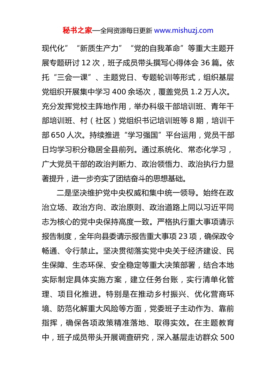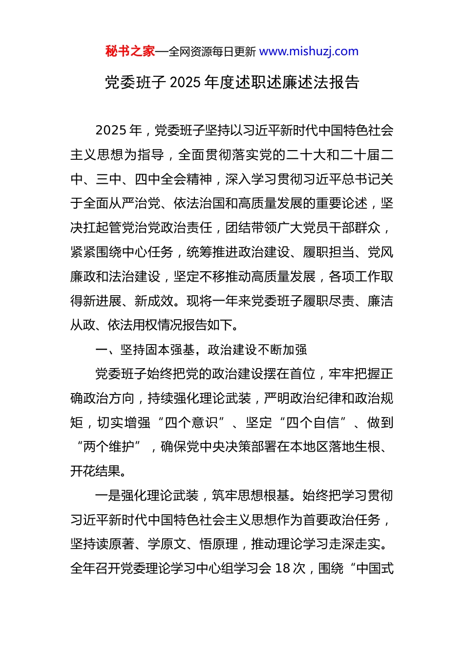 秘书之家—全网资源每日更新 www.mishuzj.com党委班子 2025 年度述职述廉述法报告 2025 年,党委班子坚持以习近平新时代中国特色社会主义思想为指导,全面贯彻落实党的二十大和二十届二中、三中、四中全会精神,深入学习贯彻习近平总书记关于全面从严治党、依法治国和高质量发展的重要论述,坚决扛起管党治党政治责任,团结带领广大党员干部群众,紧紧围绕中心任务,统筹推进政治建设、履职担当、党风廉政和法治建设,坚定不移推动高质量发展,各项工作取得新进展、新成效。现将一年来党委班子履职尽责、廉洁从政、依法用权情况报告如下。一、坚持固本强基,政治建设不断加强党委班子始终把党的政治建设摆在首位,牢牢把握正确政治方向,持续强化理论武装,严明政治纪律和政治规矩,切实增强“四个意识”、坚定“四个自信”、做到“两个维护”,确保党中央决策部署在本地区落地生根、开花结果。一是强化理论武装,筑牢思想根基。始终把学习贯彻习近平新时代中国特色社会主义思想作为首要政治任务,坚持读原著、学原文、悟原理,推动理论学习走深走实。全年召开党委理论学习中心组学习会 18 次,围绕“中国式秘书之家—全网资源每日更新 www.mishuzj.com现代化”“新质生产力”“党的自我革命”等重大主题开展专题研讨 12 次,班子成员带头撰写心得体会 36 篇。依托“三会一课”、主题党日、专题轮训等形式,组织基层党组织开展集中学习 400 余场次,覆盖党员 1.2 万人次。充分发挥党校主阵地作用,举办科级干部培训班、青年干部培训班、村(社区)党组织书记培训班等 8 期,培训干部 650 人次。持续推进“学习强国”平台运用,党员干部日均学习积分稳居全县前列。通过系统化、常态化学习,广大党员干部的政治判断力、政治领悟力、政治执行力显著提升,进一步夯实了团结奋斗的思想基础。二是坚决维护党中央权威和集中统一领导。始终在政治立场、政治方向、政治原则、政治道路上同以习近平同志为核心的党中央保持高度一致。严格执行重大事项请示报告制度,全年向县委请示报告重大事项 23 项,确保政令畅通、令行禁止。坚决贯彻落实党中央关于经济建设、民生保障、生态环保、安全稳定等重大决策部署,结合本地实际制定具体实施方案,建立任务台账,实行清单化管理、项目化推进。特别是在推动乡村振兴、优化营商环境、防范化解重大风险等方面,党委班子主动作为、靠前指挥,确保各项政策精准落地、取得实效。在主题教育中,班子成员带头开展调查研究,深入基层走访群众 500秘书之家—全网资源每日更新 www.mishuzj.com余人次,形成调研报告 18 篇,推动解决群众急难愁盼问题86 个,切实把“两个维护”体现在行动上、落实到工作中。三是严肃党内政治生活,净化政治生态。严格执行《关于新形势下党内政治生活的若干准则》,高质量召开年度民主生活会和专题民主生活会,会前广泛征求意见建议 132 条,会上班子成员坦诚相见、红脸出汗,查摆问题117 项,制定整改措施 156 条,全部建立整改台账并限期销号。严格落实双重组织生活制度,班子成员以普通党员身份参加所在党支部组织生活 120 余次。加强民主集中制建设,修订完善党委议事规则和“三重一大”决策制度,全年召开党委会 32 次,研究重大事项 186 项,始终坚持集体领导、民主决策、依法依规办事,确保决策科学、程序规范、过程透明。持续巩固风清气正的政治生态,坚决反对“七个有之”,做到“五个必须”,教育引导党员干部自觉做政治上的明白人、老实人。四是牢牢掌握意识形态工作领导权。严格落实意识形态工作责任制,党委全年专题研究意识形态工作 6 次,分析研判意识形态领域风险隐患,制定应对预案。加强阵地建设和管理,对辖区内的宣传栏、文化站、宗教场所、网络平台等开展全面排查整治,关停违规自媒体账号 3 个,秘书之家—全网资源每日更新 www.mishuzj.com整改问题点位 12 处。强化网络舆情监测处置,组建网评员队伍 45 人,全年妥善处置网络舆情 17 起,发布权威信息回应社会关切,有效防止负面炒作。加强正面宣传引导,围绕学习贯彻党的二十大精神、庆祝新中国成立 ...
