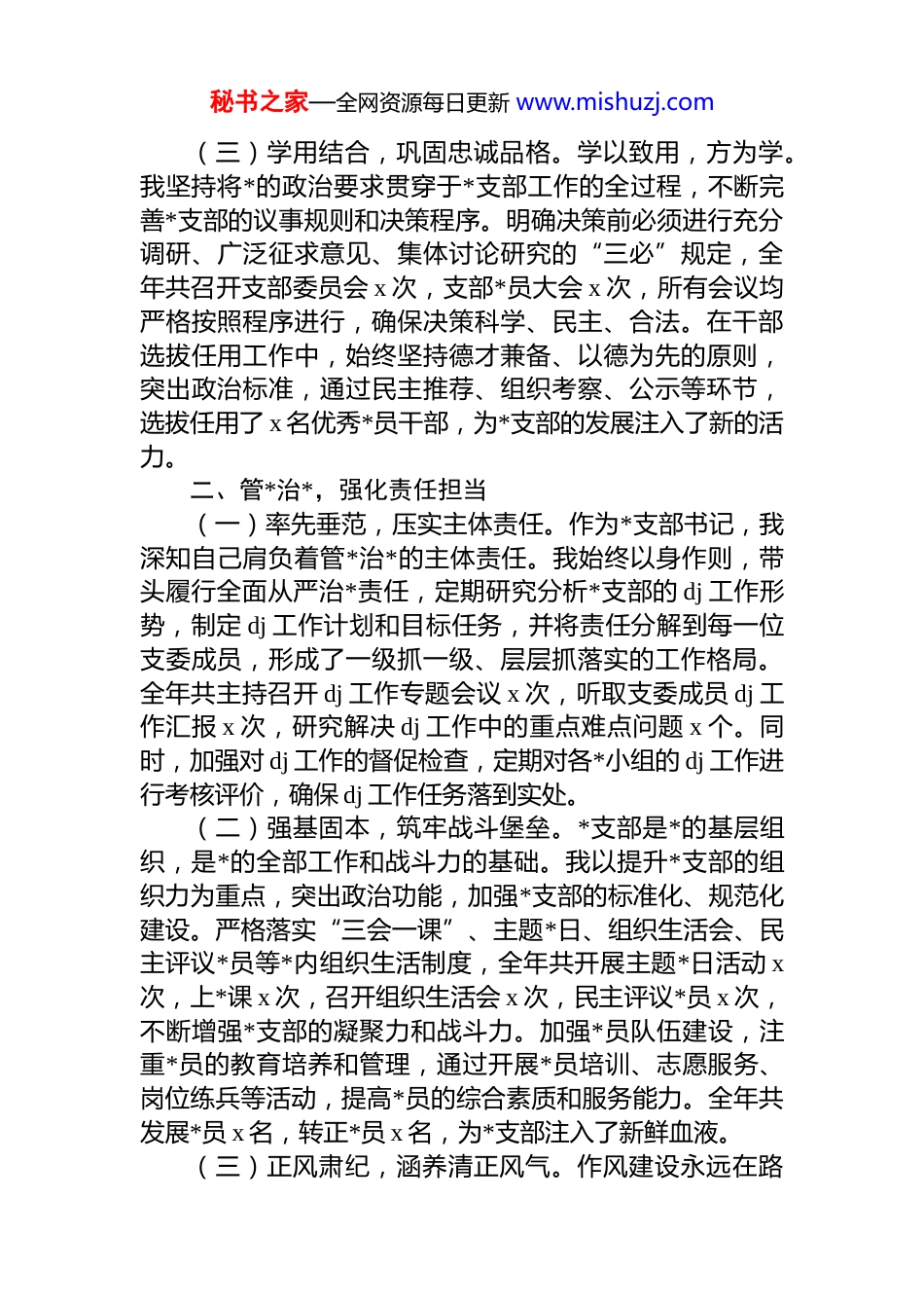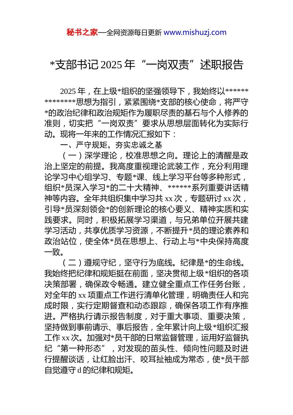 秘书之家—全网资源每日更新 www.mishuzj.com*支部书记 2025 年“一岗双责”述职报告2025 年,在上级*组织的坚强领导下,我始终以**************思想为指引,紧紧围绕*支部的核心使命,将严守*的政治纪律和政治规矩作为履职尽责的基石与个人修养的准则,切实把“一岗双责”要求从思想层面转化为实际行动。现将一年来的工作情况汇报如下:一、严守规矩,夯实忠诚之基(一)深学理论,校准思想之向。理论上的清醒是政治上坚定的前提。我高度重视理论武装工作,充分利用理论学习中心组学习、专题*课、线上学习平台等多种形式,组织*员深入学习*的二十大精神、******系列重要讲话精神等内容。全年共组织集中学习共 xx 次,专题研讨 xx 次,引导*员深刻领会*的创新理论的核心要义、精神实质和实践要求。同时,积极拓展学习渠道,与兄弟单位开展共建学习活动,共享优质学习资源,不断提升*员的理论素养和政治站位,使全体*员在思想上、行动上与*中央保持高度一致。(二)遵规守纪,坚守行为底线。纪律是*的生命线。我始终把纪律和规矩挺在前面,坚决贯彻上级*组织的各项决策部署,确保政令畅通。建立健全重点工作任务台账,对全年的 xx 项重点工作进行清单化管理,明确责任人和完成时限,实行定期督查和动态跟踪,确保各项工作有序推进。严格执行请示报告制度,对于重大事项、重要决策,坚持做到事前请示、事后报告,全年累计向上级*组织汇报工作 xx 次。加强对*员干部的日常监督管理,运用好监督执纪“第一种形态”,对发现的苗头性、倾向性问题及时进行提醒谈话,让红脸出汗、咬耳扯袖成为常态,使*员干部自觉遵守 d 的纪律和规矩。秘书之家—全网资源每日更新 www.mishuzj.com(三)学用结合,巩固忠诚品格。学以致用,方为学。我坚持将*的政治要求贯穿于*支部工作的全过程,不断完善*支部的议事规则和决策程序。明确决策前必须进行充分调研、广泛征求意见、集体讨论研究的“三必”规定,全年共召开支部委员会 x 次,支部*员大会 x 次,所有会议均严格按照程序进行,确保决策科学、民主、合法。在干部选拔任用工作中,始终坚持德才兼备、以德为先的原则,突出政治标准,通过民主推荐、组织考察、公示等环节,选拔任用了 x 名优秀*员干部,为*支部的发展注入了新的活力。二、管*治*,强化责任担当(一)率先垂范,压实主体责任。作为*支部书记,我深知自己肩负着管*治*的主体责任。我始终以身作则,带头履行全面从严治*责任,定期研究分析*支部的 dj 工作形势,制定 dj 工作计划和目标任务,并将责任分解到每一位支委成员,形成了一级抓一级、层层抓落实的工作格局。全年共主持召开 dj 工作专题会议 x 次,听取支委成员 dj 工作汇报 x 次,研究解决 dj 工作中的重点难点问题 x 个。同时,加强对 dj 工作的督促检查,定期对各*小组的 dj 工作进行考核评价,确保 dj 工作任务落到实处。(二)强基固本,筑牢战斗堡垒。*支部是*的基层组织,是*的全部工作和战斗力的基础。我以提升*支部的组织力为重点,突出政治功能,加强*支部的标准化、规范化建设。严格落实“三会一课”、主题*日、组织生活会、民主评议*员等*内组织生活制度,全年共开展主题*日活动 x次,上*课 x 次,召开组织生活会 x 次,民主评议*员 x 次,不断增强*支部的凝聚力和战斗力。加强*员队伍建设,注重*员的教育培养和管理,通过开展*员培训、志愿服务、岗位练兵等活动,提高*员的综合素质和服务能力。全年共发展*员 x 名,转正*员 x 名,为*支部注入了新鲜血液。(三)正风肃纪,涵养清正风气。作风建设永远在路秘书之家—全网资源每日更新 www.mishuzj.com上。我始终把*风廉政建设作为*支部工作的重要内容,加强对*员干部的廉洁教育,通过开展廉政*课、廉政警示教育、廉政谈话等活动,引导*员干部树立正确的权力观、地位观和利益观,增强廉洁自律意识。加强对权力运行的监督制约,建立健全廉政风险防控机制,对重点领域、关键环节进行廉政风险排查和评估,制定相应的防控措施,确保权力在阳光下运行。加强对*员干部的日常监督管理,严肃查处违规违纪行为,全年...