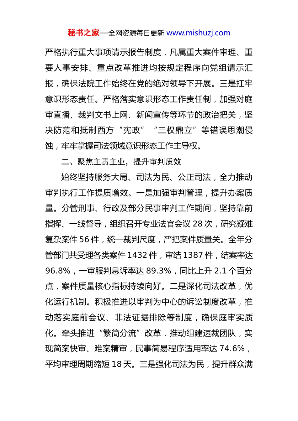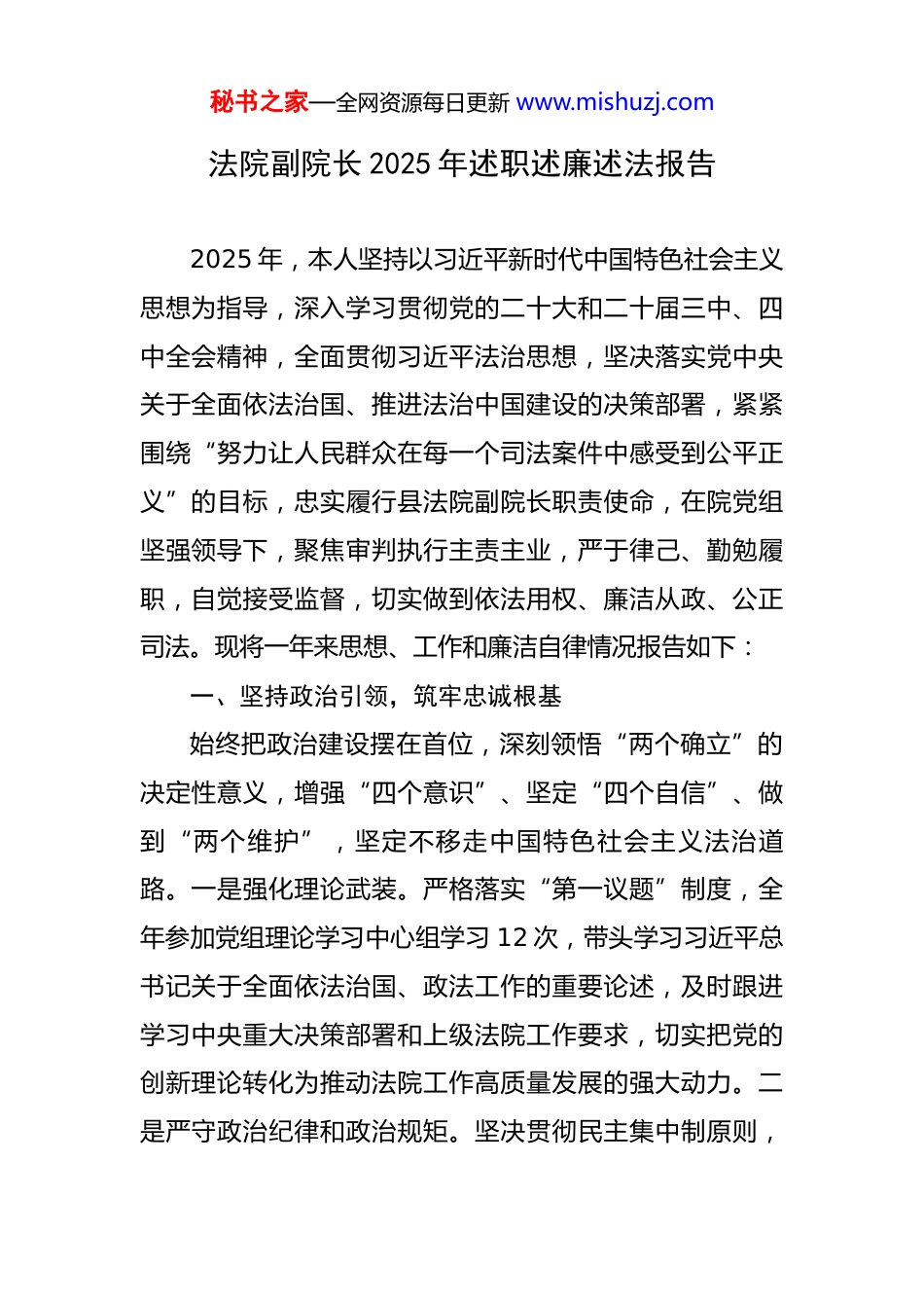 秘书之家—全网资源每日更新 www.mishuzj.com法院副院长 2025 年述职述廉述法报告 2025 年,本人坚持以习近平新时代中国特色社会主义思想为指导,深入学习贯彻党的二十大和二十届三中、四中全会精神,全面贯彻习近平法治思想,坚决落实党中央关于全面依法治国、推进法治中国建设的决策部署,紧紧围绕“努力让人民群众在每一个司法案件中感受到公平正义”的目标,忠实履行县法院副院长职责使命,在院党组坚强领导下,聚焦审判执行主责主业,严于律己、勤勉履职,自觉接受监督,切实做到依法用权、廉洁从政、公正司法。现将一年来思想、工作和廉洁自律情况报告如下:一、坚持政治引领,筑牢忠诚根基始终把政治建设摆在首位,深刻领悟“两个确立”的决定性意义,增强“四个意识”、坚定“四个自信”、做到“两个维护”,坚定不移走中国特色社会主义法治道路。一是强化理论武装。严格落实“第一议题”制度,全年参加党组理论学习中心组学习 12 次,带头学习习近平总书记关于全面依法治国、政法工作的重要论述,及时跟进学习中央重大决策部署和上级法院工作要求,切实把党的创新理论转化为推动法院工作高质量发展的强大动力。二是严守政治纪律和政治规矩。坚决贯彻民主集中制原则,秘书之家—全网资源每日更新 www.mishuzj.com严格执行重大事项请示报告制度,凡属重大案件审理、重要人事安排、重点改革推进均按规定程序向党组请示汇报,确保法院工作始终在党的绝对领导下开展。三是扛牢意识形态责任。严格落实意识形态工作责任制,加强对庭审直播、裁判文书上网、新闻宣传等环节的政治把关,坚决防范和抵制西方“宪政”“三权鼎立”等错误思潮侵蚀,牢牢掌握司法领域意识形态工作主导权。二、聚焦主责主业,提升审判质效始终坚持服务大局、司法为民、公正司法,全力推动审判执行工作提质增效。一是加强审判管理,提升办案质量。分管刑事、行政及部分民事审判工作期间,坚持靠前指挥、一线督导,组织召开专业法官会议 28 次,研究疑难复杂案件 56 件,统一裁判尺度,严把案件质量关。全年分管部门共受理各类案件 1432 件,审结 1387 件,结案率达96.8%,一审服判息诉率达 89.3%,同比上升 2.1 个百分点,案件质量核心指标持续向好。二是深化司法改革,优化运行机制。积极推进以审判为中心的诉讼制度改革,推动落实庭前会议、非法证据排除等制度,确保庭审实质化。牵头推进“繁简分流”改革,推动组建速裁团队,实现简案快审、难案精审,民事简易程序适用率达 74.6%,平均审理周期缩短 18 天。三是强化司法为民,提升群众满秘书之家—全网资源每日更新 www.mishuzj.com意度。持续推进一站式多元解纷和诉讼服务体系建设,推动 诉 前 调 解 成 功 案 件 432 件 , 调 解 成 功 率 同 比 提 高11.5%。深入开展“我为群众办实事”实践活动,组织法官进社区、进企业、进校园开展普法宣传 23 场次,发放法律资料 3000 余份。妥善审理涉民生案件,依法保障农民工工资、老年人赡养、未成年人权益等重点群体合法权益。四是严格依法履职,维护公平正义。坚持依法独立公正行使审判权,带头办理重大疑难复杂案件 12 件,其中包括一起涉案金额达 1.2 亿元的非法集资案和一起社会影响较大的行政强制拆除纠纷案,均取得良好法律效果和社会效果。严格落实防止干预司法“三个规定”,全年记录报告相关情况 17 条,坚决抵制说情打招呼等不当干预行为。三、严守纪律规矩,恪守廉洁底线始终以党员领导干部和人民法官的高标准严格要求自己,带头遵守党纪国法和廉洁自律各项规定。一是严守廉洁从政纪律。严格执行纪律规定及其实施细则精神,坚决反对形式主义、官僚主义,在公务接待、会议活动、公务用车等方面坚持勤俭节约、规范有序,无超标准接待、公款旅游、违规使用公车等问题。二是落实个人有关事项报告制度。如实填报婚姻、房产、投资、配偶子女从业等情况,全年无瞒报、漏报、错报情形,自觉接受组织监督。秘书之家—全网资源每日更新 www.mishuzj.com三是注重家风建设。经常与配偶、子女开展廉政谈话,教育引导亲属遵纪守法、廉洁自律,坚决防止...