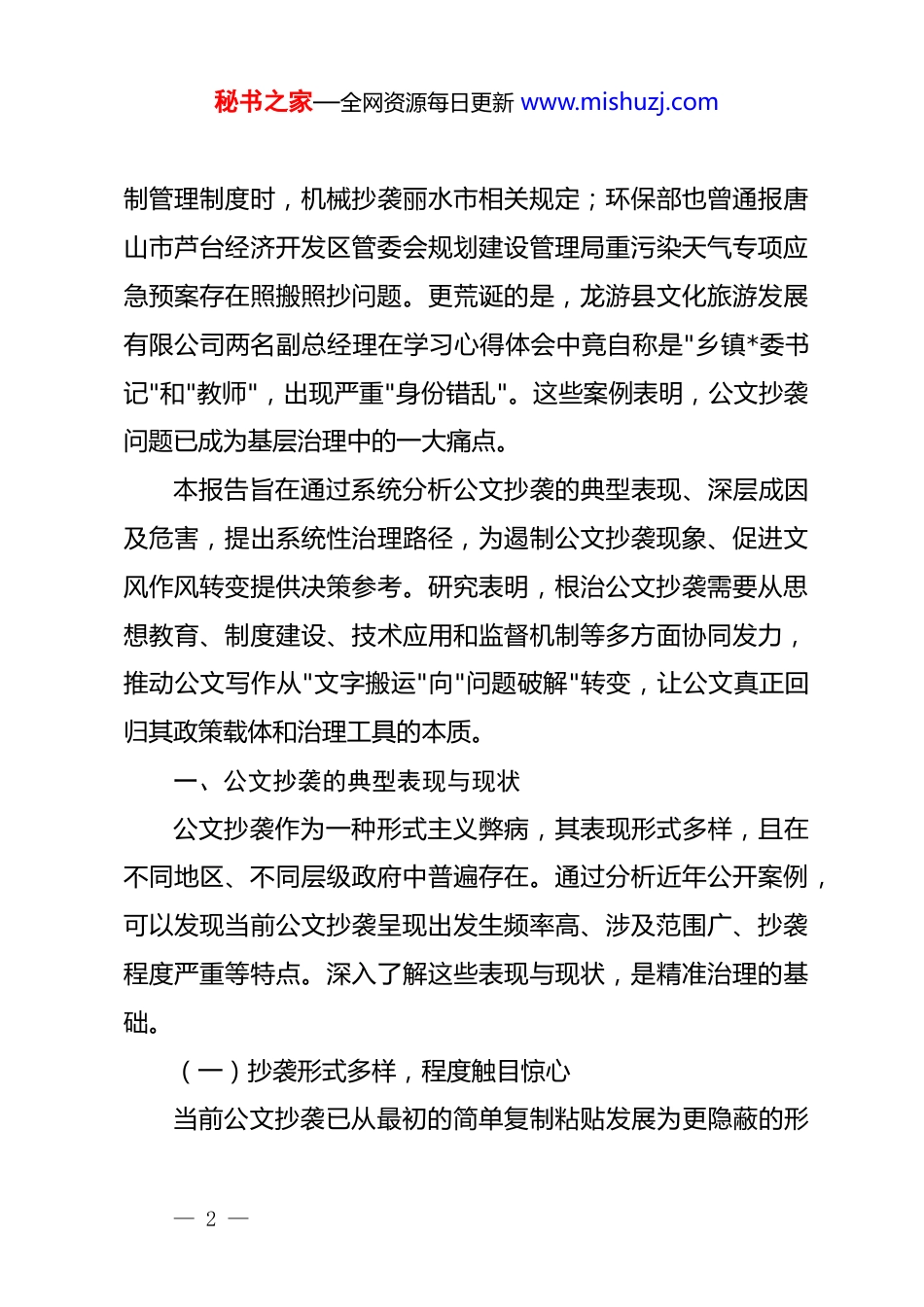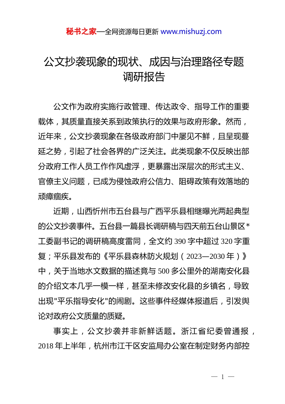 秘书之家—全网资源每日更新 www.mishuzj.com公文抄袭现象的现状、成因与治理路径专题调研报告公文作为政府实施行政管理、传达政令、指导工作的重要载体,其质量直接关系到政策执行的效果与政府形象。然而,近年来,公文抄袭现象在各级政府部门中屡见不鲜,且呈现蔓延之势,引起了社会各界的广泛关注。此类现象不仅反映出部分政府工作人员工作作风虚浮,更暴露出深层次的形式主义、官僚主义问题,已成为侵蚀政府公信力、阻碍政策有效落地的顽瘴痼疾。近期,山西忻州市五台县与广西平乐县相继曝光两起典型的公文抄袭事件。五台县一篇县长调研稿与四天前五台山景区*工委副书记的调研稿高度雷同,全文约 390 字中超过 320 字重复;平乐县发布的《平乐县森林防火规划(2023—2030 年)》中,关于当地水文数据的描述竟与 500 多公里外的湖南安化县的介绍文本几乎一模一样,甚至未修改安化县的乡镇名,导致出现"平乐指导安化"的闹剧。这些事件经媒体报道后,引发舆论对政府公文质量的质疑。事实上,公文抄袭并非新鲜话题。浙江省纪委曾通报 ,2018 年上半年,杭州市江干区安监局办公室在制定财务内部控— 1 —秘书之家—全网资源每日更新 www.mishuzj.com制管理制度时,机械抄袭丽水市相关规定;环保部也曾通报唐山市芦台经济开发区管委会规划建设管理局重污染天气专项应急预案存在照搬照抄问题。更荒诞的是,龙游县文化旅游发展有限公司两名副总经理在学习心得体会中竟自称是"乡镇*委书记"和"教师",出现严重"身份错乱"。这些案例表明,公文抄袭问题已成为基层治理中的一大痛点。本报告旨在通过系统分析公文抄袭的典型表现、深层成因及危害,提出系统性治理路径,为遏制公文抄袭现象、促进文风作风转变提供决策参考。研究表明,根治公文抄袭需要从思想教育、制度建设、技术应用和监督机制等多方面协同发力,推动公文写作从"文字搬运"向"问题破解"转变,让公文真正回归其政策载体和治理工具的本质。一、公文抄袭的典型表现与现状公文抄袭作为一种形式主义弊病,其表现形式多样,且在不同地区、不同层级政府中普遍存在。通过分析近年公开案例,可以发现当前公文抄袭呈现出发生频率高、涉及范围广、抄袭程度严重等特点。深入了解这些表现与现状,是精准治理的基础。(一)抄袭形式多样,程度触目惊心当前公文抄袭已从最初的简单复制粘贴发展为更隐蔽的形— 2 —秘书之家—全网资源每日更新 www.mishuzj.com式,但基本特征都是脱离实际、缺乏创新。主要表现形式包括:原样照搬型:这类抄袭最为直接粗暴,几乎全文复制他人或他地文件,仅修改单位名称、日期等基本信息。如何避免县中医院副院长王运动从网上下载个人对照检查材料,仅修改标题和落款便作为自己的发言材料,查重率高达 99%。更为典型的是,伊春区畜牧兽医站站长杨佩馥的述职述廉报告中,2015年度报告多处出现"2012 年"字样,2016 年度报告则多处出现"2015 年"字样,明显是旧稿翻新。机械拼接型:采用"裁缝式"写作逻辑,将多份文件进行拼凑整合。如某业务科室科员林楠透露,日常材料大致分为对外通报和内部流转两类,前者通常会借鉴网上资料,后者则更多参考往年"范文",通过复制粘贴不同文件段落,组合成新文件。这种方式表面上看起来内容完整,实则缺乏内在逻辑一致性。数据篡改型:在抄袭基础上简单替换关键数据,但往往疏于全面检查,导致数据矛盾。如平乐县森林防火规划中,对本地水文数据的描述完全照搬安化县文本,甚至连安化县的乡镇名都未作修改,使规划失去实际指导价值。身份错乱型:抄袭时未根据自身身份和职责调整内容,导致出现明显逻辑错误。如浙江衢州市通报的案例中,龙游县文化旅游发展有限公司两名副总经理在学习心得体会中竟然自称— 3 —秘书之家—全网资源每日更新 www.mishuzj.com是"乡镇*委书记"和"教师",明显是照抄他人材料而未加修改。表:公文抄袭典型形式及特征抄袭类型主要特征典型案例危害程度原样照搬型全文或近全文复制,仅改标题、署名个人总结查重率高达 99%严重机械拼接型多源拼接,缺乏逻辑自洽多份文件段落组合成文中度至严重数据篡改型照搬内容但修改部分数据,...
