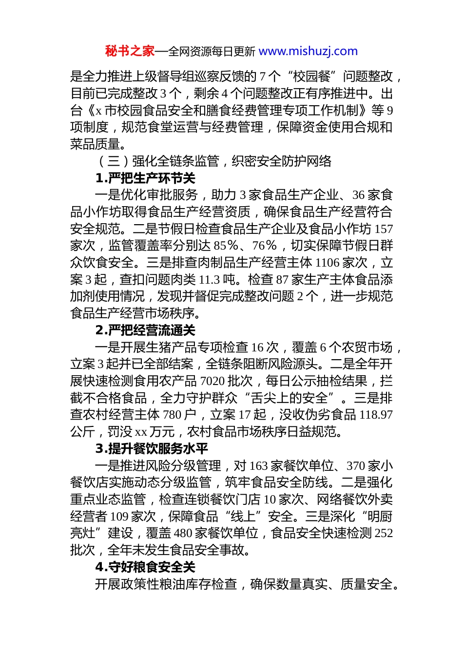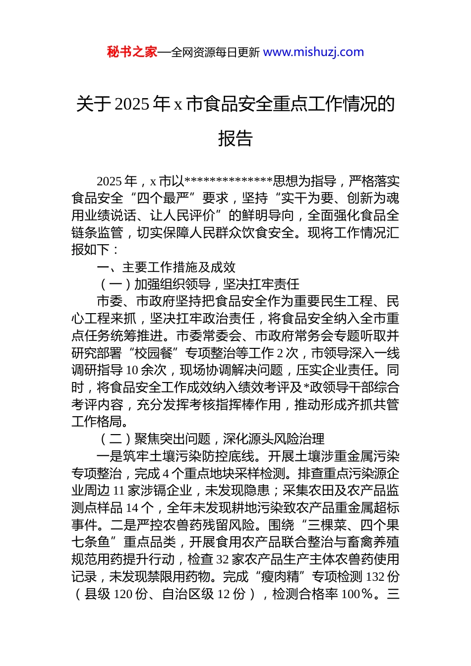 秘书之家—全网资源每日更新 www.mishuzj.com关于 2025 年 x 市食品安全重点工作情况的报告2025 年,x 市以**************思想为指导,严格落实食品安全“四个最严”要求,坚持“实干为要、创新为魂用业绩说话、让人民评价”的鲜明导向,全面强化食品全链条监管,切实保障人民群众饮食安全。现将工作情况汇报如下:一、主要工作措施及成效(一)加强组织领导,坚决扛牢责任市委、市政府坚持把食品安全作为重要民生工程、民心工程来抓,坚决扛牢政治责任,将食品安全纳入全市重点任务统筹推进。市委常委会、市政府常务会专题听取并研究部署“校园餐”专项整治等工作 2 次,市领导深入一线调研指导 10 余次,现场协调解决问题,压实企业责任。同时,将食品安全工作成效纳入绩效考评及*政领导干部综合考评内容,充分发挥考核指挥棒作用,推动形成齐抓共管工作格局。(二)聚焦突出问题,深化源头风险治理一是筑牢土壤污染防控底线。开展土壤涉重金属污染专项整治,完成 4 个重点地块采样检测。排查重点污染源企业周边 11 家涉镉企业,未发现隐患;采集农田及农产品监测点样品 14 个,全年未发现耕地污染致农产品重金属超标事件。二是严控农兽药残留风险。围绕“三棵菜、四个果七条鱼”重点品类,开展食用农产品联合整治与畜禽养殖规范用药提升行动,检查 32 家农产品生产主体农兽药使用记录,未发现禁限用药物。完成“瘦肉精”专项检测 132 份(县级 120 份、自治区级 12 份),检测合格率 100%。三秘书之家—全网资源每日更新 www.mishuzj.com是全力推进上级督导组巡察反馈的 7 个“校园餐”问题整改,目前已完成整改 3 个,剩余 4 个问题整改正有序推进中。出台《x 市校园食品安全和膳食经费管理专项工作机制》等 9项制度,规范食堂运营与经费管理,保障资金使用合规和菜品质量。(三)强化全链条监管,织密安全防护网络1.严把生产环节关一是优化审批服务,助力 3 家食品生产企业、36 家食品小作坊取得食品生产经营资质,确保食品生产经营符合安全规范。二是节假日检查食品生产企业及食品小作坊 157家次,监管覆盖率分别达 85%、76%,切实保障节假日群众饮食安全。三是排查肉制品生产经营主体 1106 家次,立案 3 起,查扣问题肉类 11.3 吨。检查 87 家生产主体食品添加剂使用情况,发现并督促完成整改问题 2 个,进一步规范食品生产经营市场秩序。2.严把经营流通关一是开展生猪产品专项检查 16 次,覆盖 6 个农贸市场,立案 3 起并已全部结案,全链条阻断风险源头。二是全年开展快速检测食用农产品 7020 批次,每日公示抽检结果,拦截不合格食品,全力守护群众“舌尖上的安全”。三是排查农村经营主体 780 户,立案 17 起,没收伪劣食品 118.97公斤,罚没 xx 万元,农村食品市场秩序日益规范。3.提升餐饮服务水平一是推进风险分级管理,对 163 家餐饮单位、370 家小餐饮店实施动态分级监管,筑牢食品安全防线。二是强化重点业态监管,检查连锁餐饮门店 10 家次、网络餐饮外卖经营者 109 家次,保障食品“线上”安全。三是深化“明厨亮灶”建设,覆盖 480 家餐饮单位,食品安全快速检测 252批次,全年未发生食品安全事故。4.守好粮食安全关开展政策性粮油库存检查,确保数量真实、质量安全。秘书之家—全网资源每日更新 www.mishuzj.com落实粮食出入库检测制度,防止不合格粮食流入口粮市场完成夏季、秋季粮食收获环节抽检,保障粮食源头安全。(四)保持高压态势,严惩违法违规行为以“铁拳・桂在真打”行动为抓手,推进跨部门联合监管与信用联合奖惩。全年查处走私牛肉制品案件 1 起,涉案牛肉 7.7 吨。健全“守信激励、失信惩戒”机制,公示所有食品安全案件,发挥警示教育作用。(五)提升监管能力,夯实安全治理基础一是提升基层监管硬件,积极争取资金建成四星市场监管所 2 个、三星所 1 个,提升基层执法能力。二是推进智慧监管应用,全市 35 所学校食堂实现“互联网+明厨亮灶+ai”全覆盖,优化线上巡查与问题预警功能;三是推动“牧运通—桂”“桂食安”平台衔接,指导农贸市场...