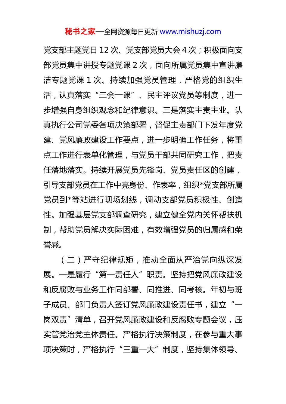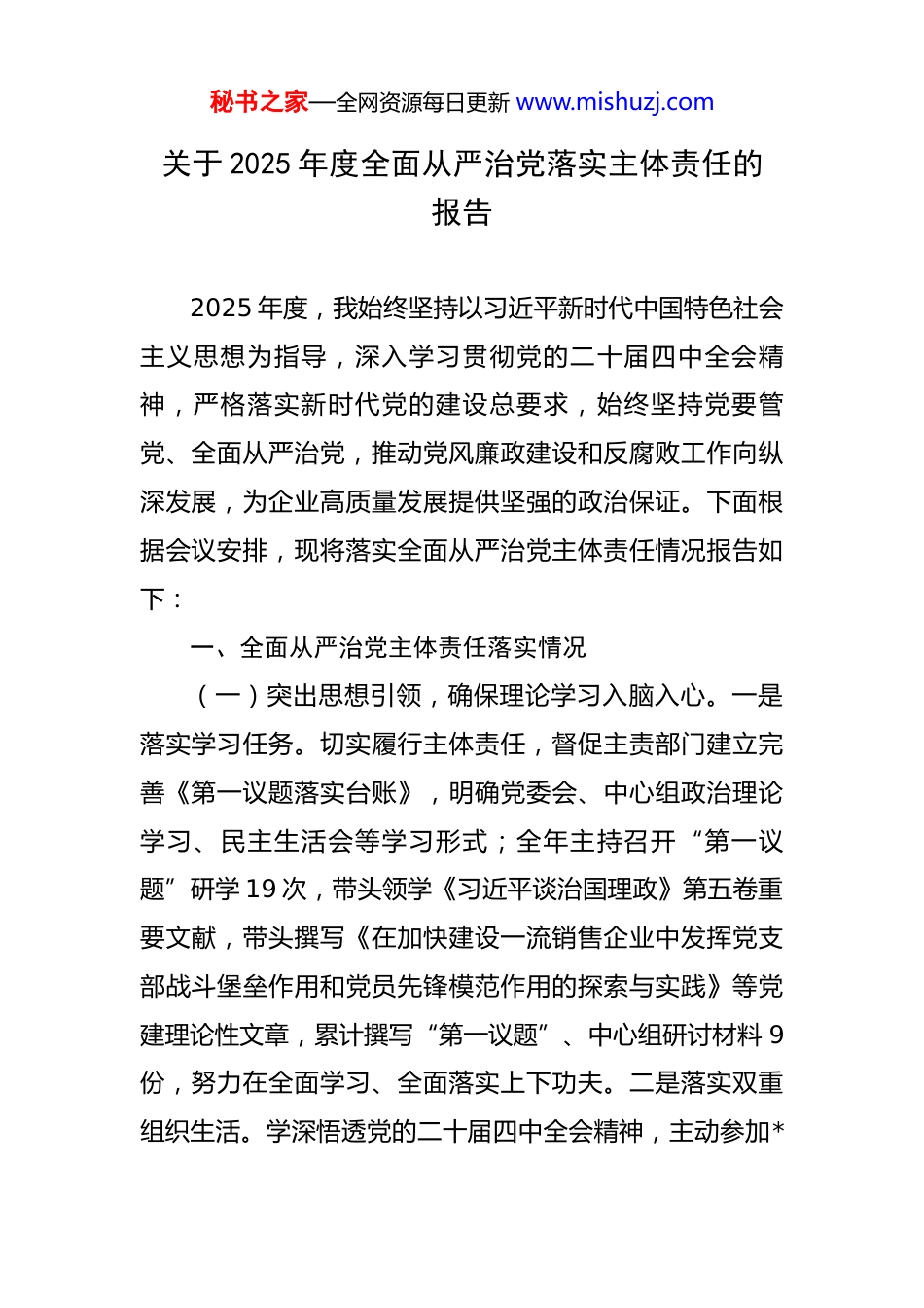 秘书之家—全网资源每日更新 www.mishuzj.com关于 2025 年度全面从严治党落实主体责任的报告 2025 年度,我始终坚持以习近平新时代中国特色社会主义思想为指导,深入学习贯彻党的二十届四中全会精神,严格落实新时代党的建设总要求,始终坚持党要管党、全面从严治党,推动党风廉政建设和反腐败工作向纵深发展,为企业高质量发展提供坚强的政治保证。下面根据会议安排,现将落实全面从严治党主体责任情况报告如下:一、全面从严治党主体责任落实情况(一)突出思想引领,确保理论学习入脑入心。一是落实学习任务。切实履行主体责任,督促主责部门建立完善《第一议题落实台账》,明确党委会、中心组政治理论学习、民主生活会等学习形式;全年主持召开“第一议题”研学 19 次,带头领学《习近平谈治国理政》第五卷重要文献,带头撰写《在加快建设一流销售企业中发挥党支部战斗堡垒作用和党员先锋模范作用的探索与实践》等党建理论性文章,累计撰写“第一议题”、中心组研讨材料 9份,努力在全面学习、全面落实上下功夫。二是落实双重组织生活。学深悟透党的二十届四中全会精神,主动参加*秘书之家—全网资源每日更新 www.mishuzj.com党支部主题党日 12 次、党支部党员大会 4 次;积极面向支部党员集中讲授专题党课 2 次,面向所属党员集中宣讲廉洁专题党课 1 次。持续加强党员管理,严格党的组织生活,认真落实“三会一课”、民主评议党员等制度,进一步增强自身组织观念和纪律意识。三是落实主责主业。认真执行公司党委各项决策部署,督促主责部门下发年度党建、党风廉政建设工作要点,进一步明确工作任务,将重点工作进行表单化管理,与党员干部共同研究工作,把责任落地落实。持续开展党员先锋岗、党员责任区的创建,引导支部党员在工作中亮身份、作表率,组织*党支部所属党员到*等站进行现场划线,调动支部党员积极性、创造性。加强基层党支部调查研究,建立健全党内关怀帮扶机制,帮助党员解决实际困难,有效增强党员的归属感和荣誉感。(二)严守纪律规矩,推动全面从严治党向纵深发展。一是履行“第一责任人”职责。坚持把党风廉政建设和反腐败与业务工作同部署、同推进、同考核。年初与班子成员、部门负责人签订党风廉政建设责任书,建立“一岗双责”清单,召开党风廉政建设和反腐败专题会议,压实管党治党主体责任。严格执行决策制度,在参与重大事项决策时,严格执行“三重一大”制度,坚持集体领导、秘书之家—全网资源每日更新 www.mishuzj.com民主决策,不搞个人说了算。对涉及企业发展、人事任免、投资大额资金使用等重大事项,均提报至党委会集体讨论,充分听取意见,确保决策的规范性、科学性,从制度上防止权力滥用。二是坚决落实中央八项规定精神。严格规范公务接待、公车使用、办公用房等方面的行为,坚决抵制形式主义、官僚主义、享乐主义和奢靡之风。建立规范对外的协调沟通机制,组织机关、片区、纪检干部集中到*监狱开展警示教育,聆听服刑人员现身说法,引导各级管理人员筑牢拒腐防变底线、红线,努力营造风清气正的工作氛围。三是持续强化风险防控。根据销售企业的特点,定期督促主责部门排查廉洁风险,制定落实防控措施,积极听取一体化巡察整改专项报告,亲自部署“三基”自查工作,对涉及人、财、物等关键环节,建立健全相互监督、相互制约的工作机制,从源头预防腐败问题的发生。自身不仅在八小时内担当作为,在八小时外生活中,注重家风家教、以身作则,教育引导中层干部树立正确的世界观、人生观、价值观。严格要求身边工作人员自觉遵守党纪党规,定期提醒身边工作人员不得利用职权和影响谋取不正当利益,对机关工作人员持续加强廉洁教育,共同维护个人良好形象。(三)强化意识形态,持续增强舆情风险防范能力。秘书之家—全网资源每日更新 www.mishuzj.com一是妥善处理突发事件。建立健全舆情管控机制,发挥机关监控中心积极作用,构建 24 小时舆情监测体系,密切关注重大网络舆情动态,切实做到及时发现、收集、整理信息;妥善处理刊江站非亡人生产事故突发事件,积极与上级公司主管领导和主责部室进行对接,启动应急预案,委...