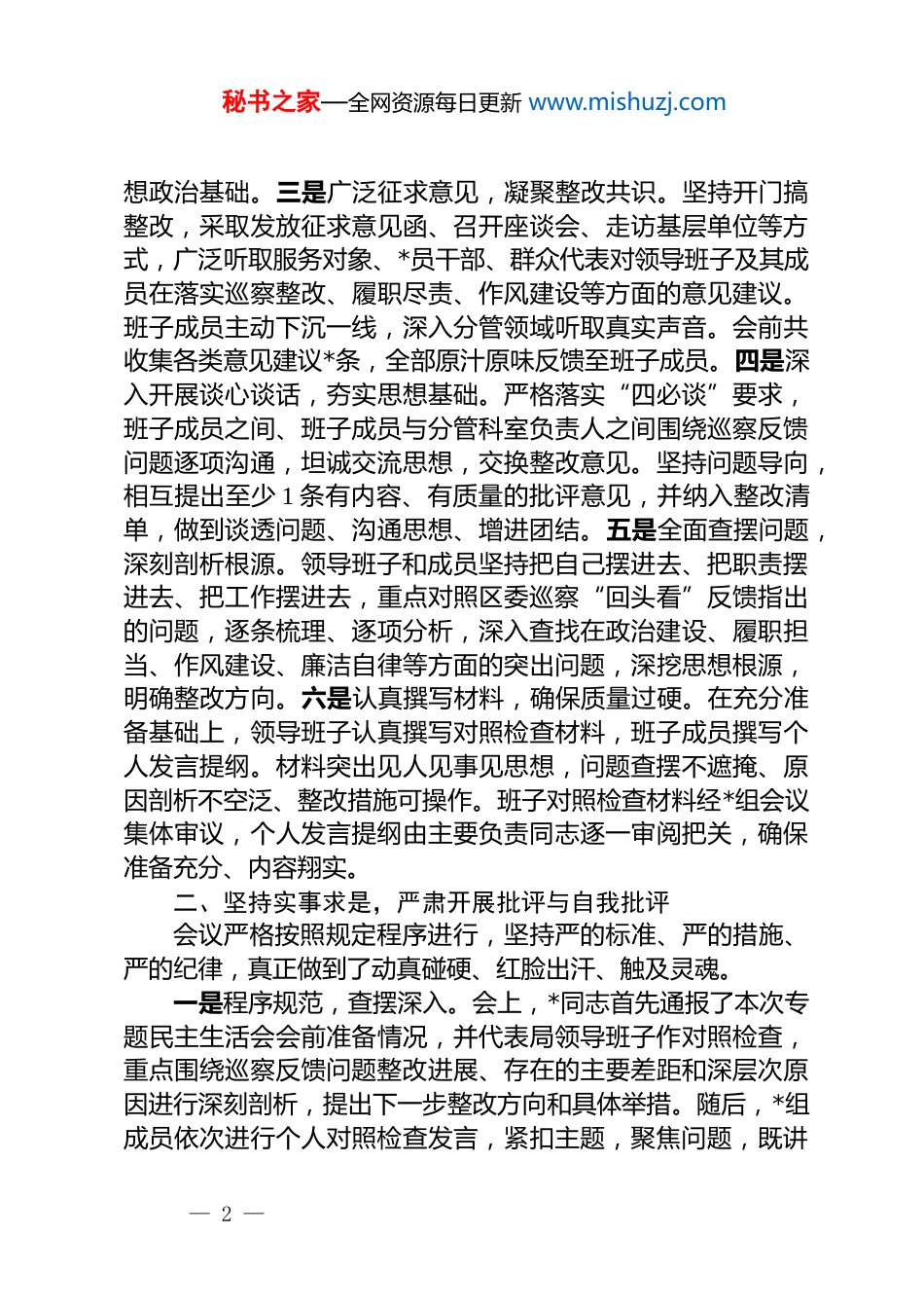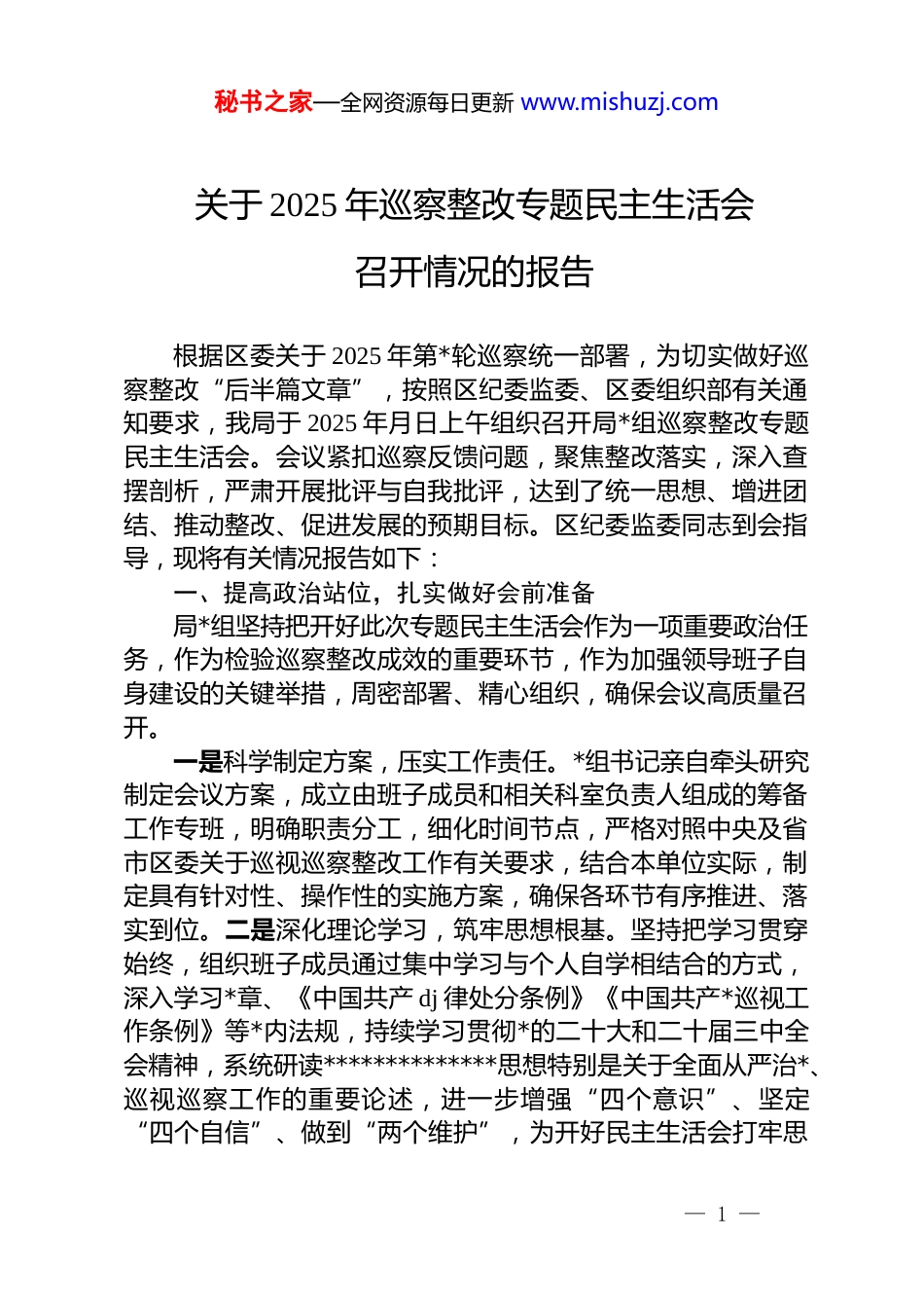 秘书之家—全网资源每日更新 www.mishuzj.com关于 2025 年巡察整改专题民主生活会召开情况的报告根据区委关于 2025 年第*轮巡察统一部署,为切实做好巡察整改“后半篇文章”,按照区纪委监委、区委组织部有关通知要求,我局于 2025 年月日上午组织召开局*组巡察整改专题民主生活会。会议紧扣巡察反馈问题,聚焦整改落实,深入查摆剖析,严肃开展批评与自我批评,达到了统一思想、增进团结、推动整改、促进发展的预期目标。区纪委监委同志到会指导,现将有关情况报告如下:一、提高政治站位,扎实做好会前准备局*组坚持把开好此次专题民主生活会作为一项重要政治任务,作为检验巡察整改成效的重要环节,作为加强领导班子自身建设的关键举措,周密部署、精心组织,确保会议高质量召开。一是科学制定方案,压实工作责任。*组书记亲自牵头研究制定会议方案,成立由班子成员和相关科室负责人组成的筹备工作专班,明确职责分工,细化时间节点,严格对照中央及省市区委关于巡视巡察整改工作有关要求,结合本单位实际,制定具有针对性、操作性的实施方案,确保各环节有序推进、落实到位。二是深化理论学习,筑牢思想根基。坚持把学习贯穿始终,组织班子成员通过集中学习与个人自学相结合的方式,深入学习*章、《中国共产 dj 律处分条例》《中国共产*巡视工作条例》等*内法规,持续学习贯彻*的二十大和二十届三中全会精神,系统研读**************思想特别是关于全面从严治*、巡视巡察工作的重要论述,进一步增强“四个意识”、坚定“四个自信”、做到“两个维护”,为开好民主生活会打牢思— 1 —秘书之家—全网资源每日更新 www.mishuzj.com想政治基础。三是广泛征求意见,凝聚整改共识。坚持开门搞整改,采取发放征求意见函、召开座谈会、走访基层单位等方式,广泛听取服务对象、*员干部、群众代表对领导班子及其成员在落实巡察整改、履职尽责、作风建设等方面的意见建议。班子成员主动下沉一线,深入分管领域听取真实声音。会前共收集各类意见建议*条,全部原汁原味反馈至班子成员。四是深入开展谈心谈话,夯实思想基础。严格落实“四必谈”要求,班子成员之间、班子成员与分管科室负责人之间围绕巡察反馈问题逐项沟通,坦诚交流思想,交换整改意见。坚持问题导向,相互提出至少 1 条有内容、有质量的批评意见,并纳入整改清单,做到谈透问题、沟通思想、增进团结。五是全面查摆问题,深刻剖析根源。领导班子和成员坚持把自己摆进去、把职责摆进去、把工作摆进去,重点对照区委巡察“回头看”反馈指出的问题,逐条梳理、逐项分析,深入查找在政治建设、履职担当、作风建设、廉洁自律等方面的突出问题,深挖思想根源,明确整改方向。六是认真撰写材料,确保质量过硬。在充分准备基础上,领导班子认真撰写对照检查材料,班子成员撰写个人发言提纲。材料突出见人见事见思想,问题查摆不遮掩、原因剖析不空泛、整改措施可操作。班子对照检查材料经*组会议集体审议,个人发言提纲由主要负责同志逐一审阅把关,确保准备充分、内容翔实。二、坚持实事求是,严肃开展批评与自我批评会议严格按照规定程序进行,坚持严的标准、严的措施、严的纪律,真正做到了动真碰硬、红脸出汗、触及灵魂。一是程序规范,查摆深入。会上,*同志首先通报了本次专题民主生活会会前准备情况,并代表局领导班子作对照检查,重点围绕巡察反馈问题整改进展、存在的主要差距和深层次原因进行深刻剖析,提出下一步整改方向和具体举措。随后,*组成员依次进行个人对照检查发言,紧扣主题,聚焦问题,既讲— 2 —秘书之家—全网资源每日更新 www.mishuzj.com自身短板,也谈履职弱项;既查具体表现,也析思想根源。自我批评敢于揭短亮丑,不回避矛盾,不推卸责任,体现了刀刃向内的勇气。相互批评直截了当、开诚布公,真点问题、点真问题,既有辣味又不失团结,达到了“团结—批评—团结”的目的。二是点评精准,指导有力。区纪委监委列席同志对会议情况进行点评,充分肯定本次专题民主生活会准备充分、主题鲜明、查摆深入、批评诚恳,是一次高质量的*内政治生活实践。认为会议坚持问题导向,聚焦巡察整改...