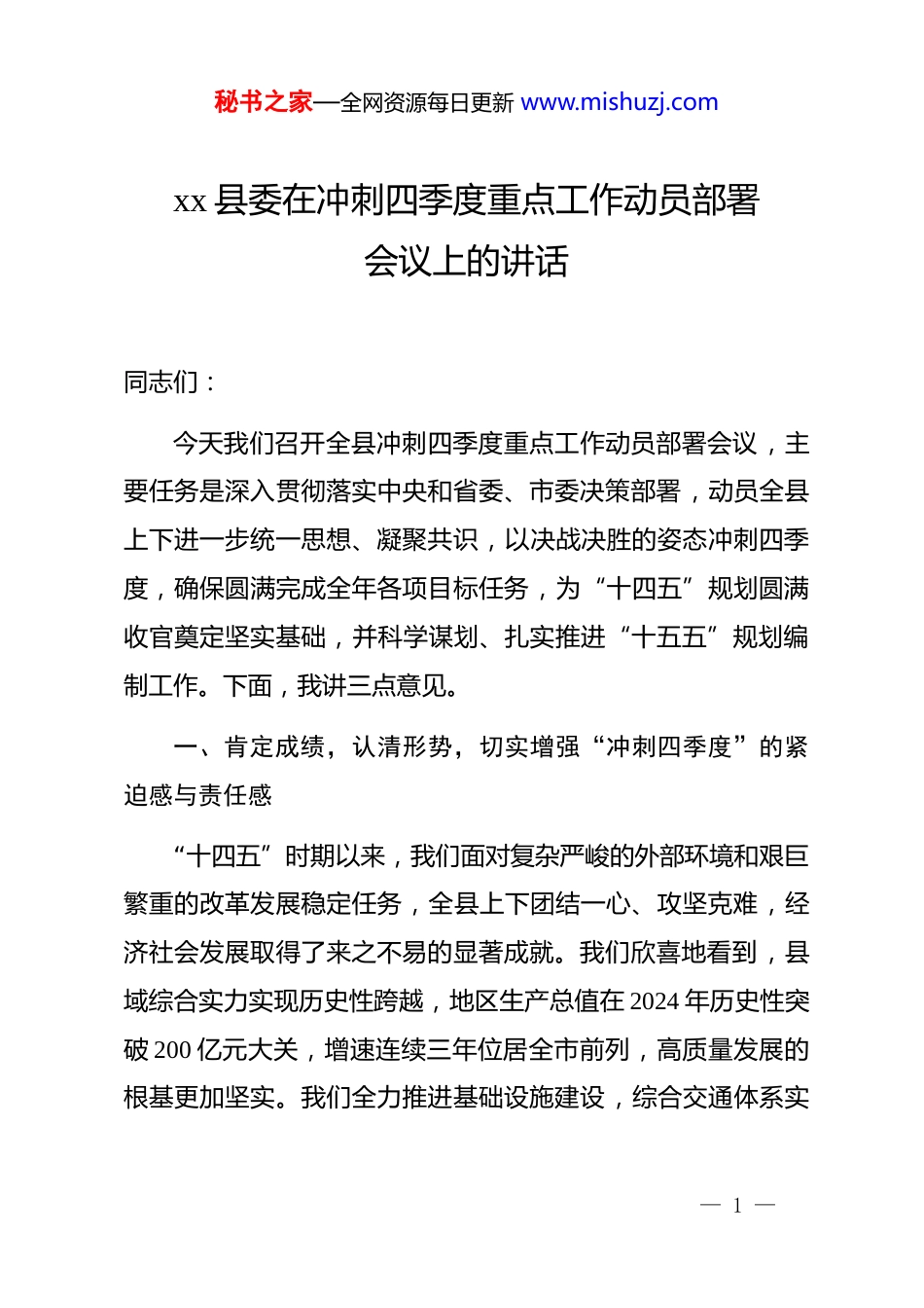 秘书之家—全网资源每日更新 www.mishuzj.comxx 县委在冲刺四季度重点工作动员部署会议上的讲话同志们:今天我们召开全县冲刺四季度重点工作动员部署会议,主要任务是深入贯彻落实中央和省委、市委决策部署,动员全县上下进一步统一思想、凝聚共识,以决战决胜的姿态冲刺四季度,确保圆满完成全年各项目标任务,为“十四五”规划圆满收官奠定坚实基础,并科学谋划、扎实推进“十五五”规划编制工作。下面,我讲三点意见。一、肯定成绩,认清形势,切实增强“冲刺四季度”的紧迫感与责任感“十四五”时期以来,我们面对复杂严峻的外部环境和艰巨繁重的改革发展稳定任务,全县上下团结一心、攻坚克难,经济社会发展取得了来之不易的显著成就。我们欣喜地看到,县域综合实力实现历史性跨越,地区生产总值在 2024 年历史性突破 200 亿元大关,增速连续三年位居全市前列,高质量发展的根基更加坚实。我们全力推进基础设施建设,综合交通体系实— 1 —秘书之家—全网资源每日更新 www.mishuzj.com现从“有”到“优”的蝶变,xx、xx 等高速公路建成通车,新增高速公路里程位居全市第一,内联外畅的格局基本形成。我们着力构建现代化水安全保障网,xx 水库等重大水利工程加快推进,一批农村供水工程建成使用,人民群众的饮水安全得到更坚实的保障。这些成就的取得,是全县广大干部群众拼搏实干、艰苦奋斗的结果,为我们打好收官之战注入了强大的信心和底气。在肯定成绩的同时,我们必须清醒地认识到,当前已进入全年工作的最后冲刺阶段,时间极其紧迫,任务异常艰巨。四季度是定全年、保全局的决战期,也是承上启下、谋划未来的关键期。做好四季度工作,不仅关系到我们能否全面完成年度既定目标,更关系到“十四五”规划的圆满收官,关系到“十五五”规划的科学布局。对标全年 gdp 增长 5%以上、固定资产投资增长 10%以上、一般公共预算收入增长 3.8%的预期目标,我们一些主要经济指标还有提升空间,部分工作还存在短板弱项。全县各级干部必须迅速破除“等待观望”的消极思想,主动作为;必须牢固树立“破局突围”的创新思维,危中寻机;必须全面强化“统筹兼顾”的大局意识,既抓重点也抓细节。我们必须以“时时放心不下”的责任感和“事事落实到位”的— 2 —秘书之家—全网资源每日更新 www.mishuzj.com执行力,全力以赴投入到这场收官之战中。二、聚焦重点,精准发力,以超常规举措坚决打赢全年目标任务攻坚战做好四季度工作,必须坚持目标导向和问题导向相结合,锚定“高于省市平均水平、各项指标提质进位、各项工作创先争优”的总要求,扭住关键环节,精准施策发力。第一,要全力以赴稳增长、强动能,确保经济运行保持在合理区间。发展是解决一切问题的基础和关键。我们必须把稳增长放在更加突出的位置。要狠抓工业经济这个“压舱石”,聚焦重点产业链,“一链一策”强化要素保障,支持企业开足马力、扩大生产。要紧盯项目投资这个“主引擎”,抢抓当前施工黄金期,加快推进省市县重点项目建设,形成更多实物工作量。要激活消费这个“主引擎”,精心策划促销活动,大力发展文旅融合、假日经济,充分释放消费潜力。各乡镇、各部门要对标对表年度目标,算清时间账、任务账,千方百计把欠账补回来、把进度赶上去,确保主要经济指标实现最好结果。第二,要用心用情保民生、兜底线,持续提升人民群众的获得感幸福感安全感。民生是最大的政治。我们要始终坚持以— 3 —秘书之家—全网资源每日更新 www.mishuzj.com人民为中心的发展思想,将有限的财政资金优先用于保障和改善民生。要聚焦群众“急难愁盼”问题,加快补齐教育、医疗、养老、住房等领域的短板,办好一批群众可感可及的民生实事。要坚决兜牢“三保”底线,严控一般性支出,确保工资按时足额发放、基本民生有效保障、基层机构正常运转。要扎实推进巩固拓展脱贫攻坚成果同乡村振兴有效衔接,持续拓宽群众增收渠道,让发展成果更多更公平惠及全体人民。第三,要坚决守底线、防风险,营造安全稳定的社会发展环境。安全是发展的前提。我们必须牢固树立底线思维,有效防范化解各类风险隐患。要稳妥有序化解政府...