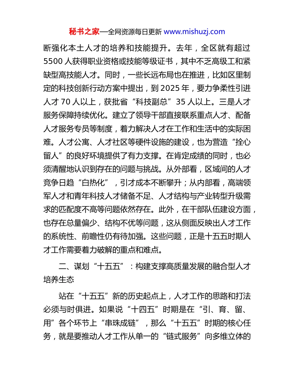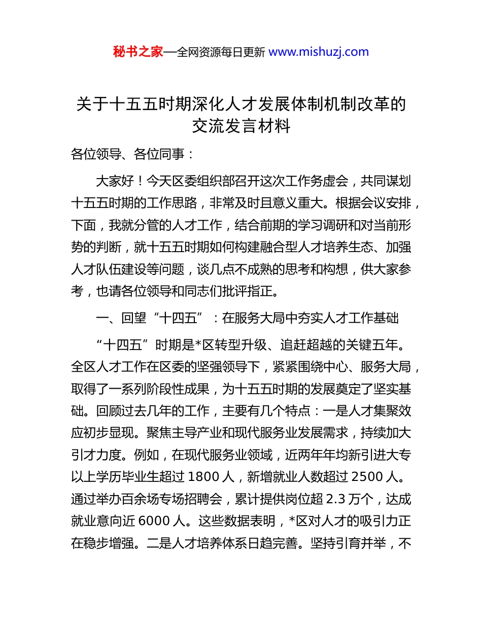 秘书之家—全网资源每日更新 www.mishuzj.com关于十五五时期深化人才发展体制机制改革的交流发言材料各位领导、各位同事:大家好!今天区委组织部召开这次工作务虚会,共同谋划十五五时期的工作思路,非常及时且意义重大。根据会议安排,下面,我就分管的人才工作,结合前期的学习调研和对当前形势的判断,就十五五时期如何构建融合型人才培养生态、加强人才队伍建设等问题,谈几点不成熟的思考和构想,供大家参考,也请各位领导和同志们批评指正。一、回望“十四五”:在服务大局中夯实人才工作基础“十四五”时期是*区转型升级、追赶超越的关键五年。全区人才工作在区委的坚强领导下,紧紧围绕中心、服务大局,取得了一系列阶段性成果,为十五五时期的发展奠定了坚实基础。回顾过去几年的工作,主要有几个特点:一是人才集聚效应初步显现。聚焦主导产业和现代服务业发展需求,持续加大引才力度。例如,在现代服务业领域,近两年年均新引进大专以上学历毕业生超过 1800 人,新增就业人数超过 2500 人。通过举办百余场专场招聘会,累计提供岗位超 2.3 万个,达成就业意向近 6000 人。这些数据表明,*区对人才的吸引力正在稳步增强。二是人才培养体系日趋完善。坚持引育并举,不秘书之家—全网资源每日更新 www.mishuzj.com断强化本土人才的培养和技能提升。去年,全区就有超过5500 人获得职业资格或技能等级证书,其中不乏高级工和紧缺型高技能人才。同时,一些长远布局也在推进,比如区里制定的科技创新行动方案中提出,到 2025 年,要力争柔性引进人才 70 人以上,获批省“科技副总”35 人以上。三是人才服务保障持续优化。建立了领导干部直接联系重点人才、配备人才服务专员等制度,着力解决人才在工作和生活中的实际困难。人才公寓、人才社区等硬件设施的建设,也为营造“拴心留人”的良好环境提供了有力支撑。在肯定成绩的同时,也必须清醒地认识到存在的问题与挑战。从外部看,区域间的人才竞争日趋“白热化”,引才成本不断攀升;从内部看,高端领军人才和青年科技人才储备不足、人才结构与产业转型升级需求的匹配度不高等问题依然存在。此外,在干部队伍建设方面,也存在总量偏少、结构不优等问题,这从侧面反映出人才工作的系统性、前瞻性仍有待加强。这些问题,正是十五五时期人才工作需要着力破解的重点和难点。二、谋划“十五五”:构建支撑高质量发展的融合型人才培养生态站在“十五五”新的历史起点上,人才工作的思路和打法必须与时俱进。如果说“十四五”时期是在“引、育、留、用”各个环节上“串珠成链”,那么“十五五”时期的核心任务,就是要推动人才工作从单一的“链式服务”向多维立体的秘书之家—全网资源每日更新 www.mishuzj.com“生态构建”转型升级。这个“融合型人才培养生态”,其核心要义在于打破壁垒、双向赋能、共生发展。它不再是政府单向度的政策供给,而是要构建一个由“政府引导、产业驱动、教育支撑、市场主导、人才主体”多方参与、互为支撑的有机系统。这与*省层面正在研究的“十五五”时期统筹推进教育科技人才体制机制一体改革的思路是高度契合的。具体而言,这个生态系统包含三个层面的深度融合:第一,产才融合。实现人才链、产业链、创新链的精准对接。人才培养的方向要紧随产业发展的脉搏,产业布局的规划要前瞻性地考虑人才支撑的要素。第二,产教融合。推动教育体系,特别是职业教育和高等教育,与产业需求深度绑定,实现“校园”与“园区”的无缝衔接,让学生所学与企业所需高度一致,从源头上解决人才供给的结构性矛盾。第三,产城融合。将人才发展融入城市发展的整体规划之中。通过完善的城市功能、优质的公共服务、活跃的创新文化,让城市因人才而兴,人才因城市而聚,最终实现人才与城市相互成就、共同成长。构建这样一个生态系统,是应对新一轮区域竞争、培育发展新质生产力的必然选择,也是*区实现更高质量、更可持续发展的战略基石。三、展望新路径:实施三大升级行动,激活人才发展“一池春水”围绕构建“融合型人才培养生态”这一核心目标,初步构想在十五五时期,重点实施三大升级行动。秘书之家—全...