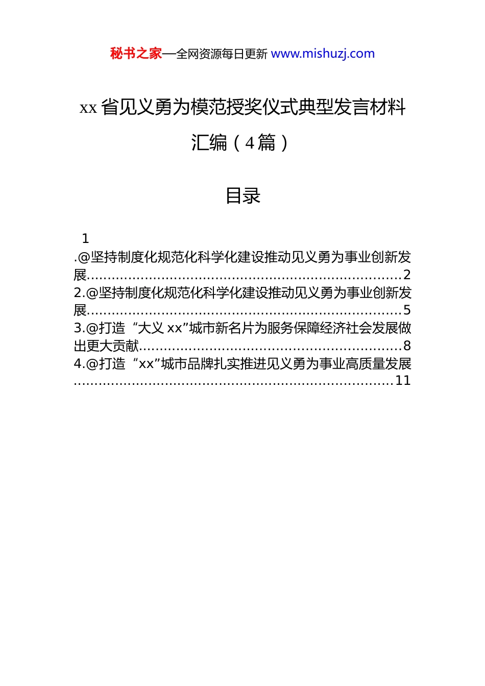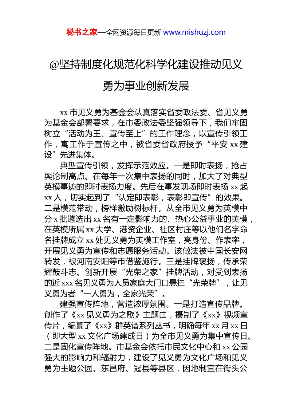 秘书之家—全网资源每日更新 www.mishuzj.comxx 省见义勇为模范授奖仪式典型发言材料汇编(4 篇)目录1.@坚持制度化规范化科学化建设推动见义勇为事业创新发展............................................................................22.@坚持制度化规范化科学化建设推动见义勇为事业创新发展............................................................................53.@打造“大义 xx”城市新名片为服务保障经济社会发展做出更大贡献...............................................................84.@打造“xx”城市品牌扎实推进见义勇为事业高质量发展.............................................................................11秘书之家—全网资源每日更新 www.mishuzj.com@坚持制度化规范化科学化建设推动见义勇为事业创新发展xx 市见义勇为基金会认真落实省委政法委、省见义勇为基金会部署要求,在市委政法委坚强领导下,我们牢固树立“活动为王、宣传至上”的工作理念,以宣传引领工作,寓工作于宣传之中,被省委省政府授予“平安 xx 建设”先进集体。典型宣传引领,发挥示范效应。一是即时表扬,抢占舆论制高点。在每年一次集中表扬的同时,加大了对典型英模事迹的即时表扬力度。先后在事发现场即时表扬 xx 起xx 人,切实起到了“认定即表彰,表彰即宣传”的效果。二是模范带动,榜样激励树标杆。从全市见义勇为英模中分 x 批遴选出 xx 名有一定影响力的、热心公益事业的英模,在英模所属 xx 大学、港资企业、社区村庄等以他们名字命名挂牌成立 xx 处见义勇为英模工作室,亮身份、作表率,开展见义勇为宣传和志愿服务活动。该做法被中国长安网转发,被河南安阳等市借鉴施行。三是挂牌褒扬,传承荣耀鼓斗志。创新开展“光荣之家”挂牌活动,对受到表扬的近 xxx 名见义勇为人员家庭大门口悬挂“光荣牌”,让见义勇为者“一人勇为,全家光荣”。建强宣传阵地,营造浓厚氛围。一是打造宣传品牌。创作了《xx 见义勇为之歌》主题曲,摄制了《xx》视频宣传片,编纂了《xx》群英谱系列丛书,明确每年 xx 月 xx 日(即大型 xx 文化广场建成日)为全市见义勇为集中宣传日。二是固化宣传阵地。市基金会依托市民文化中心和 xx 公园强大的影响力和辐射力,建设了见义勇为文化广场和见义勇为主题公园。东昌府、冠县等县区,因地制宜在街头公秘书之家—全网资源每日更新 www.mishuzj.com园、乡村广场植入见义勇为宣传元素。累计建成见义勇为主题广场(公园)xx 余处。三是构建融媒矩阵。开设了“xx 市见义勇为基金会”“xx”微信公众号、抖音号、头条号,在“新 xx 网”“xx 晚报 xx 融媒中心”累计发布宣传内容 xxxx 余篇次,使正能量拥有了大流量。融合社会力量,汇聚强大合力。一是开展“五进”活动。三年来,组织开展见义勇为宣讲进单位、学校、农村、社区、企业“五进”活动 xxx 余场次。其中 xx 理事长先后为市委党校、xx大学、市委政法系统专题研讨班等进行见义勇为专题义务讲座 xx 余场次。二是凝聚社会力量。联合市政府新闻办公室连续三年召开新闻发布会,联合市文联举办“见义勇为杯”文学征文大赛,联合齐鲁晚报举办“感动 xx——新时代最具影响力十大见义勇为人物”评选活动。依托市图书馆、xx 博物馆、市公安局、市城管局等建立 xx 处见义勇为宣传教育基地、x 处见义勇为宣教点。依托市公交集团,使城乡 xxxx 余辆公交车变成了见义勇为流动工作站。依托市妇联、市卫健委、市教体局等单位联合开展了“慰问巾帼女英模”等系列慰问宣传活动。三是联合媒体宣传。与新闻媒体建立协作机制,全方位挖掘、培树典型,近年来,全国数十家省级以上主流媒体及互联网网站,刊发 xx 市xxx 余篇宣传作品。下步,我们将认真贯彻落实好这次会议特别是 xxx 书记讲话精神,进一步提高政治站位,不断完善工作机制,优化整合资源,深化实践创新,为推进中国式现代化建设 xx实践贡献更多见义勇为力量。秘书之家—全网资源每日更新 www.mishuzj.com@坚持制度化规范化科学化建设推动见义勇为事业创新发展近年来...