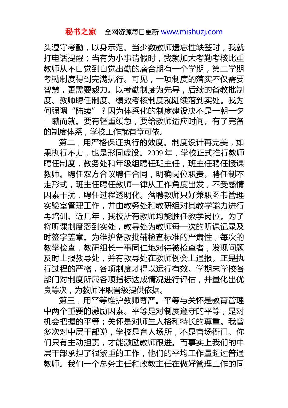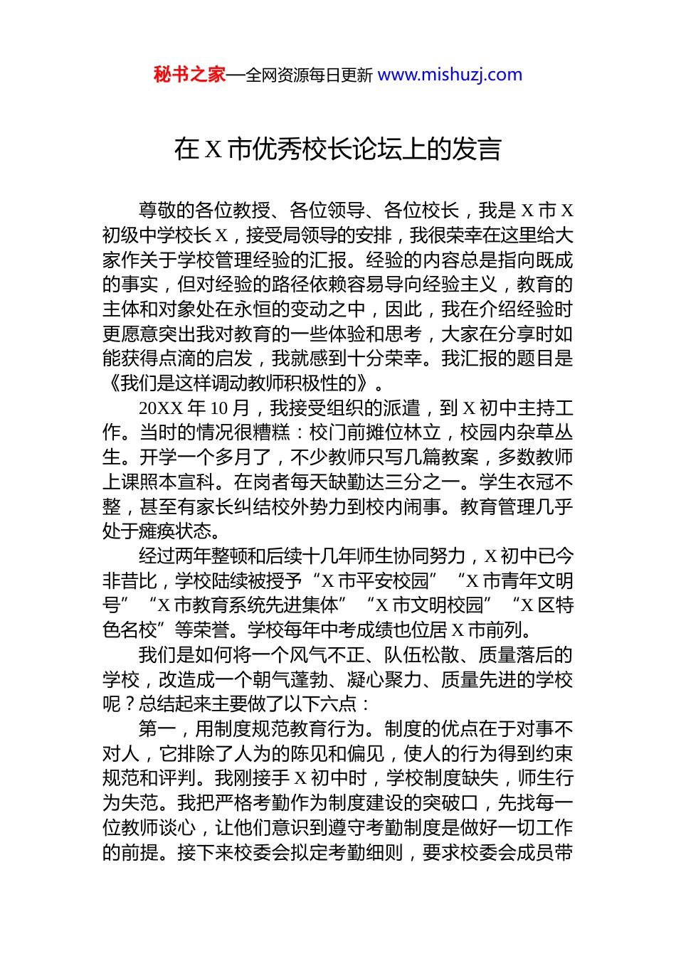 秘书之家—全网资源每日更新 www.mishuzj.com在 X 市优秀校长论坛上的发言尊敬的各位教授、各位领导、各位校长,我是 X 市 X初级中学校长 X,接受局领导的安排,我很荣幸在这里给大家作关于学校管理经验的汇报。经验的内容总是指向既成的事实,但对经验的路径依赖容易导向经验主义,教育的主体和对象处在永恒的变动之中,因此,我在介绍经验时更愿意突出我对教育的一些体验和思考,大家在分享时如能获得点滴的启发,我就感到十分荣幸。我汇报的题目是《我们是这样调动教师积极性的》。20XX 年 10 月,我接受组织的派遣,到 X 初中主持工作。当时的情况很糟糕:校门前摊位林立,校园内杂草丛生。开学一个多月了,不少教师只写几篇教案,多数教师上课照本宣科。在岗者每天缺勤达三分之一。学生衣冠不整,甚至有家长纠结校外势力到校内闹事。教育管理几乎处于瘫痪状态。经过两年整顿和后续十几年师生协同努力,X 初中已今非昔比,学校陆续被授予“X 市平安校园”“X 市青年文明号”“X 市教育系统先进集体”“X 市文明校园”“X 区特色名校”等荣誉。学校每年中考成绩也位居 X 市前列。我们是如何将一个风气不正、队伍松散、质量落后的学校,改造成一个朝气蓬勃、凝心聚力、质量先进的学校呢?总结起来主要做了以下六点:第一,用制度规范教育行为。制度的优点在于对事不对人,它排除了人为的陈见和偏见,使人的行为得到约束规范和评判。我刚接手 X 初中时,学校制度缺失,师生行为失范。我把严格考勤作为制度建设的突破口,先找每一位教师谈心,让他们意识到遵守考勤制度是做好一切工作的前提。接下来校委会拟定考勤细则,要求校委会成员带秘书之家—全网资源每日更新 www.mishuzj.com头遵守考勤,以身示范。当少数教师遗忘性缺签时,我就打电话提醒;当有为小事请假时,我就加大考勤考核比重教师从不自觉到自觉出勤的磨合期有一个学期,第二学期考勤制度得到完满执行。可见,一项制度的落实不仅需要智慧,更需要毅力。以考勤制度为先导,后续的备教批制度、教师聘任制度、绩效考核制度就陆续落到实处。我为何强调“陆续”?因为体系化的制度建设决不是一朝一夕一蹴而就。要有轻重缓急,要给教师适应时间。有了完备的制度体系,学校工作就有章可依。第二,用严格保证执行的效度。制度设计再完美,如果执行不力,也是形同虚设。2009 年,学校正式推行教师聘任制度,教务处和年级组聘任班主任,班主任聘任授课教师。聘任双方合议聘任合同,明确岗位职责。聘任制不走形式,班主任聘任教师一律从工作角度出发,不受感情因素干扰,聘任过程透明化。落聘教师只好兼职图书管理实验室管理工作,并由教务处和教研组对其教学能力进行再培训。近几年,我校所有教师均能胜任教学岗位。为了将听课制度落到实处,教导处为教师每一次的听课记录及时签字盖章。为维护备教批辅检查标准的严肃性,每次的教学检查,教研组长一事同仁地对待被检查者,发现问题及时上报教导处,并有教导处在教师例会上通报。正是执行过程的严格,各项制度才得以运行有效。学期末学校各部门对制度所属各项指标达成情况进行评估,并量化出优良等次,为教师评职晋级提供依据。第三,用平等维护教师尊严。平等与关怀是教育管理中两个重要的激励因素。平等是对制度遵守的平等,是对机会把握的平等;关怀是对师生人格和特长的尊重。我曾多次对中层干部说,学校是育人场所,不是官场衙门。你们只有主动担责,才能激励教师跟进。而事实上我们的中层干部承担了很繁重的工作,他们的平均工作量超过普通教师。我们一个总务主任和政教主任在做好管理工作的同秘书之家—全网资源每日更新 www.mishuzj.com时还担任了年级组长、班主任和两个班的教学工作。在学校里,教育管理工作不可缺少,但教师的身份不能丢,把教师的本职工作做好,就更能赢得师生的尊重。为激励广大教师,学校中层干部总是战斗在教育第一线,他们砥砺躬行,用自己的教育实绩赢得教师的尊重。我们还将这种平等和关怀渗透在日常的每一个细节中,如每周教师例会除非分管领导传达会议提要,其余中层干部与教师都平等地坐在观众席上聆听会议议题。...
