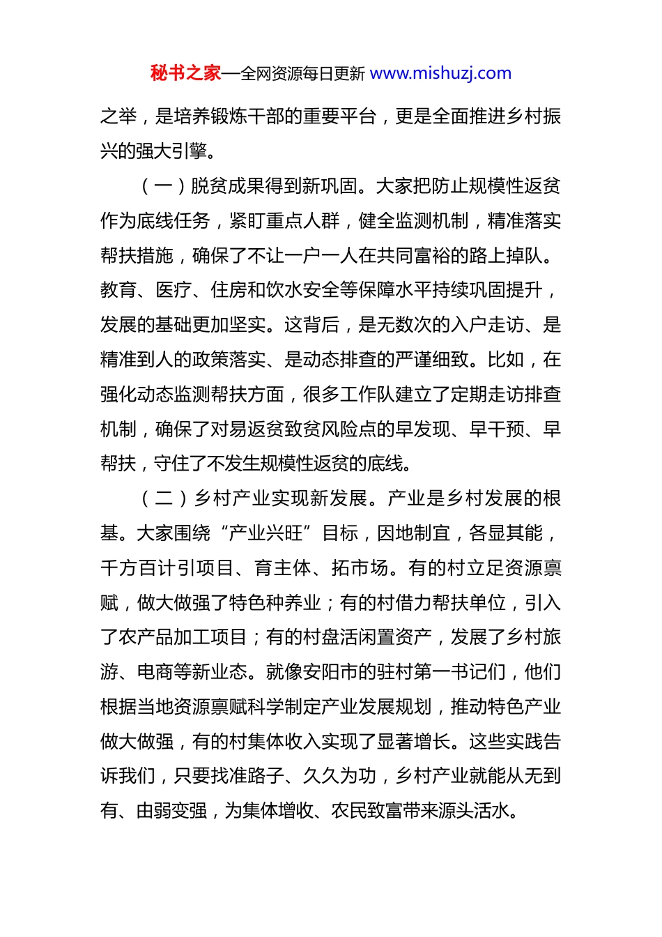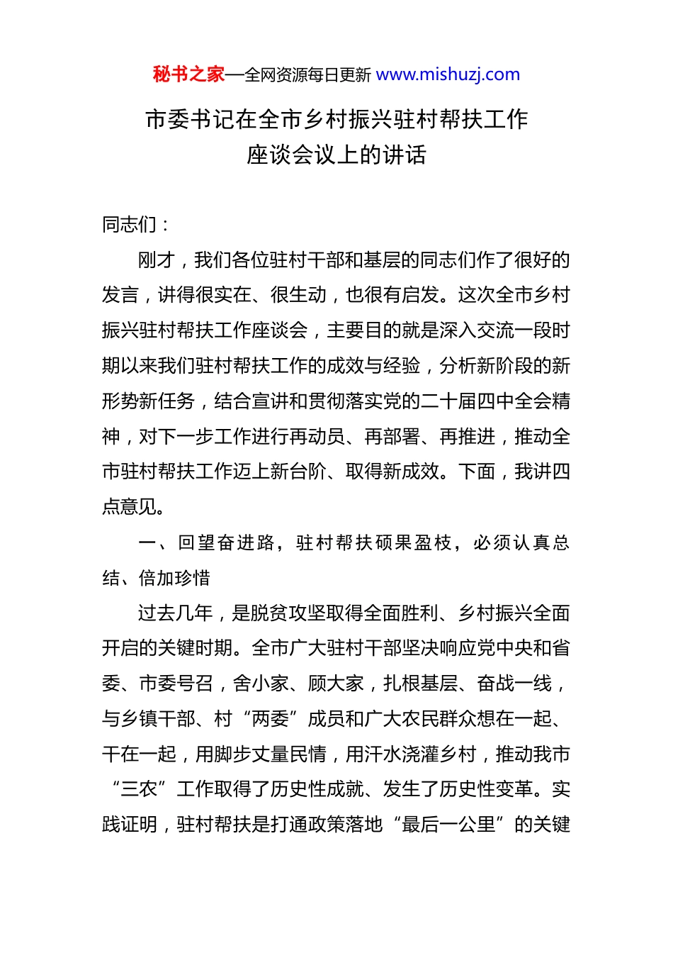 秘书之家—全网资源每日更新 www.mishuzj.com市委书记在全市乡村振兴驻村帮扶工作座谈会议上的讲话 同志们:刚才,我们各位驻村干部和基层的同志们作了很好的发言,讲得很实在、很生动,也很有启发。这次全市乡村振兴驻村帮扶工作座谈会,主要目的就是深入交流一段时期以来我们驻村帮扶工作的成效与经验,分析新阶段的新形势新任务,结合宣讲和贯彻落实党的二十届四中全会精神,对下一步工作进行再动员、再部署、再推进,推动全市驻村帮扶工作迈上新台阶、取得新成效。下面,我讲四点意见。一、回望奋进路,驻村帮扶硕果盈枝,必须认真总结、倍加珍惜过去几年,是脱贫攻坚取得全面胜利、乡村振兴全面开启的关键时期。全市广大驻村干部坚决响应党中央和省委、市委号召,舍小家、顾大家,扎根基层、奋战一线,与乡镇干部、村“两委”成员和广大农民群众想在一起、干在一起,用脚步丈量民情,用汗水浇灌乡村,推动我市“三农”工作取得了历史性成就、发生了历史性变革。实践证明,驻村帮扶是打通政策落地“最后一公里”的关键秘书之家—全网资源每日更新 www.mishuzj.com之举,是培养锻炼干部的重要平台,更是全面推进乡村振兴的强大引擎。(一)脱贫成果得到新巩固。大家把防止规模性返贫作为底线任务,紧盯重点人群,健全监测机制,精准落实帮扶措施,确保了不让一户一人在共同富裕的路上掉队。教育、医疗、住房和饮水安全等保障水平持续巩固提升,发展的基础更加坚实。这背后,是无数次的入户走访、是精准到人的政策落实、是动态排查的严谨细致。比如,在强化动态监测帮扶方面,很多工作队建立了定期走访排查机制,确保了对易返贫致贫风险点的早发现、早干预、早帮扶,守住了不发生规模性返贫的底线。(二)乡村产业实现新发展。产业是乡村发展的根基。大家围绕“产业兴旺”目标,因地制宜,各显其能,千方百计引项目、育主体、拓市场。有的村立足资源禀赋,做大做强了特色种养业;有的村借力帮扶单位,引入了农产品加工项目;有的村盘活闲置资产,发展了乡村旅游、电商等新业态。就像安阳市的驻村第一书记们,他们根据当地资源禀赋科学制定产业发展规划,推动特色产业做大做强,有的村集体收入实现了显著增长。这些实践告诉我们,只要找准路子、久久为功,乡村产业就能从无到有、由弱变强,为集体增收、农民致富带来源头活水。秘书之家—全网资源每日更新 www.mishuzj.com(三)乡村面貌发生新蝶变。大家从群众最急迫、最关心的现实问题入手,积极参与到农村人居环境整治、基础设施建设中。争取资金项目,修路架桥、治污改厕、美化家园,许多村庄告别了“脏乱差”,迎来了“洁净美”。村级活动场所、文化广场、体育设施等从无到有、从有到优,就像有些地方争取资金修整道路、改造旧房,建设党群服务中心,使村庄面貌焕然一新。这种变化,不仅是环境的提升,更是农民生活品质的飞跃,增强了群众的获得感和幸福感。(四)治理效能获得新提升。大家把加强基层组织建设作为帮扶的重中之重,协助乡镇(街道)党(工)委配强村“两委”班子,发展年轻党员,规范组织生活,落实“四议两公开”等制度,基层党组织的战斗堡垒作用更加彰显。同时,深入践行新时代“枫桥经验”,用心用情化解矛盾纠纷,促进邻里和谐、乡风文明。有的驻村工作队还推动建设红色议事厅、农家书屋等,丰富群众文化生活,提升乡村治理水平。正是通过这些扎实的工作,党的执政根基在基层更加牢固,乡村社会保持了和谐稳定的好局面。(五)干部队伍经受新锤炼。驻村帮扶既是任务,也是机遇。广大驻村干部在条件相对艰苦、情况错综复杂的秘书之家—全网资源每日更新 www.mishuzj.com农村一线,经受了风雨,开阔了视野,磨砺了意志,增长了做群众工作、处理复杂问题的本领。正如有的同志所体会到的,越是深入基层,越能理解农民的淳朴真诚,越能看到乡村发展的潜力,自己也越干越有劲、越干越有价值。这支经历过基层淬炼的干部队伍,是我们事业发展的宝贵财富。在肯定成绩的同时,我们也要清醒地看到工作中还存在一些短板和不足,比如,部分村庄产业基础仍较薄弱,可持续发展能力有待增强;乡村治理效能还有提升空...
