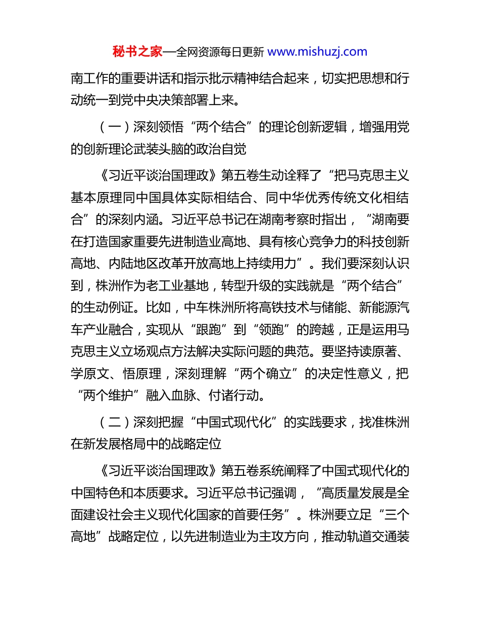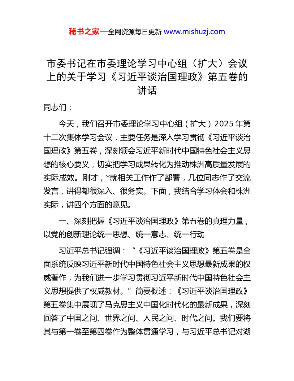 秘书之家—全网资源每日更新 www.mishuzj.com市委书记在市委理论学习中心组(扩大)会议上的关于学习《习近平谈治国理政》第五卷的讲话同志们:今天,我们召开市委理论学习中心组(扩大)2025 年第十二次集体学习会议,主要任务是深入学习贯彻《习近平谈治国理政》第五卷,深刻领会习近平新时代中国特色社会主义思想的核心要义,切实把学习成果转化为推动株洲高质量发展的实际成效。刚才,*就相关工作作了部署,几位同志作了交流发言,讲得都很深入、很务实。下面,我结合学习体会和株洲实际,讲四个方面的意见。一、深刻把握《习近平谈治国理政》第五卷的真理力量,以党的创新理论统一思想、统一意志、统一行动习近平总书记强调:“《习近平谈治国理政》第五卷是全面系统反映习近平新时代中国特色社会主义思想最新成果的权威著作,为我们进一步学习贯彻习近平新时代中国特色社会主义思想提供了权威教材。”简要概述:《习近平谈治国理政》第五卷集中展现了马克思主义中国化时代化的最新成果,深刻回答了中国之问、世界之问、人民之问、时代之问。我们要将其与第一卷至第四卷作为整体贯通学习,与习近平总书记对湖秘书之家—全网资源每日更新 www.mishuzj.com南工作的重要讲话和指示批示精神结合起来,切实把思想和行动统一到党中央决策部署上来。(一)深刻领悟“两个结合”的理论创新逻辑,增强用党的创新理论武装头脑的政治自觉《习近平谈治国理政》第五卷生动诠释了“把马克思主义基本原理同中国具体实际相结合、同中华优秀传统文化相结合”的深刻内涵。习近平总书记在湖南考察时指出,“湖南要在打造国家重要先进制造业高地、具有核心竞争力的科技创新高地、内陆地区改革开放高地上持续用力”。我们要深刻认识到,株洲作为老工业基地,转型升级的实践就是“两个结合”的生动例证。比如,中车株洲所将高铁技术与储能、新能源汽车产业融合,实现从“跟跑”到“领跑”的跨越,正是运用马克思主义立场观点方法解决实际问题的典范。要坚持读原著、学原文、悟原理,深刻理解“两个确立”的决定性意义,把“两个维护”融入血脉、付诸行动。(二)深刻把握“中国式现代化”的实践要求,找准株洲在新发展格局中的战略定位《习近平谈治国理政》第五卷系统阐释了中国式现代化的中国特色和本质要求。习近平总书记强调,“高质量发展是全面建设社会主义现代化国家的首要任务”。株洲要立足“三个高地”战略定位,以先进制造业为主攻方向,推动轨道交通装秘书之家—全网资源每日更新 www.mishuzj.com备、中小航空发动机、北斗时空信息等产业集群向高端化、智能化、绿色化升级。当前,我们正以国家制造业新型技术改造试点为契机,3 年内推动 600 家规上企业数字化改造,轨道交通装备产业规模突破 1700 亿元,北斗产业集群增长34.4%,这些实践正是对中国式现代化“物质文明和精神文明相协调”要求的具体落实。要对标“十四五”收官和“十五五”谋划,把产业优势转化为发展胜势。(三)深刻践行“人民至上”的根本立场,以民生改善检验学习成效《习近平谈治国理政》第五卷始终贯穿以人民为中心的发展思想。习近平总书记指出,“江山就是人民,人民就是江山”。近年来,株洲坚持“开门做工作”,推进“三微六位”民生实事,改造老旧小区 312 个,新增学位 7 万余个,解决了一批群众“急难愁盼”问题。但也要看到,城乡教育医疗资源不均、清水塘片区转型后就业帮扶等问题仍需持续发力。要把学习成果转化为为民服务的实际行动,建立民生实事项目清单管理制度,让发展成果更多更公平惠及全体人民。二、坚持以学促干,以科技创新引领新质生产力发展,推动高质量发展走深走实习近平总书记强调:“科技创新是发展新质生产力的核心要素,要在以科技创新引领产业创新方面下更大功夫。”简要秘书之家—全网资源每日更新 www.mishuzj.com概述:推动高质量发展,关键是加快发展新质生产力。株洲要立足先进制造业优势,以科技创新为引擎,完善产业生态、创新生态、人居生态,打好“十四五”收官战,谋划“十五五”新篇章。(一)聚焦产业升级,构建现代化产业体系习近平总书记在湖南考察时指出...