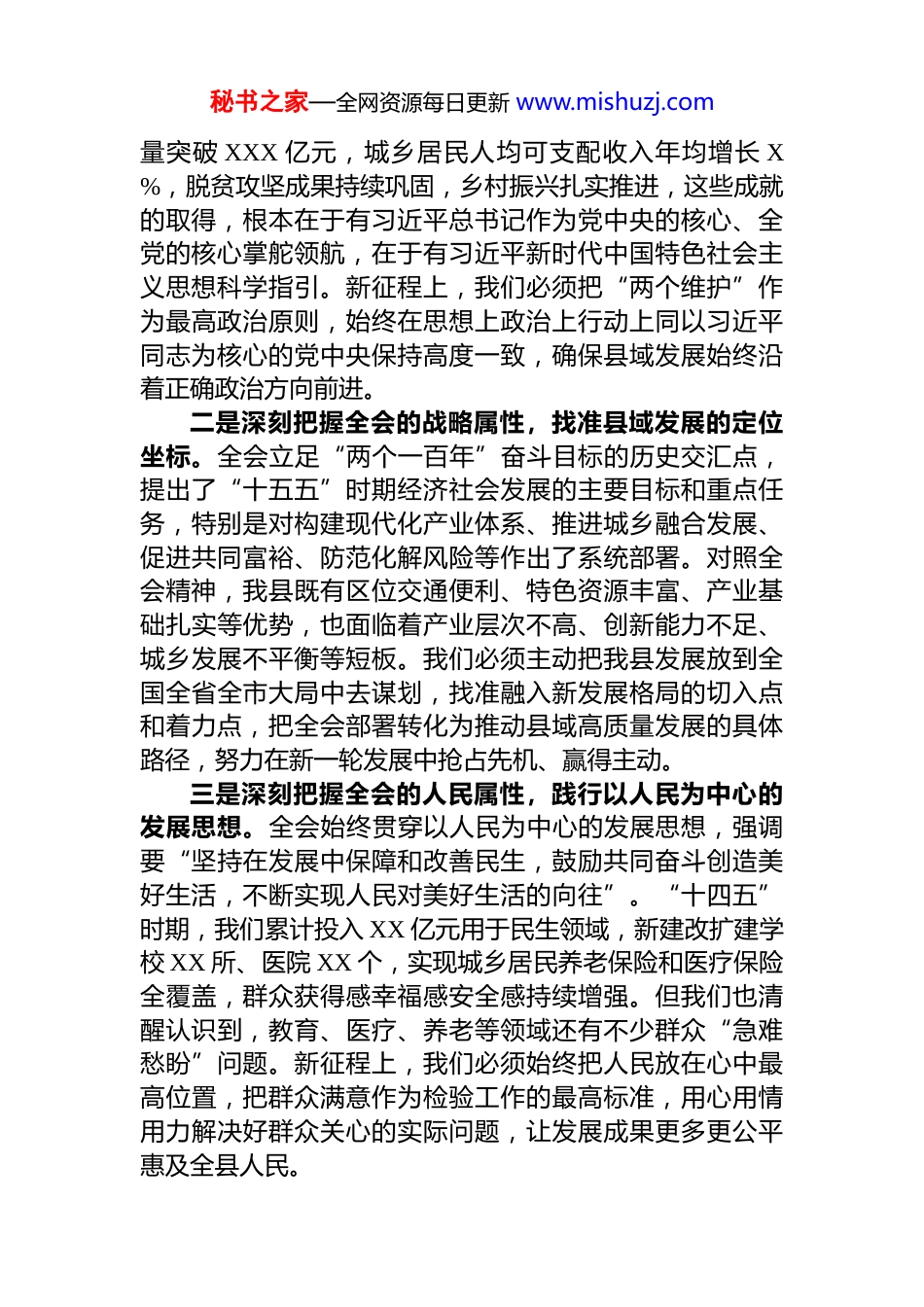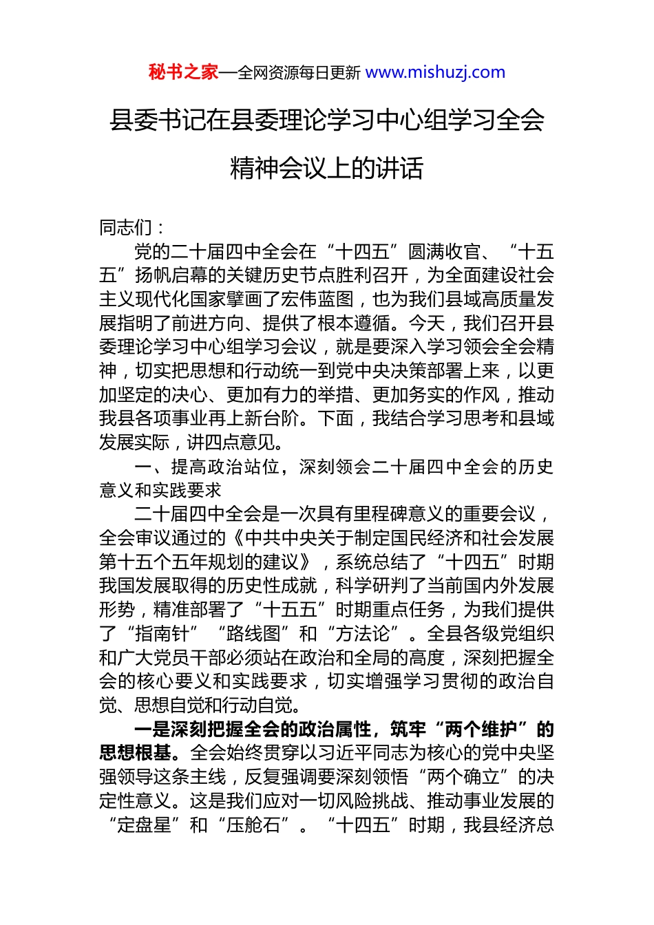 秘书之家—全网资源每日更新 www.mishuzj.com县委书记在县委理论学习中心组学习全会精神会议上的讲话同志们:党的二十届四中全会在“十四五”圆满收官、“十五五”扬帆启幕的关键历史节点胜利召开,为全面建设社会主义现代化国家擘画了宏伟蓝图,也为我们县域高质量发展指明了前进方向、提供了根本遵循。今天,我们召开县委理论学习中心组学习会议,就是要深入学习领会全会精神,切实把思想和行动统一到党中央决策部署上来,以更加坚定的决心、更加有力的举措、更加务实的作风,推动我县各项事业再上新台阶。下面,我结合学习思考和县域发展实际,讲四点意见。一、提高政治站位,深刻领会二十届四中全会的历史意义和实践要求二十届四中全会是一次具有里程碑意义的重要会议,全会审议通过的《中共中央关于制定国民经济和社会发展第十五个五年规划的建议》,系统总结了“十四五”时期我国发展取得的历史性成就,科学研判了当前国内外发展形势,精准部署了“十五五”时期重点任务,为我们提供了“指南针”“路线图”和“方法论”。全县各级党组织和广大党员干部必须站在政治和全局的高度,深刻把握全会的核心要义和实践要求,切实增强学习贯彻的政治自觉、思想自觉和行动自觉。一是深刻把握全会的政治属性,筑牢“两个维护”的思想根基。全会始终贯穿以习近平同志为核心的党中央坚强领导这条主线,反复强调要深刻领悟“两个确立”的决定性意义。这是我们应对一切风险挑战、推动事业发展的“定盘星”和“压舱石”。“十四五”时期,我县经济总秘书之家—全网资源每日更新 www.mishuzj.com量突破 XXX 亿元,城乡居民人均可支配收入年均增长 X%,脱贫攻坚成果持续巩固,乡村振兴扎实推进,这些成就的取得,根本在于有习近平总书记作为党中央的核心、全党的核心掌舵领航,在于有习近平新时代中国特色社会主义思想科学指引。新征程上,我们必须把“两个维护”作为最高政治原则,始终在思想上政治上行动上同以习近平同志为核心的党中央保持高度一致,确保县域发展始终沿着正确政治方向前进。二是深刻把握全会的战略属性,找准县域发展的定位坐标。全会立足“两个一百年”奋斗目标的历史交汇点,提出了“十五五”时期经济社会发展的主要目标和重点任务,特别是对构建现代化产业体系、推进城乡融合发展、促进共同富裕、防范化解风险等作出了系统部署。对照全会精神,我县既有区位交通便利、特色资源丰富、产业基础扎实等优势,也面临着产业层次不高、创新能力不足、城乡发展不平衡等短板。我们必须主动把我县发展放到全国全省全市大局中去谋划,找准融入新发展格局的切入点和着力点,把全会部署转化为推动县域高质量发展的具体路径,努力在新一轮发展中抢占先机、赢得主动。三是深刻把握全会的人民属性,践行以人民为中心的发展思想。全会始终贯穿以人民为中心的发展思想,强调要“坚持在发展中保障和改善民生,鼓励共同奋斗创造美好生活,不断实现人民对美好生活的向往”。“十四五”时期,我们累计投入 XX 亿元用于民生领域,新建改扩建学校 XX 所、医院 XX 个,实现城乡居民养老保险和医疗保险全覆盖,群众获得感幸福感安全感持续增强。但我们也清醒认识到,教育、医疗、养老等领域还有不少群众“急难愁盼”问题。新征程上,我们必须始终把人民放在心中最高位置,把群众满意作为检验工作的最高标准,用心用情用力解决好群众关心的实际问题,让发展成果更多更公平惠及全县人民。秘书之家—全网资源每日更新 www.mishuzj.com四是深刻把握全会的斗争属性,增强防范化解风险的底线思维。全会强调要“增强忧患意识,坚持底线思维,发扬斗争精神,防范化解各类风险挑战,牢牢守住安全发展底线”。当前,我县面临着经济领域的下行压力、社会领域的矛盾纠纷、生态领域的环境风险、意识形态领域的复杂形势等多重挑战。特别是在民营经济发展、信访维稳、安全生产等方面还存在一些隐患。我们必须增强“时时放心不下”的责任感,树牢总体国家安全观,统筹发展和安全,建立健全风险防控体系,及时化解各类风险隐患,为县域发展营造安全稳定的良好环境。二、聚焦重点任务,把全会精神转化为县...