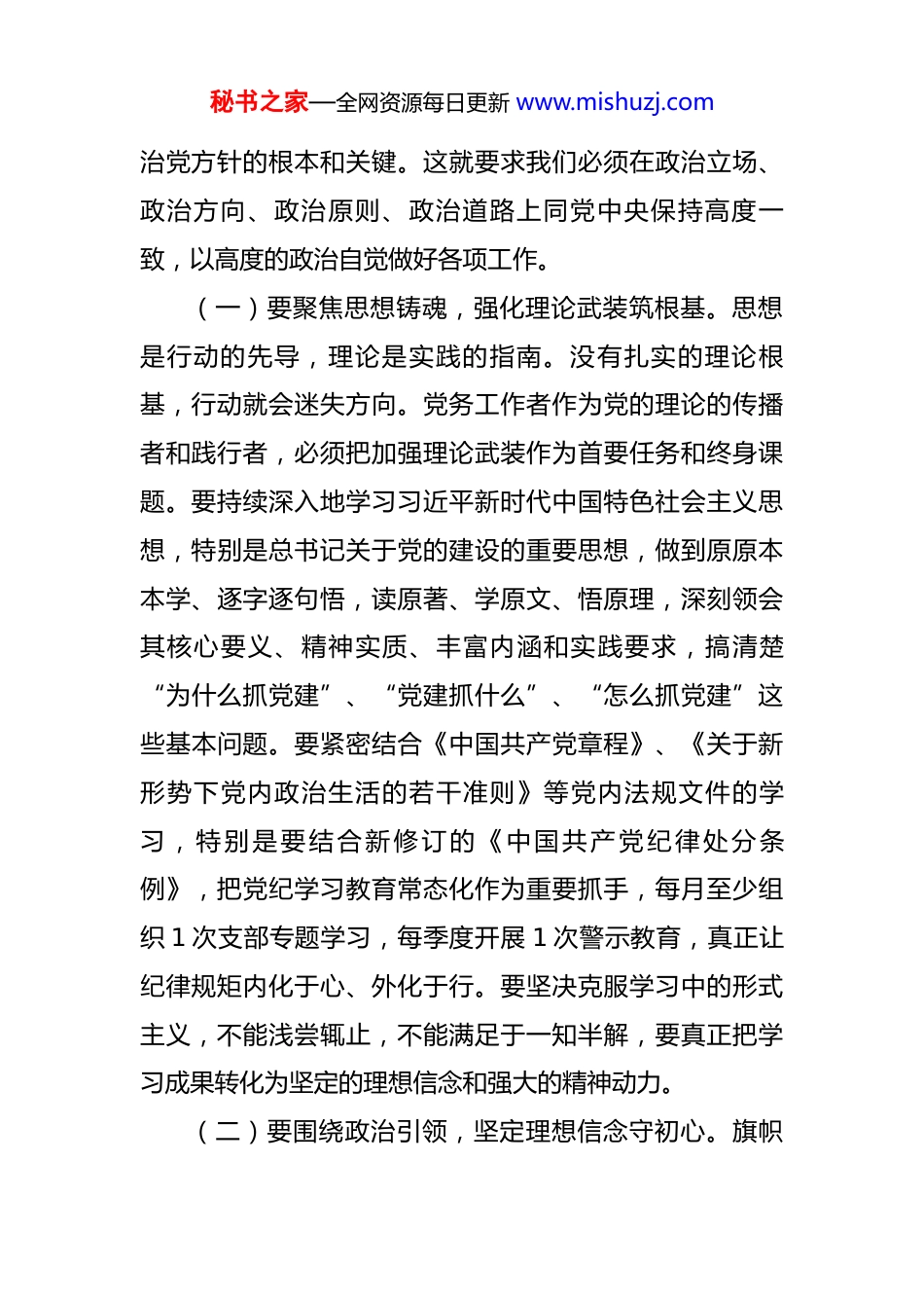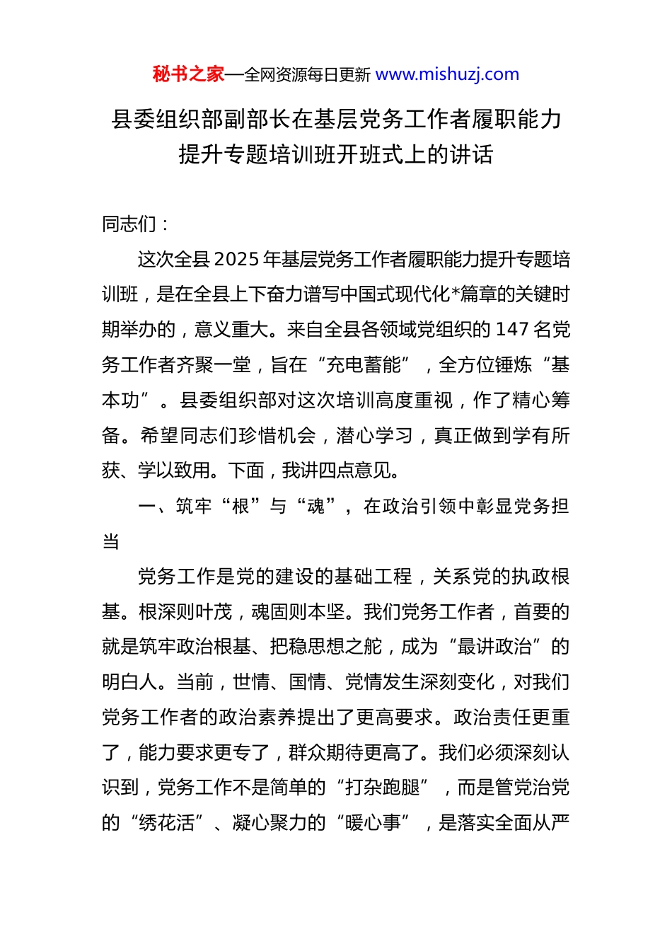 秘书之家—全网资源每日更新 www.mishuzj.com县委组织部副部长在基层党务工作者履职能力提升专题培训班开班式上的讲话 同志们:这次全县 2025 年基层党务工作者履职能力提升专题培训班,是在全县上下奋力谱写中国式现代化*篇章的关键时期举办的,意义重大。来自全县各领域党组织的 147 名党务工作者齐聚一堂,旨在“充电蓄能”,全方位锤炼“基本功”。县委组织部对这次培训高度重视,作了精心筹备。希望同志们珍惜机会,潜心学习,真正做到学有所获、学以致用。下面,我讲四点意见。一、筑牢“根”与“魂”,在政治引领中彰显党务担当党务工作是党的建设的基础工程,关系党的执政根基。根深则叶茂,魂固则本坚。我们党务工作者,首要的就是筑牢政治根基、把稳思想之舵,成为“最讲政治”的明白人。当前,世情、国情、党情发生深刻变化,对我们党务工作者的政治素养提出了更高要求。政治责任更重了,能力要求更专了,群众期待更高了。我们必须深刻认识到,党务工作不是简单的“打杂跑腿”,而是管党治党的“绣花活”、凝心聚力的“暖心事”,是落实全面从严秘书之家—全网资源每日更新 www.mishuzj.com治党方针的根本和关键。这就要求我们必须在政治立场、政治方向、政治原则、政治道路上同党中央保持高度一致,以高度的政治自觉做好各项工作。(一)要聚焦思想铸魂,强化理论武装筑根基。思想是行动的先导,理论是实践的指南。没有扎实的理论根基,行动就会迷失方向。党务工作者作为党的理论的传播者和践行者,必须把加强理论武装作为首要任务和终身课题。要持续深入地学习习近平新时代中国特色社会主义思想,特别是总书记关于党的建设的重要思想,做到原原本本学、逐字逐句悟,读原著、学原文、悟原理,深刻领会其核心要义、精神实质、丰富内涵和实践要求,搞清楚“为什么抓党建”、“党建抓什么”、“怎么抓党建”这些基本问题。要紧密结合《中国共产党章程》、《关于新形势下党内政治生活的若干准则》等党内法规文件的学习,特别是要结合新修订的《中国共产党纪律处分条例》,把党纪学习教育常态化作为重要抓手,每月至少组织 1 次支部专题学习,每季度开展 1 次警示教育,真正让纪律规矩内化于心、外化于行。要坚决克服学习中的形式主义,不能浅尝辄止,不能满足于一知半解,要真正把学习成果转化为坚定的理想信念和强大的精神动力。(二)要围绕政治引领,坚定理想信念守初心。旗帜秘书之家—全网资源每日更新 www.mishuzj.com鲜明讲政治是我们党作为马克思主义政党的根本要求。党务工作者必须时刻绷紧政治这根弦,不断提高政治判断力、政治领悟力、政治执行力。要严格落实“第一议题”制度,对党中央的最新精神和上级党委的部署要求,必须第一时间传达学习、研究贯彻,确保政令畅通、令行禁止。要善于从政治高度观察、分析和处理问题,在制定政策、推进工作、解决矛盾时,首先要从政治上去考量,看是否符合党的政治要求,是否有利于坚持和加强党的全面领导。要带头坚定理想信念,补足精神之“钙”,坚守共产党人的精神追求,用自身的模范行动影响和带动广大党员,引导他们不忘初心、牢记使命,永葆共产党员的先进性和纯洁性。要敢于同各种错误思潮和言行作斗争,坚决维护党的形象和权威,做党的路线方针政策的坚定维护者和忠实执行者。(三)要紧扣党性锤炼,传承红色基因强党性。坚强的党性是党务工作者履职尽责的根本保证。党性不会随着党龄的增长而自然增强,也不会随着职务的升迁而必然强化,必须在严格的党内生活锻炼中不断增强。要带头严格执行“三会一课”、组织生活会、民主评议党员、谈心谈话等基本制度,用好批评和自我批评这个锐利武器,增强党内政治生活的政治性、时代性、原则性、战斗性,使每秘书之家—全网资源每日更新 www.mishuzj.com次党内生活都成为一次淬炼党性的过程。要自觉从党的光辉历史中汲取营养,传承红色基因,赓续红色血脉,不断滋养和锤炼自己的党性心性。要在深入基层、服务群众中锤炼党性,主动到困难大、矛盾多的地方去解决问题,到群众意见集中、工作打不开局面的领域去推动工作,在实践熔炉中百炼成钢。要严守党的政治纪律...
