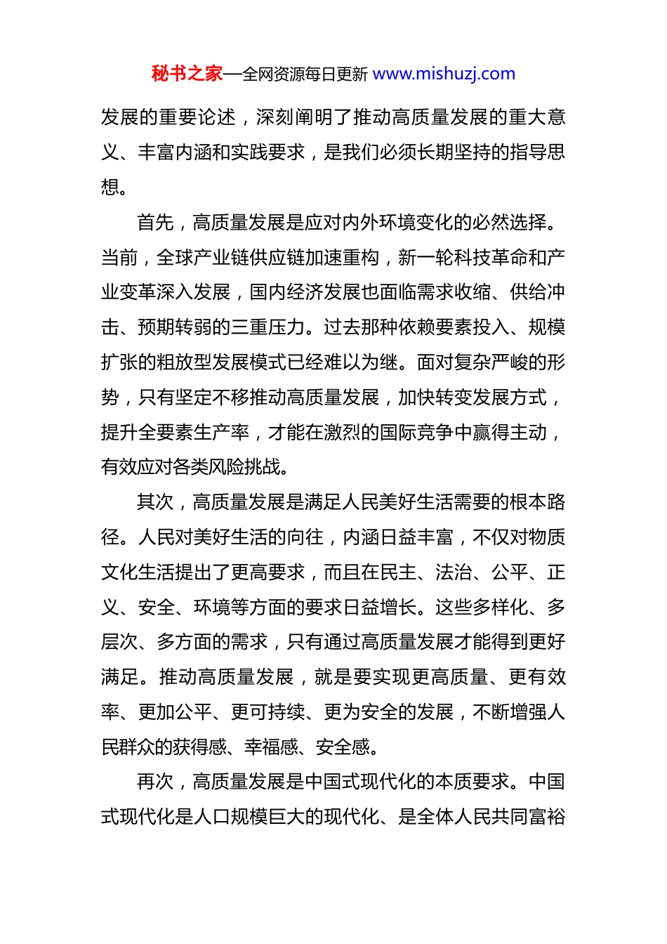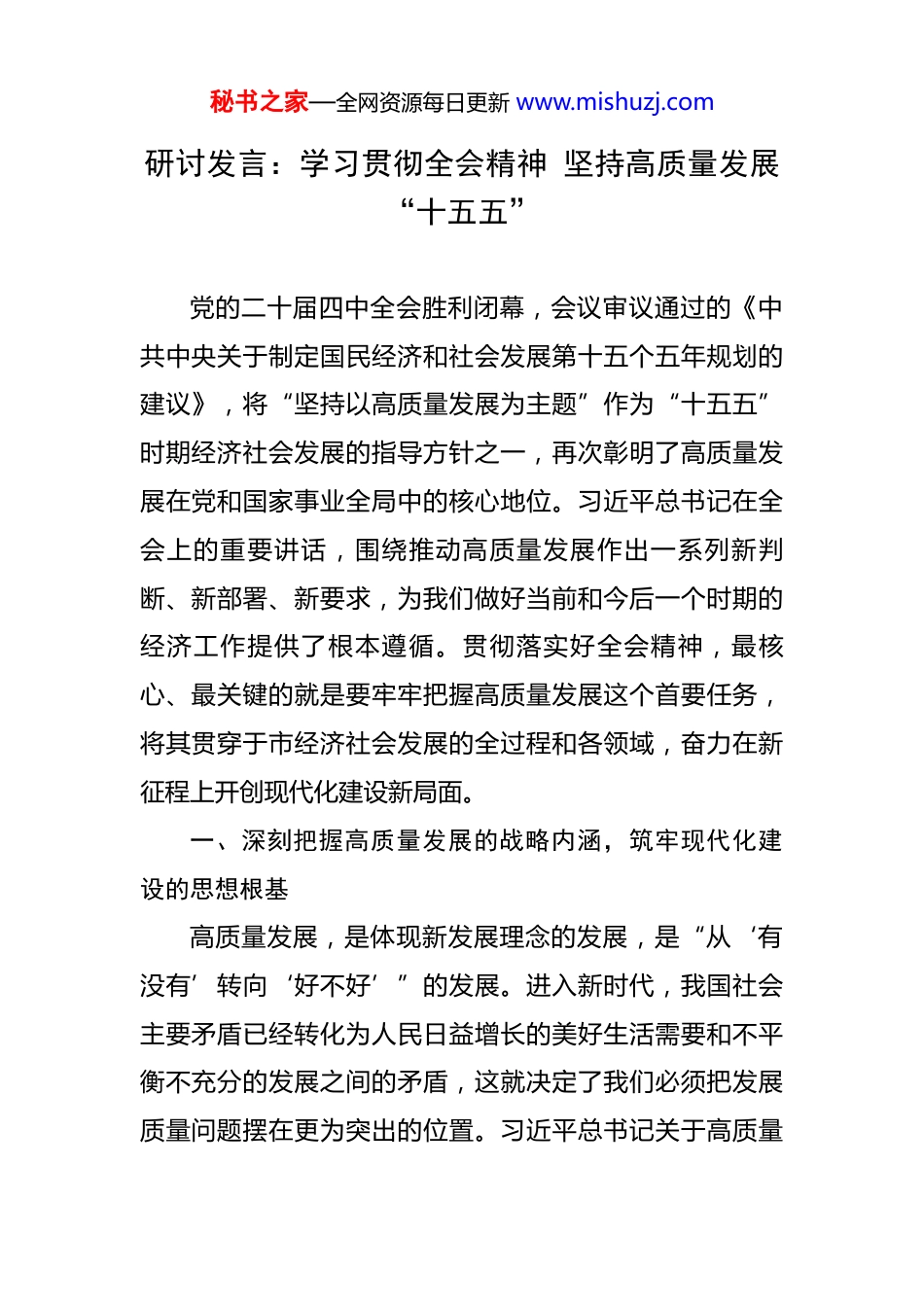 秘书之家—全网资源每日更新 www.mishuzj.com研讨发言:学习贯彻全会精神 坚持高质量发展“十五五” 党的二十届四中全会胜利闭幕,会议审议通过的《中共中央关于制定国民经济和社会发展第十五个五年规划的建议》,将“坚持以高质量发展为主题”作为“十五五”时期经济社会发展的指导方针之一,再次彰明了高质量发展在党和国家事业全局中的核心地位。习近平总书记在全会上的重要讲话,围绕推动高质量发展作出一系列新判断、新部署、新要求,为我们做好当前和今后一个时期的经济工作提供了根本遵循。贯彻落实好全会精神,最核心、最关键的就是要牢牢把握高质量发展这个首要任务,将其贯穿于市经济社会发展的全过程和各领域,奋力在新征程上开创现代化建设新局面。一、深刻把握高质量发展的战略内涵,筑牢现代化建设的思想根基高质量发展,是体现新发展理念的发展,是“从‘有没有’转向‘好不好’”的发展。进入新时代,我国社会主要矛盾已经转化为人民日益增长的美好生活需要和不平衡不充分的发展之间的矛盾,这就决定了我们必须把发展质量问题摆在更为突出的位置。习近平总书记关于高质量秘书之家—全网资源每日更新 www.mishuzj.com发展的重要论述,深刻阐明了推动高质量发展的重大意义、丰富内涵和实践要求,是我们必须长期坚持的指导思想。首先,高质量发展是应对内外环境变化的必然选择。当前,全球产业链供应链加速重构,新一轮科技革命和产业变革深入发展,国内经济发展也面临需求收缩、供给冲击、预期转弱的三重压力。过去那种依赖要素投入、规模扩张的粗放型发展模式已经难以为继。面对复杂严峻的形势,只有坚定不移推动高质量发展,加快转变发展方式,提升全要素生产率,才能在激烈的国际竞争中赢得主动,有效应对各类风险挑战。其次,高质量发展是满足人民美好生活需要的根本路径。人民对美好生活的向往,内涵日益丰富,不仅对物质文化生活提出了更高要求,而且在民主、法治、公平、正义、安全、环境等方面的要求日益增长。这些多样化、多层次、多方面的需求,只有通过高质量发展才能得到更好满足。推动高质量发展,就是要实现更高质量、更有效率、更加公平、更可持续、更为安全的发展,不断增强人民群众的获得感、幸福感、安全感。再次,高质量发展是中国式现代化的本质要求。中国式现代化是人口规模巨大的现代化、是全体人民共同富裕秘书之家—全网资源每日更新 www.mishuzj.com的现代化、是物质文明和精神文明相协调的现代化、是人与自然和谐共生的现代化、是走和平发展道路的现代化。这些本质要求,决定了我们的现代化不能走西方资本主义现代化的老路,必须走高质量发展之路。只有实现了高质量发展,才能为 14 亿多人口的现代化提供坚实的物质基础,才能为促进共同富裕、实现人与自然和谐共生创造条件。对我市而言,推动高质量发展尤为紧迫和重要,必须清醒看到,我市的产业结构中,传统制造业占比仍然较高,战略性新兴产业规模不大、引领作用不强;科技创新对经济增长的贡献率有待提高,部分关键核心技术受制于人;城乡发展不平衡问题仍然突出,公共服务供给与群众期盼还有差距。这些都是高质量发展道路上必须迈过的坎、必须攻克的关。二、聚焦科技创新这一核心动力,全力塑造发展新动能新优势党的二十届四中全会《建议》提出,要“推进科技创新和产业创新深度融合,大力发展新质生产力”。创新是引领发展的第一动力。抓创新就是抓发展,谋创新就是谋未来。推动高质量发展,必须把创新摆在发展的逻辑起点、现代化建设的核心位置。秘书之家—全网资源每日更新 www.mishuzj.com一要建设高能级创新平台。平台是集聚创新资源的“强磁场”。要推动我市现有重点实验室、工程技术研究中心提质升级,鼓励龙头企业联合高校、科研院所组建创新联合体,围绕我市主导产业的关键共性技术难题开展协同攻关。二要培育高水平创新主体。企业是创新的主体。要实施科技型企业“雁阵”培育计划,建立从“科技型中小企业—高新技术企业—科技领军企业”的梯度培育体系。要落实好研发费用加计扣除、高新技术企业税收优惠等政策,引导企业加大研发投入。要大力支持“专精特新”企业...