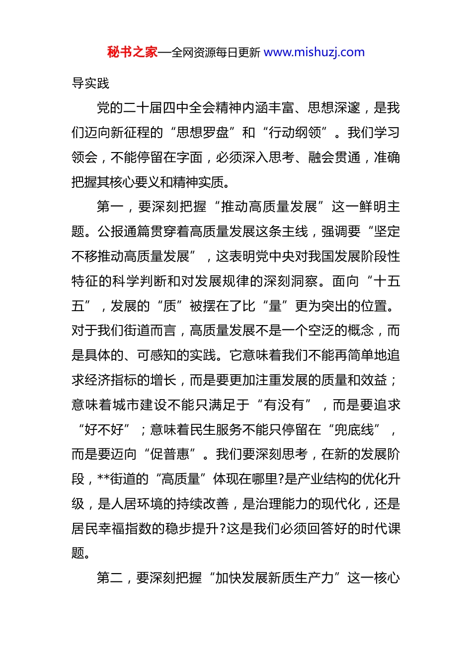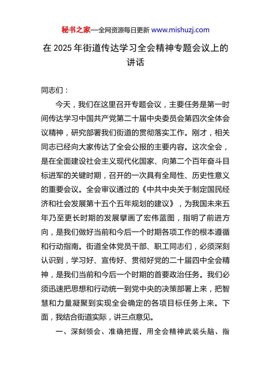 秘书之家—全网资源每日更新 www.mishuzj.com在 2025 年街道传达学习全会精神专题会议上的讲话 同志们:今天,我们在这里召开专题会议,主要任务是第一时间传达学习中国共产党第二十届中央委员会第四次全体会议精神,研究部署我们街道的贯彻落实工作。刚才,相关同志已经向大家传达了全会公报的主要内容。这次全会,是在全面建设社会主义现代化国家、向第二个百年奋斗目标进军的关键时期,召开的一次具有全局性、历史性意义的重要会议。全会审议通过的《中共中央关于制定国民经济和社会发展第十五个五年规划的建议》,为我国未来五年乃至更长时期的发展擘画了宏伟蓝图,指明了前进方向,是我们做好当前和今后一个时期各项工作的根本遵循和行动指南。街道全体党员干部、职工同志们,必须深刻认识到,学习好、宣传好、贯彻好党的二十届四中全会精神,是我们当前和今后一个时期的首要政治任务。我们必须迅速把思想和行动统一到党中央的决策部署上来,把智慧和力量凝聚到实现全会确定的各项目标任务上来。下面,我结合街道实际,讲三点意见。一、深刻领会、准确把握,用全会精神武装头脑、指秘书之家—全网资源每日更新 www.mishuzj.com导实践党的二十届四中全会精神内涵丰富、思想深邃,是我们迈向新征程的“思想罗盘”和“行动纲领”。我们学习领会,不能停留在字面,必须深入思考、融会贯通,准确把握其核心要义和精神实质。第一,要深刻把握“推动高质量发展”这一鲜明主题。公报通篇贯穿着高质量发展这条主线,强调要“坚定不移推动高质量发展”,这表明党中央对我国发展阶段性特征的科学判断和对发展规律的深刻洞察。面向“十五五”,发展的“质”被摆在了比“量”更为突出的位置。对于我们街道而言,高质量发展不是一个空泛的概念,而是具体的、可感知的实践。它意味着我们不能再简单地追求经济指标的增长,而是要更加注重发展的质量和效益;意味着城市建设不能只满足于“有没有”,而是要追求“好不好”;意味着民生服务不能只停留在“兜底线”,而是要迈向“促普惠”。我们要深刻思考,在新的发展阶段,**街道的“高质量”体现在哪里?是产业结构的优化升级,是人居环境的持续改善,是治理能力的现代化,还是居民幸福指数的稳步提升?这是我们必须回答好的时代课题。第二,要深刻把握“加快发展新质生产力”这一核心秘书之家—全网资源每日更新 www.mishuzj.com引擎。全会公报对科技创新的重视程度前所未有,多次强调“科技”与“创新”,明确提出要以科技创新推动产业创新,加快发展新质生产力。这为我们指明了未来发展的主攻方向。新质生产力,其核心在于创新驱动,特点是高科技、高效能、高质量。我们作为一个中心城区的街道,虽然没有大规模的工业园区,但我们是新技术、新业态、新模式应用的前沿阵地。我们辖区内商业楼宇林立,市场主体活跃,如何盘活存量资源,培育数字经济、平台经济、首店经济等新增长点?如何利用大数据、人工智能等现代信息技术,赋能城市管理和社区服务,打造智慧街区?如何引导传统商贸服务业进行数字化转型,提升核心竞争力?这些都是我们发展新质生产力的具体路径。我们必须破除“街道抓不了大产业”的思维定势,在“微创新”“微改造”中寻找突破口,为区域经济发展注入新动能。第三,要深刻把握“坚持以人民为中心”这一根本立场。全会强调,要“在高质量发展中增进民生福祉”,并将“扩大内需”和“保障和改善民生”紧密结合,充分体现了我们党“江山就是人民,人民就是江山”的执政理念。发展的最终目的是为了人民幸福。过去几年,我们街道在老旧小区改造、公共设施完善、困难群体帮扶等方面做了大量工作,取得了一定成效。但我们必须清醒地看秘书之家—全网资源每日更新 www.mishuzj.com到,与人民群众对美好生活的新期待相比,我们的工作还有不少差距。比如,普惠性养老托育服务供给是否充足?“15 分钟社区生活圈”的功能是否完备?群众反映强烈的物业管理、停车难、环境卫生等问题是否得到根本性解决?全会精神为我们指明了方向,就是要坚持问题导向,把群众的“表情包”作为我们工作的“风向标”,把群众的“需求单”变成我们的“任务...