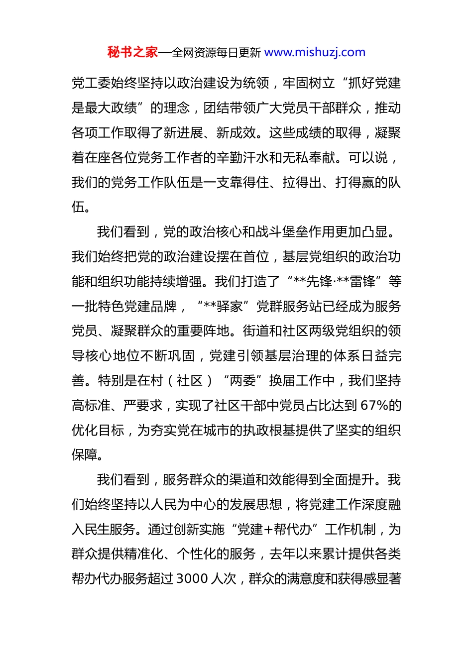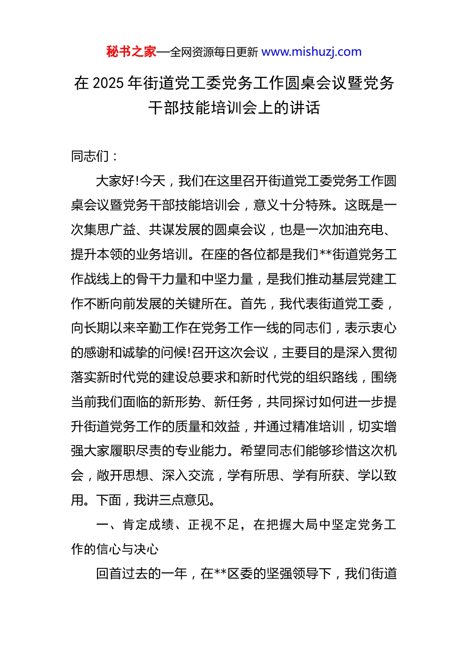 秘书之家—全网资源每日更新 www.mishuzj.com在 2025 年街道党工委党务工作圆桌会议暨党务干部技能培训会上的讲话 同志们:大家好!今天,我们在这里召开街道党工委党务工作圆桌会议暨党务干部技能培训会,意义十分特殊。这既是一次集思广益、共谋发展的圆桌会议,也是一次加油充电、提升本领的业务培训。在座的各位都是我们**街道党务工作战线上的骨干力量和中坚力量,是我们推动基层党建工作不断向前发展的关键所在。首先,我代表街道党工委,向长期以来辛勤工作在党务工作一线的同志们,表示衷心的感谢和诚挚的问候!召开这次会议,主要目的是深入贯彻落实新时代党的建设总要求和新时代党的组织路线,围绕当前我们面临的新形势、新任务,共同探讨如何进一步提升街道党务工作的质量和效益,并通过精准培训,切实增强大家履职尽责的专业能力。希望同志们能够珍惜这次机会,敞开思想、深入交流,学有所思、学有所获、学以致用。下面,我讲三点意见。一、肯定成绩、正视不足,在把握大局中坚定党务工作的信心与决心回首过去的一年,在**区委的坚强领导下,我们街道秘书之家—全网资源每日更新 www.mishuzj.com党工委始终坚持以政治建设为统领,牢固树立“抓好党建是最大政绩”的理念,团结带领广大党员干部群众,推动各项工作取得了新进展、新成效。这些成绩的取得,凝聚着在座各位党务工作者的辛勤汗水和无私奉献。可以说,我们的党务工作队伍是一支靠得住、拉得出、打得赢的队伍。我们看到,党的政治核心和战斗堡垒作用更加凸显。我们始终把党的政治建设摆在首位,基层党组织的政治功能和组织功能持续增强。我们打造了“**先锋·**雷锋”等一批特色党建品牌,“**驿家”党群服务站已经成为服务党员、凝聚群众的重要阵地。街道和社区两级党组织的领导核心地位不断巩固,党建引领基层治理的体系日益完善。特别是在村(社区)“两委”换届工作中,我们坚持高标准、严要求,实现了社区干部中党员占比达到 67%的优化目标,为夯实党在城市的执政根基提供了坚实的组织保障。我们看到,服务群众的渠道和效能得到全面提升。我们始终坚持以人民为中心的发展思想,将党建工作深度融入民生服务。通过创新实施“党建+帮代办”工作机制,为群众提供精准化、个性化的服务,去年以来累计提供各类帮办代办服务超过 3000 人次,群众的满意度和获得感显著秘书之家—全网资源每日更新 www.mishuzj.com增强。我们组织在职党员进社区常态化开展志愿服务,从政策宣传到环境清扫,从法律咨询到健康义诊,累计服务群众超过 9000 人次,用实际行动践行了“我为群众办实事”的庄严承诺。在矛盾纠纷化解方面,我们坚持党建引领网格化治理,去年以来成功化解各类矛盾纠纷 200 余件,有力维护了辖区的和谐稳定。我们看到,党员队伍的先锋模范形象愈发闪亮。我们坚持从严教育管理党员,通过主题党日、党员积分管理等多种形式,激发党员队伍的内生动力。在急难险重任务面前,广大党员冲锋在前,在文明城市创建、疫情防控、安全生产等重点工作中,处处可见党员忙碌的身影,他们用担当和奉献,让胸前的党徽在基层一线熠熠生辉。在肯定成绩的同时,我们也要清醒地认识到,对标新时代高质量发展的新要求,对标人民群众对美好生活的新期待,我们的工作还存在一些短板和弱项。比如,个别基层党组织的政治功能发挥还不够充分,党建工作与中心工作融合得还不够紧密,存在“两张皮”现象;少数党务干部的专业素养和创新能力还有待提升,习惯于按部就班,缺乏破解难题的新思路、新办法;党建信息化、智慧化水平还不够高,运用现代技术手段开展工作的能力需要进一步加强。这些问题,需要我们高度重视,并在今后的工作秘书之家—全网资源每日更新 www.mishuzj.com中采取有力措施,切实加以解决。二、提高站位、增强本领,在履职尽生动实践中彰显党务干部的担当与作为同志们,党务工作岗位光荣、责任重大。做好新时代的党务工作,不仅需要满腔热情,更需要过硬的政治素质和专业的业务能力。希望大家以此次培训为新的起点,努力成为让党放心、让人民满意的优秀党务工作者。第一,要做政治忠诚的“引领者”,在“举旗...