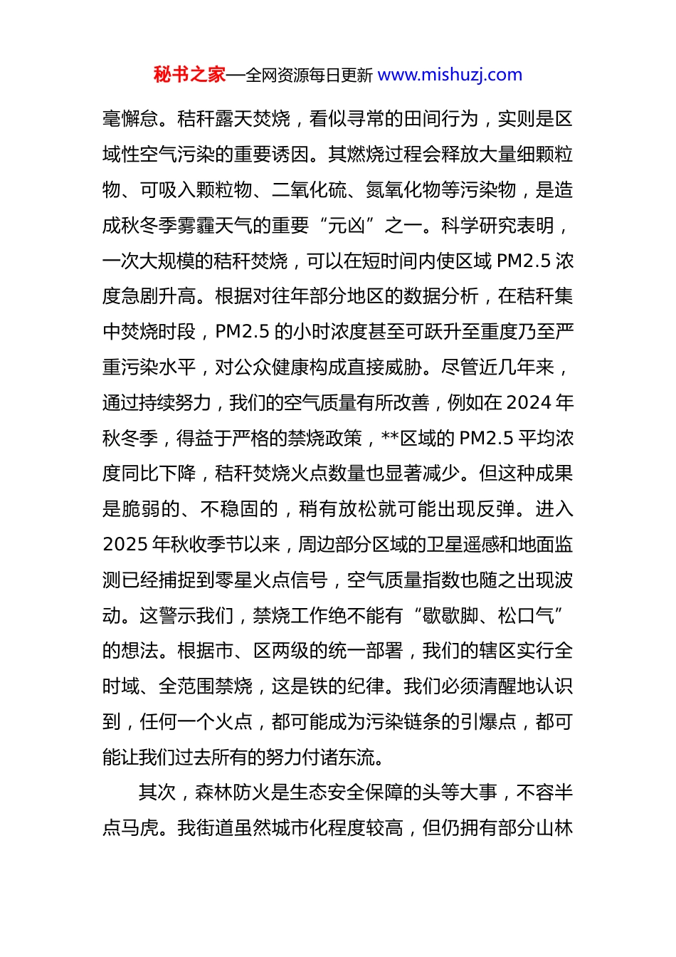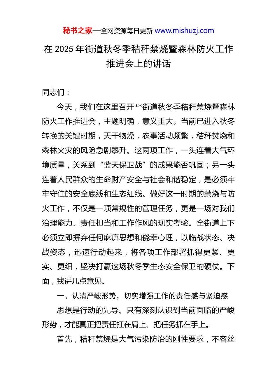 秘书之家—全网资源每日更新 www.mishuzj.com在 2025 年街道秋冬季秸秆禁烧暨森林防火工作推进会上的讲话 同志们:今天,我们在这里召开**街道秋冬季秸秆禁烧暨森林防火工作推进会,主题明确,意义重大。当前已进入秋冬转换的关键时期,天干物燥,农事活动频繁,秸秆焚烧和森林火灾的风险急剧攀升。这两项工作,一头连着大气环境质量,关系到“蓝天保卫战”的成果能否巩固;另一头连着人民群众的生命财产安全与社会和谐稳定,是必须牢牢守住的安全底线和生态红线。做好这一时期的禁烧与防火工作,不仅是一项常规性的管理任务,更是一场对我们治理能力、责任担当和工作作风的现实考验。全街道上下必须立即摒弃任何麻痹思想和侥幸心理,以临战状态、决战姿态,迅速行动起来,将各项工作部署抓得更紧、更实、更细,坚决打赢这场秋冬季生态安全保卫的硬仗。下面,我讲几点意见。一、认清严峻形势,切实增强工作的责任感与紧迫感思想是行动的先导。只有深刻认识到当前面临的严峻形势,才能真正把责任扛在肩上、把任务抓在手上。首先,秸秆禁烧是大气污染防治的刚性要求,不容丝秘书之家—全网资源每日更新 www.mishuzj.com毫懈怠。秸秆露天焚烧,看似寻常的田间行为,实则是区域性空气污染的重要诱因。其燃烧过程会释放大量细颗粒物、可吸入颗粒物、二氧化硫、氮氧化物等污染物,是造成秋冬季雾霾天气的重要“元凶”之一。科学研究表明,一次大规模的秸秆焚烧,可以在短时间内使区域 PM2.5 浓度急剧升高。根据对往年部分地区的数据分析,在秸秆集中焚烧时段,PM2.5 的小时浓度甚至可跃升至重度乃至严重污染水平,对公众健康构成直接威胁。尽管近几年来,通过持续努力,我们的空气质量有所改善,例如在 2024 年秋冬季,得益于严格的禁烧政策,**区域的 PM2.5 平均浓度同比下降,秸秆焚烧火点数量也显著减少。但这种成果是脆弱的、不稳固的,稍有放松就可能出现反弹。进入2025 年秋收季节以来,周边部分区域的卫星遥感和地面监测已经捕捉到零星火点信号,空气质量指数也随之出现波动。这警示我们,禁烧工作绝不能有“歇歇脚、松口气”的想法。根据市、区两级的统一部署,我们的辖区实行全时域、全范围禁烧,这是铁的纪律。我们必须清醒地认识到,任何一个火点,都可能成为污染链条的引爆点,都可能让我们过去所有的努力付诸东流。其次,森林防火是生态安全保障的头等大事,不容半点马虎。我街道虽然城市化程度较高,但仍拥有部分山林秘书之家—全网资源每日更新 www.mishuzj.com地、生态绿地和郊野公园,这些是我们的宝贵生态财富,也是城市重要的“绿肺”。秋冬季节,林下可燃物载量大,含水率低,遇有火源极易引发火灾。一旦发生森林火情,不仅会吞噬多年的绿化成果,破坏生态平衡,产生的滚滚浓烟同样会造成严重的大气污染,甚至威胁到周边的居民区、企业和重要基础设施的安全。回顾历史,因一个烟头、一处祭祀用火、一片违规焚烧的秸秆地而引发惨痛森林火灾的教训,在全国范围内屡见不鲜。这些火灾不仅造成了巨大的经济损失和生态破坏,更带来了人员伤亡的悲剧。因此,森林防火工作必须坚持“预防为主、积极消灭”的方针,功夫要下在平时,隐患要排查在火灾发生之前。将秸秆禁烧与森林防火工作统筹部署、一体推进,正是因为两者在风险源头上高度关联,在工作举措上可以相互协同。田间地头的一把火,很可能就是林区火灾的导火索。抓好秸秆禁烧,本身就是在为森林防火清除一个重大的风险源。二、正视问题短板,精准把握工作的着力点与突破口肯定成绩的同时,更要敢于直面问题、善于剖析短板。只有这样,我们的工作才能找准方向,实现从“做了”到“做好”的转变。对照上级的要求和群众的期盼,当前我们的工作还存在一些不容忽视的薄弱环节。秘书之家—全网资源每日更新 www.mishuzj.com一是责任传导存在“温差”。“上热下冷”的现象在一定程度上依然存在。街道层面三令五申,会议开了不少,文件也发了不少,但压力传导到社区、到网格员、到具体地块时,出现了衰减。个别社区和工作人员对工作的极端重要性认识不足,认为“年年都抓,问题不大”,存在应付思想。网格化管...