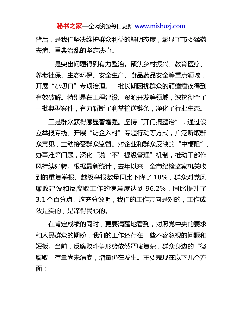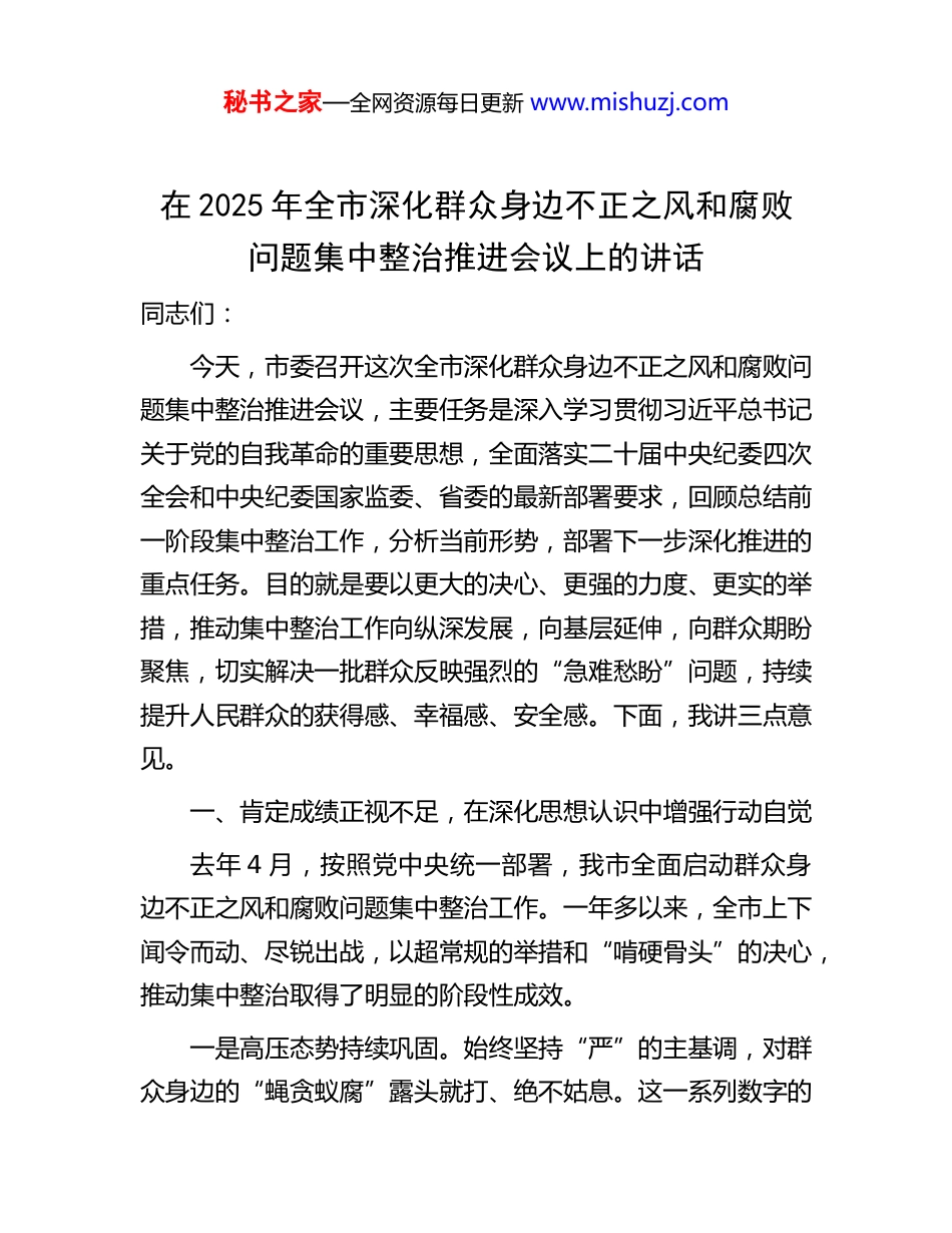 秘书之家—全网资源每日更新 www.mishuzj.com在 2025 年全市深化群众身边不正之风和腐败问题集中整治推进会议上的讲话同志们:今天,市委召开这次全市深化群众身边不正之风和腐败问题集中整治推进会议,主要任务是深入学习贯彻习近平总书记关于党的自我革命的重要思想,全面落实二十届中央纪委四次全会和中央纪委国家监委、省委的最新部署要求,回顾总结前一阶段集中整治工作,分析当前形势,部署下一步深化推进的重点任务。目的就是要以更大的决心、更强的力度、更实的举措,推动集中整治工作向纵深发展,向基层延伸,向群众期盼聚焦,切实解决一批群众反映强烈的“急难愁盼”问题,持续提升人民群众的获得感、幸福感、安全感。下面,我讲三点意见。一、肯定成绩正视不足,在深化思想认识中增强行动自觉去年 4 月,按照党中央统一部署,我市全面启动群众身边不正之风和腐败问题集中整治工作。一年多以来,全市上下闻令而动、尽锐出战,以超常规的举措和“啃硬骨头”的决心,推动集中整治取得了明显的阶段性成效。一是高压态势持续巩固。始终坚持“严”的主基调,对群众身边的“蝇贪蚁腐”露头就打、绝不姑息。这一系列数字的秘书之家—全网资源每日更新 www.mishuzj.com背后,是我们坚决维护群众利益的鲜明态度,彰显了市委猛药去疴、重典治乱的坚定决心。二是突出问题得到有力整治。聚焦乡村振兴、教育医疗、养老社保、生态环保、安全生产、食品药品安全等重点领域,开展“小切口”专项治理。一批长期困扰群众的顽瘴痼疾得到有效破解。特别是在工程建设、资源开发等领域,深挖彻查了一批典型案件,有力斩断了利益输送链条,净化了行业生态。三是群众获得感显著增强。坚持“开门搞整治”,通过设立举报专线、开展“访企入村”专题行动等方式,广泛听取群众意见,主动接受群众监督。对企业和群众反映的“中梗阻”、办事难等问题,深化“说‘不’提级管理”机制,推动干部作风持续好转。根据最新统计,去年以来,全市纪检监察机关收到的重复举报、越级举报数量同比下降了 18%,群众对党风廉政建设和反腐败工作的满意度达到 96.2%,同比提升了3.1 个百分点。这充分说明,我们的工作方向是对的,工作成效是实的,是深得民心的。在肯定成绩的同时,更要清醒地看到,对照党中央的要求和人民群众的期盼,我们的工作还存在一些不容忽视的问题和短板。当前,反腐败斗争形势依然严峻复杂,群众身边的“微腐败”存量尚未清底,增量仍在发生。主要表现在以下几个方面:秘书之家—全网资源每日更新 www.mishuzj.com其一,压力传导存在衰减现象。“上热中温下冷”的问题在一些地区和单位依然存在。有的单位主要负责同志满足于开了会、发了文,对本地区本单位的突出问题缺乏深入研究,对重点案件的查办督促不力,责任压力没有真正贯通到“最后一公里”。其二,腐败手段呈现隐形变异。随着正风肃纪反腐力度持续加大,一些腐败行为由“明”转“暗”,手段更加隐蔽、方式更加多样。有的通过“影子公司”、白手套等方式搞利益输送;有的利用新型金融工具、虚拟交易等方式转移非法所得;有的则以“专家咨询费”“市场化合作”等名义行索贿受贿之实。这些都给我们的发现和查处工作带来了新的挑战。其三,重点领域风险依然突出。从查处的案件看,权力集中、资金密集、资源富集的领域仍然是腐败问题的高发区。特别是在项目审批、土地出让、政府采购、惠民惠农补贴发放等环节,寻租空间依然存在,“靠山吃山、靠水吃水”的现象时有发生,必须保持高度警惕。其四,作风顽疾尚未彻底根除。一些干部不担当、不作为慢作为、乱作为的“躺平”思想和行为,成为一种新型的、不易察觉的腐败。这种“软腐败”虽然没有直接的经济问题,但严重影响了政策落地、损害了发展环境、伤害了群众感情,其危害性不亚于贪污腐败。秘书之家—全网资源每日更新 www.mishuzj.com这些问题的存在,深刻说明了深化集中整治的极端重要性和紧迫性。全心全意为人民服务是党的根本宗旨,人民群众最痛恨腐败现象,腐败是我们党执政的最大威胁。习近平总书记反复强调,“必须坚持治国必先治党、党兴才能国强”。解决群众身边的不...