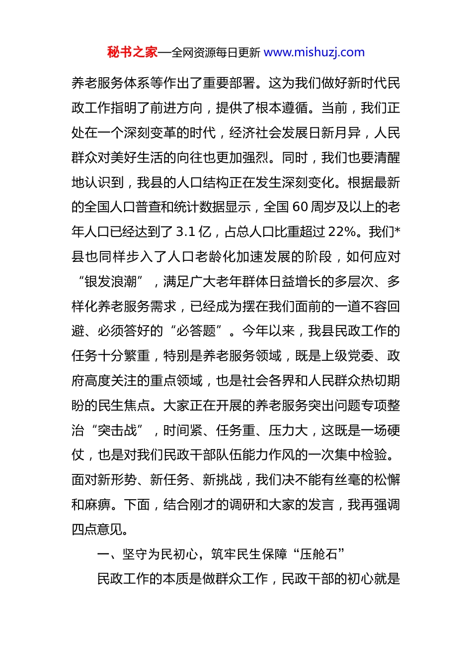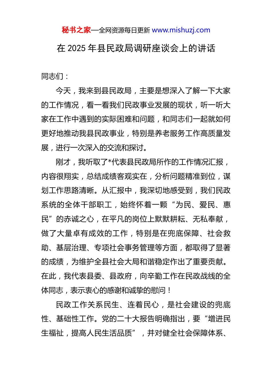 秘书之家—全网资源每日更新 www.mishuzj.com在 2025 年县民政局调研座谈会上的讲话 同志们:今天,我来到县民政局,主要是想深入了解一下大家的工作情况,看一看我们民政事业发展的现状,听一听大家在工作中遇到的实际困难和问题,和同志们一起就如何更好地推动我县民政事业,特别是养老服务工作高质量发展,进行一次深入的交流和探讨。刚才,我听取了*代表县民政局所作的工作情况汇报,内容很翔实,总结成绩客观实在,分析问题精准到位,谋划工作思路清晰。从汇报中,我深切地感受到,我们民政系统的全体干部职工,始终怀着一颗“为民、爱民、惠民”的赤诚之心,在平凡的岗位上默默耕耘、无私奉献,做了大量卓有成效的工作,特别是在兜底保障、社会救助、基层治理、专项社会事务管理等方面,都取得了显著的成绩,为维护全县社会大局和谐稳定作出了重要贡献。在此,我代表县委、县政府,向辛勤工作在民政战线的全体同志,表示衷心的感谢和诚挚的慰问!民政工作关系民生、连着民心,是社会建设的兜底性、基础性工作。党的二十大报告明确指出,要“增进民生福祉,提高人民生活品质”,并对健全社会保障体系、秘书之家—全网资源每日更新 www.mishuzj.com养老服务体系等作出了重要部署。这为我们做好新时代民政工作指明了前进方向,提供了根本遵循。当前,我们正处在一个深刻变革的时代,经济社会发展日新月异,人民群众对美好生活的向往也更加强烈。同时,我们也要清醒地认识到,我县的人口结构正在发生深刻变化。根据最新的全国人口普查和统计数据显示,全国 60 周岁及以上的老年人口已经达到了 3.1 亿,占总人口比重超过 22%。我们*县也同样步入了人口老龄化加速发展的阶段,如何应对“银发浪潮”,满足广大老年群体日益增长的多层次、多样化养老服务需求,已经成为摆在我们面前的一道不容回避、必须答好的“必答题”。今年以来,我县民政工作的任务十分繁重,特别是养老服务领域,既是上级党委、政府高度关注的重点领域,也是社会各界和人民群众热切期盼的民生焦点。大家正在开展的养老服务突出问题专项整治“突击战”,时间紧、任务重、压力大,这既是一场硬仗,也是对我们民政干部队伍能力作风的一次集中检验。面对新形势、新任务、新挑战,我们决不能有丝毫的松懈和麻痹。下面,结合刚才的调研和大家的发言,我再强调四点意见。一、坚守为民初心,筑牢民生保障“压舱石”民政工作的本质是做群众工作,民政干部的初心就是秘书之家—全网资源每日更新 www.mishuzj.com为人民谋幸福。这份初心,体现在我们对困难群众的每一次探访、每一笔救助款的发放,体现在我们对老年人无微不至的关怀和照料之中。我们常说,民政工作是党和政府联系人民群众的桥梁和纽带,这根纽带是否牢固,直接关系到党和政府在人民群众心中的形象。因此,我们必须始终把人民放在心中最高位置,带着深厚的感情、强烈的责任感和崇高的使命感,用心、用情、用力办好每一件民生实事。当前,我们正在进行的养老服务领域专项整治工作,就是践行以人民为中心的发展思想的具体行动。这项工作直接关系到老年人的晚年幸福,关系到社会的和谐稳定。越是任务艰巨,我们越要发挥“头雁效应”。局领导班子成员要带头深入基层、下沉一线,靠前指挥、全程跟踪、现场督办,把问题发现在一线,把矛盾解决在一线。要确保各项民生资金,特别是养老服务补贴、高龄津贴、建设补助等,能够精准、及时、足额地发放到位,决不允许出现截留、挪用、挤占等问题。我们要建立健全严格的资金监管机制,让每一分钱都花在刀刃上,真正发挥出效益,切实把党和政府的政策红利,转化为人民群众看得见、摸得着、感受得到的温暖和实惠。我们要通过扎实有效的工作,让群众真切地感受到,无论遇到什么困难,党和政府秘书之家—全网资源每日更新 www.mishuzj.com始终是他们最坚实、最可靠的后盾。二、聚焦重点领域,打好民政事业“攻坚战”民政工作千头万绪,我们必须学会“弹钢琴”,既要全面推进,又要善于抓住主要矛盾和矛盾的主要方面,聚焦核心领域,精准发力,以重点突破带动整体提升。当前和今后一个时期,我县民政工作的重中之重...