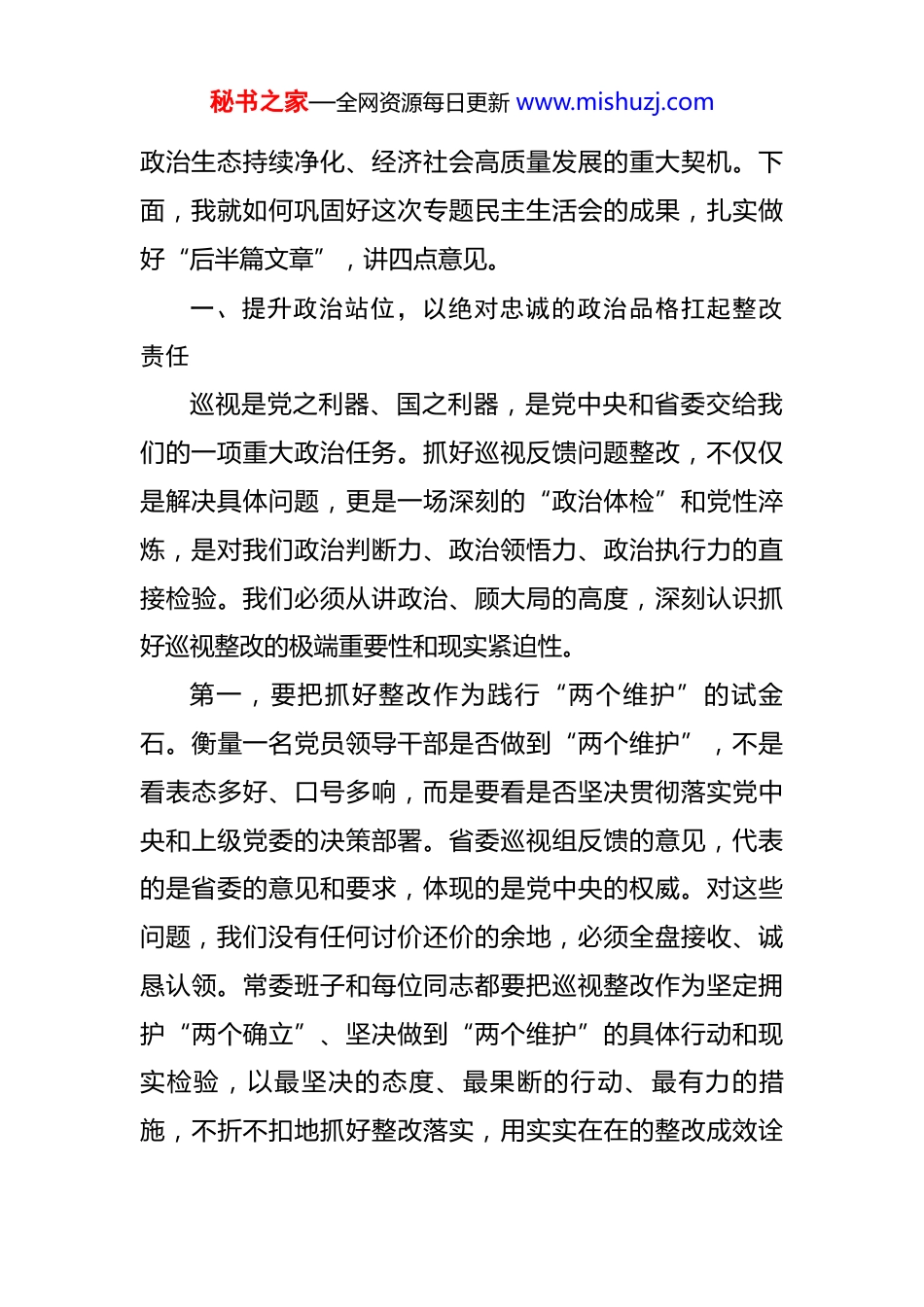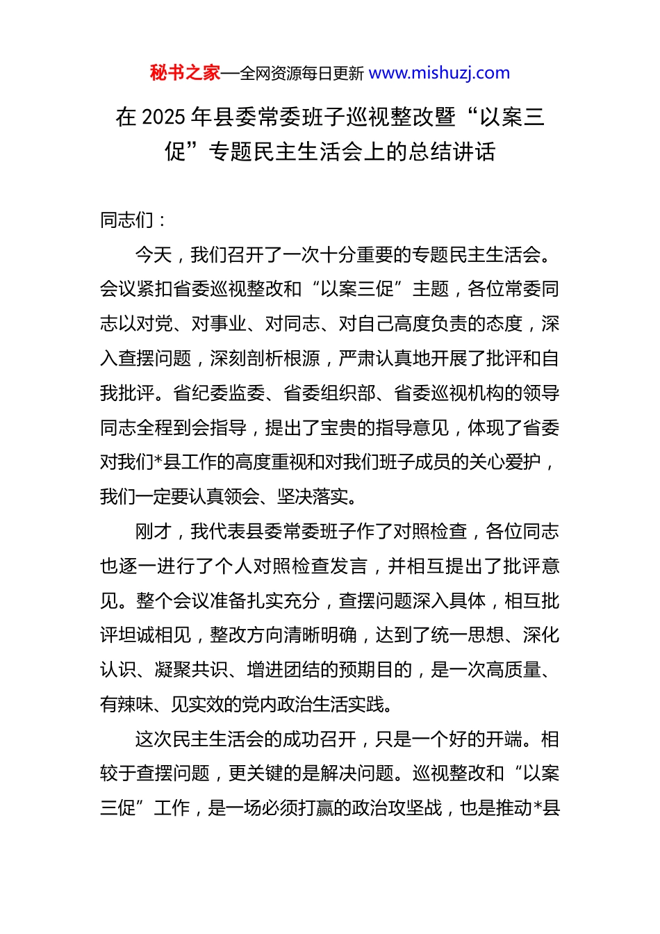 秘书之家—全网资源每日更新 www.mishuzj.com在 2025 年县委常委班子巡视整改暨“以案三促”专题民主生活会上的总结讲话 同志们:今天,我们召开了一次十分重要的专题民主生活会。会议紧扣省委巡视整改和“以案三促”主题,各位常委同志以对党、对事业、对同志、对自己高度负责的态度,深入查摆问题,深刻剖析根源,严肃认真地开展了批评和自我批评。省纪委监委、省委组织部、省委巡视机构的领导同志全程到会指导,提出了宝贵的指导意见,体现了省委对我们*县工作的高度重视和对我们班子成员的关心爱护,我们一定要认真领会、坚决落实。刚才,我代表县委常委班子作了对照检查,各位同志也逐一进行了个人对照检查发言,并相互提出了批评意见。整个会议准备扎实充分,查摆问题深入具体,相互批评坦诚相见,整改方向清晰明确,达到了统一思想、深化认识、凝聚共识、增进团结的预期目的,是一次高质量、有辣味、见实效的党内政治生活实践。这次民主生活会的成功召开,只是一个好的开端。相较于查摆问题,更关键的是解决问题。巡视整改和“以案三促”工作,是一场必须打赢的政治攻坚战,也是推动*县秘书之家—全网资源每日更新 www.mishuzj.com政治生态持续净化、经济社会高质量发展的重大契机。下面,我就如何巩固好这次专题民主生活会的成果,扎实做好“后半篇文章”,讲四点意见。一、提升政治站位,以绝对忠诚的政治品格扛起整改责任巡视是党之利器、国之利器,是党中央和省委交给我们的一项重大政治任务。抓好巡视反馈问题整改,不仅仅是解决具体问题,更是一场深刻的“政治体检”和党性淬炼,是对我们政治判断力、政治领悟力、政治执行力的直接检验。我们必须从讲政治、顾大局的高度,深刻认识抓好巡视整改的极端重要性和现实紧迫性。第一,要把抓好整改作为践行“两个维护”的试金石。衡量一名党员领导干部是否做到“两个维护”,不是看表态多好、口号多响,而是要看是否坚决贯彻落实党中央和上级党委的决策部署。省委巡视组反馈的意见,代表的是省委的意见和要求,体现的是党中央的权威。对这些问题,我们没有任何讨价还价的余地,必须全盘接收、诚恳认领。常委班子和每位同志都要把巡视整改作为坚定拥护“两个确立”、坚决做到“两个维护”的具体行动和现实检验,以最坚决的态度、最果断的行动、最有力的措施,不折不扣地抓好整改落实,用实实在在的整改成效诠秘书之家—全网资源每日更新 www.mishuzj.com释对党绝对忠诚。第二,要把抓好整改作为推进全面从严治党的磨刀石。党的十八大以来,全面从严治党取得了历史性、开创性成就,但反腐败斗争形势依然严峻复杂。巡视发现的问题,以及我们身边发生的典型案件,都警示我们,全面从严治党永远在路上,管党治党一刻也不能放松。我们必须时刻保持清醒和坚定,严守政治纪律和政治规矩,把“严”的主基调长期坚持下去。要通过这次整改,推动全面从严治党向纵深发展、向基层延伸,层层传导压力,逐级压实责任,让我们*县的每一级党组织都成为坚强战斗堡垒,让每一名党员干部都成为一面永不褪色的旗帜。第三,要把抓好整改作为检验班子战斗力的赛马场。一个班子强不强、有没有战斗力,关键看能不能打硬仗、解难题。巡视整改和“以案三促”就是摆在我们面前的一场硬仗。这次会上查摆出的问题,很多是长期积累的沉疴顽疾,涉及面广、成因复杂,整改难度很大。这恰恰是对我们常委班子凝聚力、战斗力和执行力的集中考验。我们必须把这次整改作为加强班子自身建设的契机,同心同德、同向发力,敢于啃硬骨头,敢于涉险滩,以攻城拔寨的决心,坚决打赢这场攻坚战,向省委和全县人民交上一份合格的政治答卷。秘书之家—全网资源每日更新 www.mishuzj.com二、坚持问题导向,以较真碰硬的斗争精神实现问题清零发现问题是水平,解决问题是能力。这次专题民主生活会,我们对照巡视反馈意见和“以案三促”要求,查摆出了一批问题,同志们也提出了很多中肯的批评意见。这些问题和意见,就是我们下一步整改的主攻方向。我们必须发扬钉钉子精神,坚持立行立改、真改实改、彻底整改,确保所有问题见底清零、绝不贰过。一要建立“台账式”管理机...