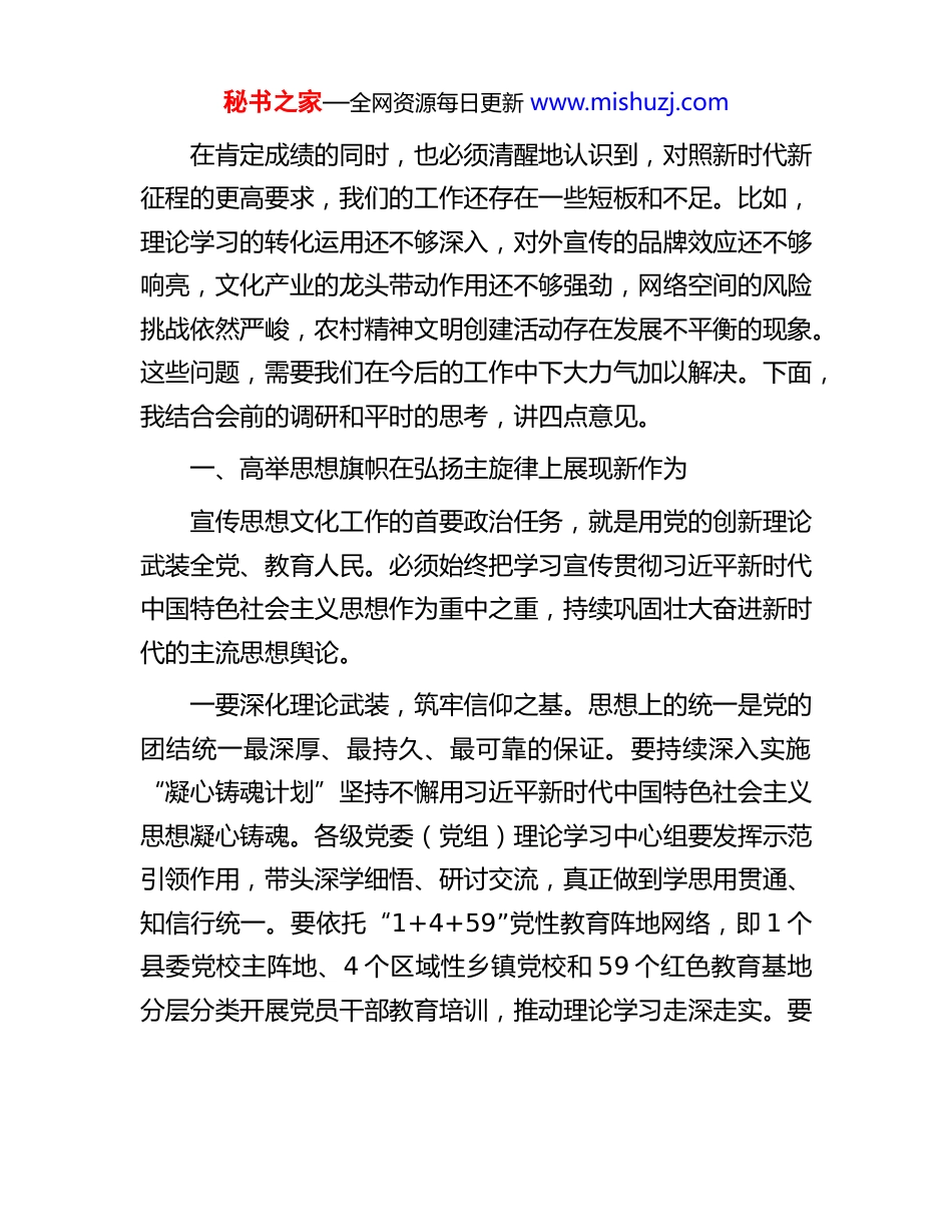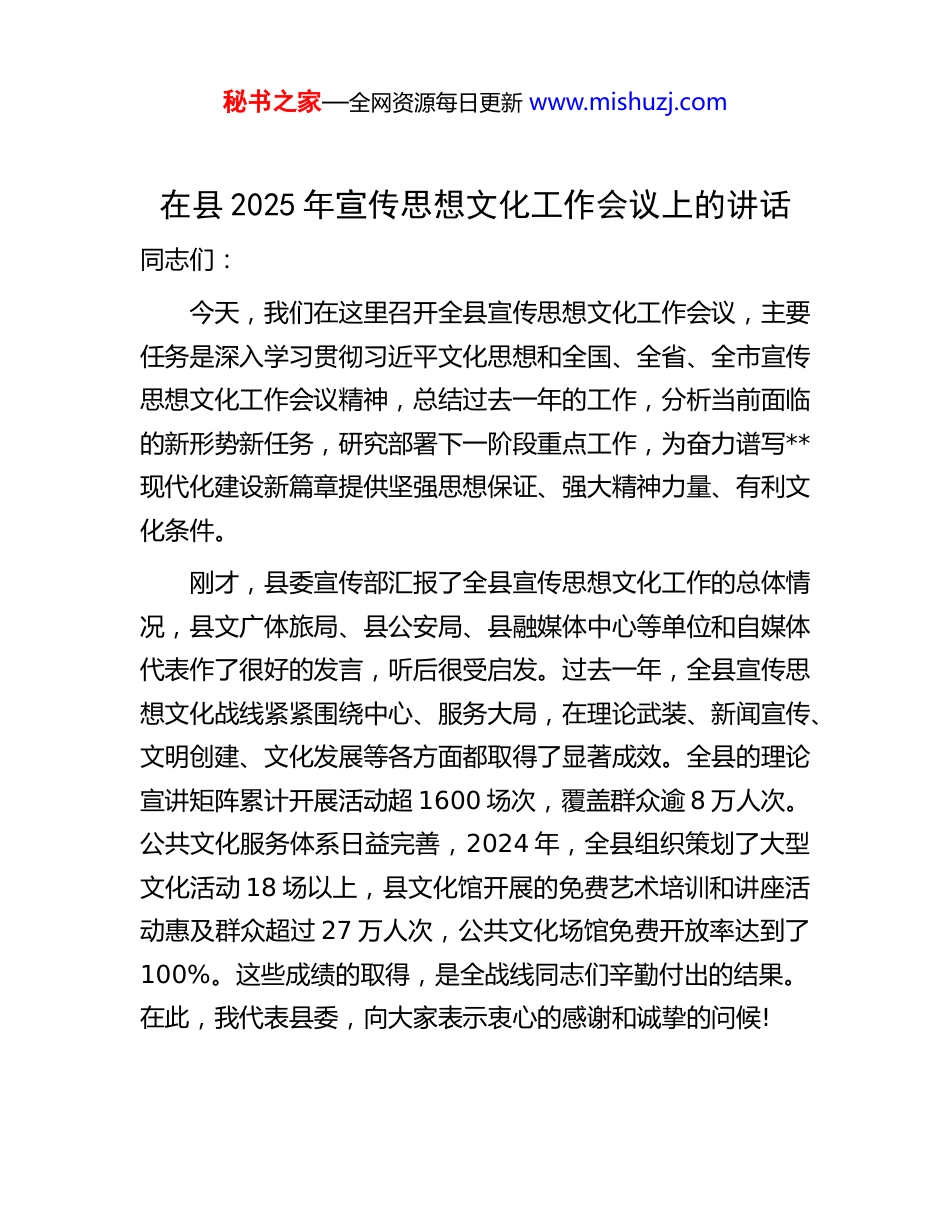 秘书之家—全网资源每日更新 www.mishuzj.com在县 2025 年宣传思想文化工作会议上的讲话同志们:今天,我们在这里召开全县宣传思想文化工作会议,主要任务是深入学习贯彻习近平文化思想和全国、全省、全市宣传思想文化工作会议精神,总结过去一年的工作,分析当前面临的新形势新任务,研究部署下一阶段重点工作,为奋力谱写**现代化建设新篇章提供坚强思想保证、强大精神力量、有利文化条件。刚才,县委宣传部汇报了全县宣传思想文化工作的总体情况,县文广体旅局、县公安局、县融媒体中心等单位和自媒体代表作了很好的发言,听后很受启发。过去一年,全县宣传思想文化战线紧紧围绕中心、服务大局,在理论武装、新闻宣传、文明创建、文化发展等各方面都取得了显著成效。全县的理论宣讲矩阵累计开展活动超 1600 场次,覆盖群众逾 8 万人次。公共文化服务体系日益完善,2024 年,全县组织策划了大型文化活动 18 场以上,县文化馆开展的免费艺术培训和讲座活动惠及群众超过 27 万人次,公共文化场馆免费开放率达到了100%。这些成绩的取得,是全战线同志们辛勤付出的结果。在此,我代表县委,向大家表示衷心的感谢和诚挚的问候!秘书之家—全网资源每日更新 www.mishuzj.com在肯定成绩的同时,也必须清醒地认识到,对照新时代新征程的更高要求,我们的工作还存在一些短板和不足。比如,理论学习的转化运用还不够深入,对外宣传的品牌效应还不够响亮,文化产业的龙头带动作用还不够强劲,网络空间的风险挑战依然严峻,农村精神文明创建活动存在发展不平衡的现象。这些问题,需要我们在今后的工作中下大力气加以解决。下面,我结合会前的调研和平时的思考,讲四点意见。一、高举思想旗帜在弘扬主旋律上展现新作为宣传思想文化工作的首要政治任务,就是用党的创新理论武装全党、教育人民。必须始终把学习宣传贯彻习近平新时代中国特色社会主义思想作为重中之重,持续巩固壮大奋进新时代的主流思想舆论。一要深化理论武装,筑牢信仰之基。思想上的统一是党的团结统一最深厚、最持久、最可靠的保证。要持续深入实施“凝心铸魂计划”坚持不懈用习近平新时代中国特色社会主义思想凝心铸魂。各级党委(党组)理论学习中心组要发挥示范引领作用,带头深学细悟、研讨交流,真正做到学思用贯通、知信行统一。要依托“1+4+59”党性教育阵地网络,即 1 个县委党校主阵地、4 个区域性乡镇党校和 59 个红色教育基地分层分类开展党员干部教育培训,推动理论学习走深走实。要秘书之家—全网资源每日更新 www.mishuzj.com创新理论传播方式,高标准规划建设*理论充电站示范点,让党的创新理论以更接地气、更具活力的方式飞入寻常百姓家。二要壮大正面宣传,提振发展之气。一个地方的发展,离不开昂扬向上的精神状态和团结奋进的舆论氛围。宣传工作必须坚持团结稳定鼓劲、正面宣传为主的总基调,聚焦全县“543”发展战略,精心组织开展重大主题宣传。要围绕县委、县政府的中心工作,深入报道全县在产业发展、乡村振兴、项目建设、民生改善等方面的生动实践和显著成效,用事实和数据说话,激发全县干部群众的自信心和自豪感。要继续办好“春节**过年七天乐”等品牌文化活动,讲好**故事,传播**声音。同时,要突出爱国主义、集体主义、社会主义教育,引导全县党员干部群众积极主动思进、思干、思发展,把思想和行动统一到县委的决策部署上来,把智慧和力量汇聚到推动**高质量发展的宏伟事业中来。三要加强价值引领,涵养文明之风。要深入培育和践行社会主义核心价值观,将其融入法治建设、社会治理、学校教育和日常生活的方方面面。要持续深化文明城市、文明村镇、文明单位、文明家庭、文明校园创建活动,特别是要扎实推进省级文明县城创建工作,以创建促提升,不断提高全县社会文明程度。要发挥好新时代文明实践中心(所、站)的作用,广泛开展志愿服务活动,推动形成崇德向善、见贤思齐的社会风尚。要加强青少年思想道德建设,扣好人生第一粒扣子。要大力弘秘书之家—全网资源每日更新 www.mishuzj.com扬优秀传统文化,推动创造性转化、创新性发展,让蕴含其中的思想观念、人文精神、道...