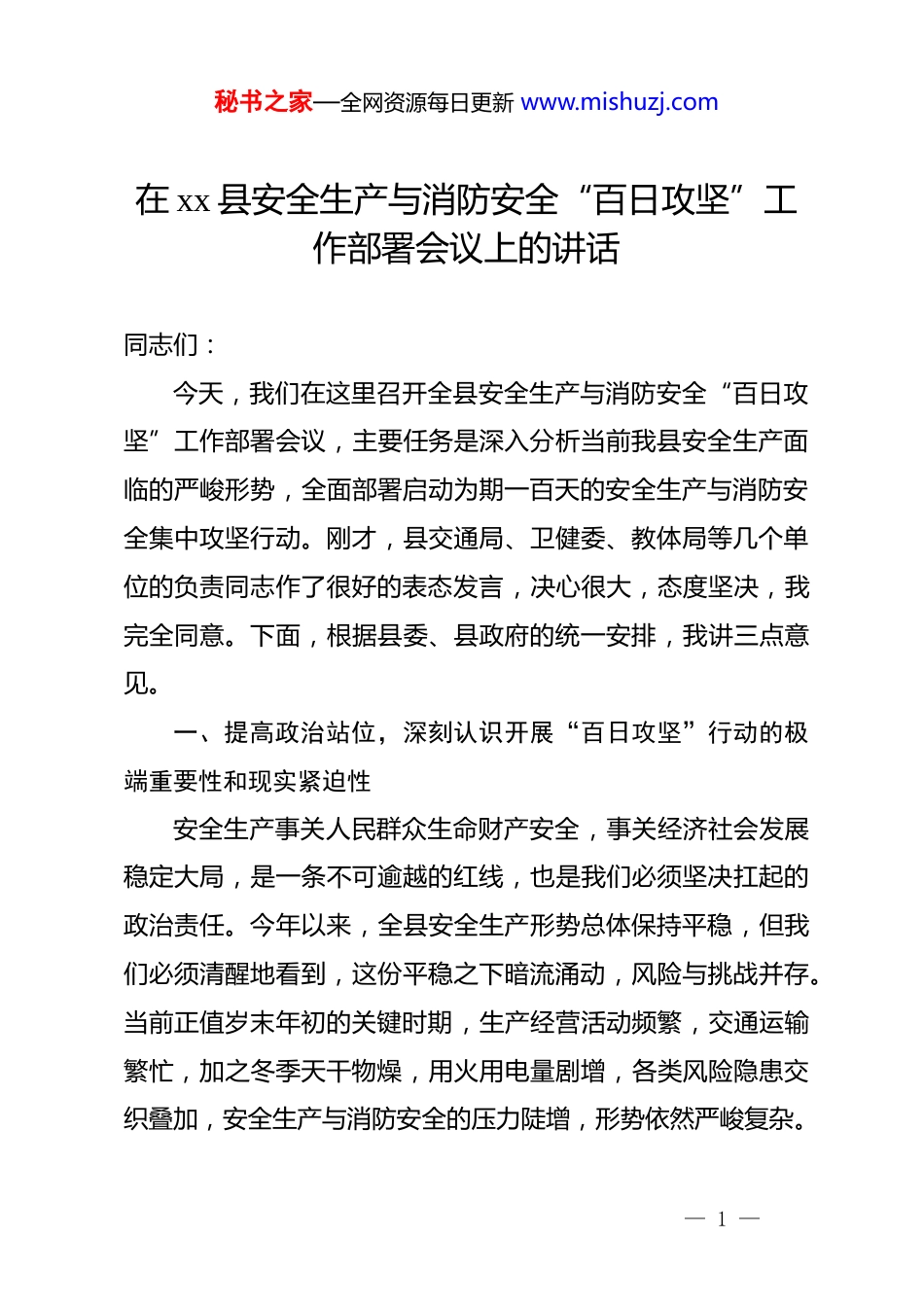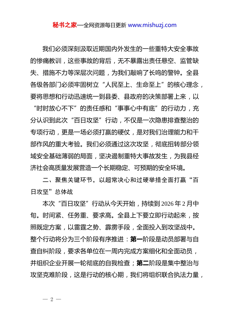 秘书之家—全网资源每日更新 www.mishuzj.com在 xx 县安全生产与消防安全“百日攻坚”工作部署会议上的讲话同志们:今天,我们在这里召开全县安全生产与消防安全“百日攻坚”工作部署会议,主要任务是深入分析当前我县安全生产面临的严峻形势,全面部署启动为期一百天的安全生产与消防安全集中攻坚行动。刚才,县交通局、卫健委、教体局等几个单位的负责同志作了很好的表态发言,决心很大,态度坚决,我完全同意。下面,根据县委、县政府的统一安排,我讲三点意见。一、提高政治站位,深刻认识开展“百日攻坚”行动的极端重要性和现实紧迫性安全生产事关人民群众生命财产安全,事关经济社会发展稳定大局,是一条不可逾越的红线,也是我们必须坚决扛起的政治责任。今年以来,全县安全生产形势总体保持平稳,但我们必须清醒地看到,这份平稳之下暗流涌动,风险与挑战并存。当前正值岁末年初的关键时期,生产经营活动频繁,交通运输繁忙,加之冬季天干物燥,用火用电量剧增,各类风险隐患交织叠加,安全生产与消防安全的压力陡增,形势依然严峻复杂。— 1 —秘书之家—全网资源每日更新 www.mishuzj.com我们必须深刻汲取近期国内外发生的一些重特大安全事故的惨痛教训,这些事故的背后,无不暴露出责任悬空、监管缺失、措施不力等深层次问题,为我们敲响了长鸣的警钟。全县各级各部门必须牢固树立“人民至上、生命至上”的核心理念,要将思想和行动迅速统一到县委、县政府的决策部署上来,以“时时放心不下”的责任感和“事事心中有底”的行动力,充分认识到此次“百日攻坚”行动,不仅是一次隐患排查整治的专项行动,更是一场必须打赢的硬仗,是对我们治理能力和干部作风的重大考验。我们必须通过这次攻坚,彻底扭转部分领域安全基础薄弱的局面,坚决遏制重特大事故发生,为我县经济社会高质量发展营造一个长期稳定、可预期的安全环境。二、聚焦关键环节,以超常决心和过硬举措全面打赢“百日攻坚”总体战本次“百日攻坚”行动从今天开始,持续到 2026 年 2 月中旬。时间紧、任务重、要求高。全县上下要立即行动起来,按照既定方案,以雷霆之势、霹雳手段,全面投入到攻坚战中。整个行动将分为三个阶段有序推进:第一阶段是动员部署与自查自纠阶段,要求各单位在一周内完成方案细化和全面动员,并组织企业开展一轮彻底的自我检查;第二阶段是集中整治与攻坚克难阶段,这是行动的核心期,我们将组织联合执法力量,— 2 —秘书之家—全网资源每日更新 www.mishuzj.com对重点领域和突出问题进行集中整治;第三阶段是巩固提升与总结评估阶段,我们将对行动成效进行“回头看”,建立长效机制,防止问题反弹。为确保行动取得实效,必须在以下几个方面实现重点突破:(一)突出重点行业领域,实施清单化、台账式精准治理。安全生产牵涉面广,必须学会“弹钢琴”,抓住主要矛盾和矛盾的主要方面。此次攻坚,要牢牢盯住以下高危重点行业领域,开展拉网式、地毯式的大排查、大整治。一是道路交通领域。要以“两客一危一货”为重中之重,严厉查处“三超一疲劳”、非法营运、违法载人等行为。交通、公安等部门要加密联合执法频次,特别是在重点路段、重点时段,要做到逢车必查、逢违必究。要对全县所有运输企业的安全管理制度落实情况进行一次全面审计,确保动态监控制度100%执行到位。二是建筑施工领域。要聚焦深基坑、高支模、脚手架、起重机械等危险性较大的分部分项工程,严格落实安全技术交底和旁站监理制度。住建部门要加大巡查力度,对发现的重大隐患,必须立即责令停工整改,整改不到位绝不允许复工。本次攻坚期间,全县在建工地检查覆盖率必须达到 100%。三是危险化学品与城镇燃气领域。要对全县所有危化品生— 3 —秘书之家—全网资源每日更新 www.mishuzj.com产、储存、经营、运输单位进行全链条风险辨识,确保重大危险源在线监测数据准确可靠。要深刻吸取燃气爆炸事故教训,全面排查整治餐饮场所、老旧小区等区域的燃气管道、阀门、软管和报警装置,坚决取缔不合格的“瓶、灶、管、阀”,力争攻坚期间完成对全县 500 家以上餐饮单位的燃气安全评估。四是工贸企业...