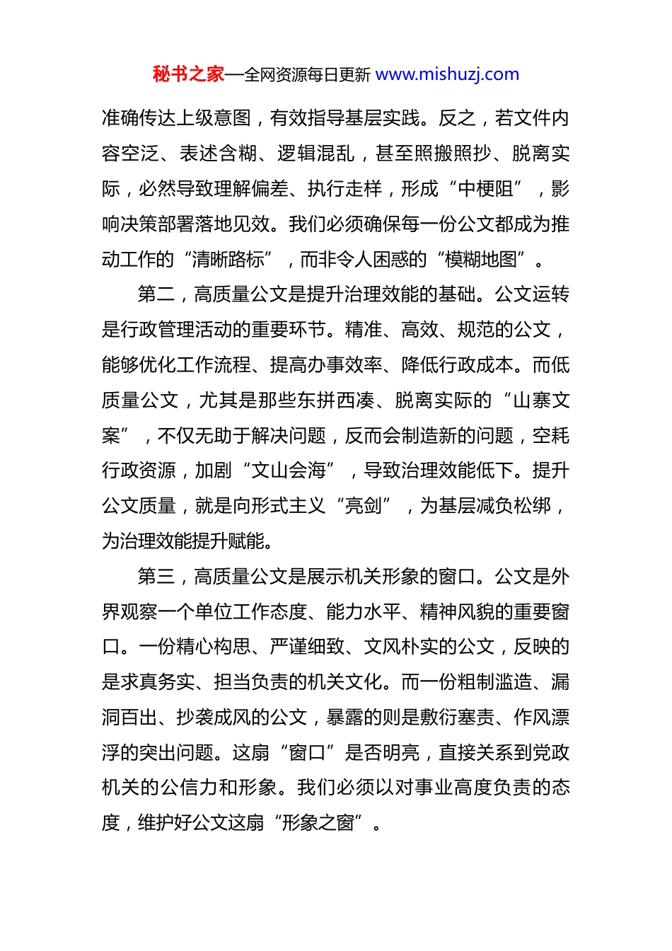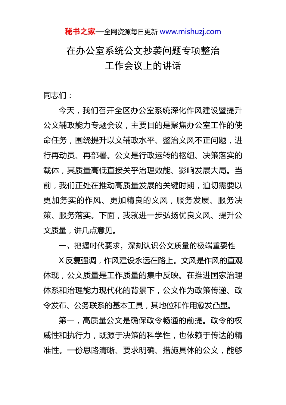 秘书之家—全网资源每日更新 www.mishuzj.com在办公室系统公文抄袭问题专项整治工作会议上的讲话 同志们:今天,我们召开全区办公室系统深化作风建设暨提升公文辅政能力专题会议,主要目的是聚焦办公室工作的使命任务,围绕提升以文辅政水平、整治文风不正问题,进行再动员、再部署。公文是行政运转的枢纽、决策落实的载体,其质量高低直接关乎治理效能、影响发展大局。当前,我们正处在推动高质量发展的关键时期,迫切需要以更加务实的作风、更加精良的文风,服务发展、服务决策、服务落实。下面,我就进一步弘扬优良文风、提升公文质量,讲几点意见。一、把握时代要求,深刻认识公文质量的极端重要性X 反复强调,作风建设永远在路上。文风是作风的直观体现,公文质量是工作质量的集中反映。在推进国家治理体系和治理能力现代化的背景下,公文作为政策传递、政令发布、公务联系的基本工具,其地位和作用愈发凸显。第一,高质量公文是确保政令畅通的前提。政令的权威性和执行力,既源于决策的科学性,也依赖于传达的精准性。一份思路清晰、要求明确、措施具体的公文,能够秘书之家—全网资源每日更新 www.mishuzj.com准确传达上级意图,有效指导基层实践。反之,若文件内容空泛、表述含糊、逻辑混乱,甚至照搬照抄、脱离实际,必然导致理解偏差、执行走样,形成“中梗阻”,影响决策部署落地见效。我们必须确保每一份公文都成为推动工作的“清晰路标”,而非令人困惑的“模糊地图”。第二,高质量公文是提升治理效能的基础。公文运转是行政管理活动的重要环节。精准、高效、规范的公文,能够优化工作流程、提高办事效率、降低行政成本。而低质量公文,尤其是那些东拼西凑、脱离实际的“山寨文案”,不仅无助于解决问题,反而会制造新的问题,空耗行政资源,加剧“文山会海”,导致治理效能低下。提升公文质量,就是向形式主义“亮剑”,为基层减负松绑,为治理效能提升赋能。第三,高质量公文是展示机关形象的窗口。公文是外界观察一个单位工作态度、能力水平、精神风貌的重要窗口。一份精心构思、严谨细致、文风朴实的公文,反映的是求真务实、担当负责的机关文化。而一份粗制滥造、漏洞百出、抄袭成风的公文,暴露的则是敷衍塞责、作风漂浮的突出问题。这扇“窗口”是否明亮,直接关系到党政机关的公信力和形象。我们必须以对事业高度负责的态度,维护好公文这扇“形象之窗”。秘书之家—全网资源每日更新 www.mishuzj.com二、坚持问题导向,精准剖析当前公文存在的突出短板近年来,通过持续整治,全区文风有所好转,但对照新形势新要求,公文写作与处理中仍存在一些不容忽视的问题,亟待解决。一是“空心化”倾向。部分公文内容空洞,缺乏实质性信息和具体举措,习惯于讲套话、打官腔,穿靴戴帽,冗长乏味,看似面面俱到,实则缺乏针对性和操作性,如同“无根的浮萍”,无法真正指导工作。二是“模板化”依赖。过度依赖固定模板和以往材料,思维僵化,创新不足。起草文件不是基于对现实情况的深入分析,而是简单套用格式、填充内容,导致公文千篇一律,缺乏个性与活力,难以适应新情况、解决新问题。三是“浮躁化”写作。缺乏深入研究和深思熟虑,满足于“短平快”。有的情况掌握不实,数据运用不准;有的逻辑层次不清,语句不通;有的甚至出现常识性错误或抄袭拼凑现象。这种浮躁文风背后,是思想懒惰、作风不实的表现。四是“孤立化”产生。部分公文起草过程封闭,缺乏必要的调查研究、意见征求和论证环节。闭门造车,与业秘书之家—全网资源每日更新 www.mishuzj.com务工作脱节,与基层实际脱节,与群众需求脱节,导致出台的政策措施“水土不服”,可操作性大打折扣。这些问题虽然表现形式不同,但根源都指向了思想认识、能力素质、工作机制等深层次原因,必须引起高度重视,深刻反思,着力破解。三、强化思想引领,牢固树立“文如其事”的公文理念整治不良文风,提升公文质量,首先要从思想根源上正本清源,引导干部深刻理解公文的本质属性,树立正确的写作观。一要秉持“服务大局”的政治站位。要深刻认识到,公文写作不是简单的文字技术活,而是重要的政治工作。必...