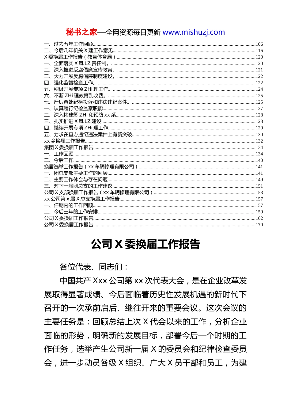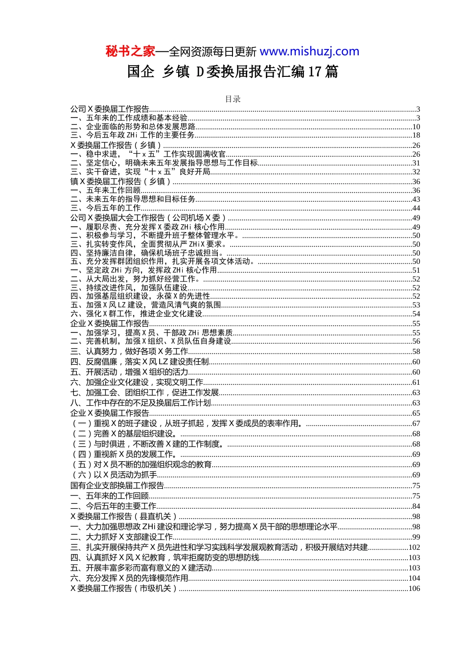 秘书之家—全网资源每日更新 www.mishuzj.com国企 乡镇 D 委换届报告汇编 17 篇目录公司 X 委换届工作报告........................................................................................................................................3一、五年来的工作成绩和基本经验.....................................................................................................................3二、企业面临的形势和总体发展思路...............................................................................................................10三、今后五年政 ZHi 工作的主要任务...............................................................................................................18X 委换届工作报告(乡镇)...............................................................................................................................26一、稳中求进,“十 x 五”工作实现圆满收官...............................................................................................26二、坚定信心,明确未来五年发展指导思想与工作目标...............................................................................31三、实干奋进,实现“十 x 五”良好开局.......................................................................................................32镇 X 委换届工作报告(乡镇)..........................................................................................................................36一、五年来工作回顾...........................................................................................................................................36二、未来五年的指导思想和目标任务...............................................................................................................43三、今后五年的工作...........................................................................................................................................44公司 X 委换届大会工作报告(公司机场 X 委)..............................................................................................49一、履职尽责、充分发挥 X 委政 ZHi 核心作用...............................................................................................49二、积极参与学习,不断提升班子整体管理水平。.......................................................................................50三、扎实转变作风,全面贯彻从严 ZHiX 要求。.............................................................................................50四、坚持廉洁自律,确保机场班子忠诚担当。...............................................................................................50五、充分发挥群团组织作用,扎实开展各项文体活动。...............................................................................50一、坚定政 ZHi 方向,发挥政 ZHi 核心作用...................................................................................................51二、从大局出发,努力抓好经营工作。...........................................................................................................52三、持续改进作风,加强队伍建设...................................................................................................................52四、加强基层组织建设,永葆 X 的先进性.......................................................................................................52五、加强 X 风 LZ 建设,营造风清气爽的氛围..................