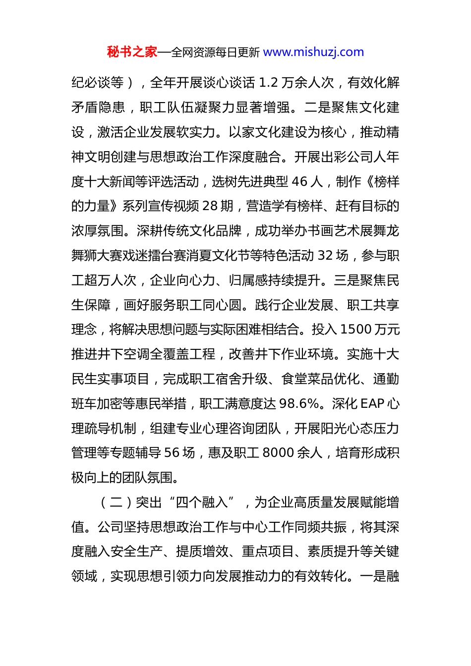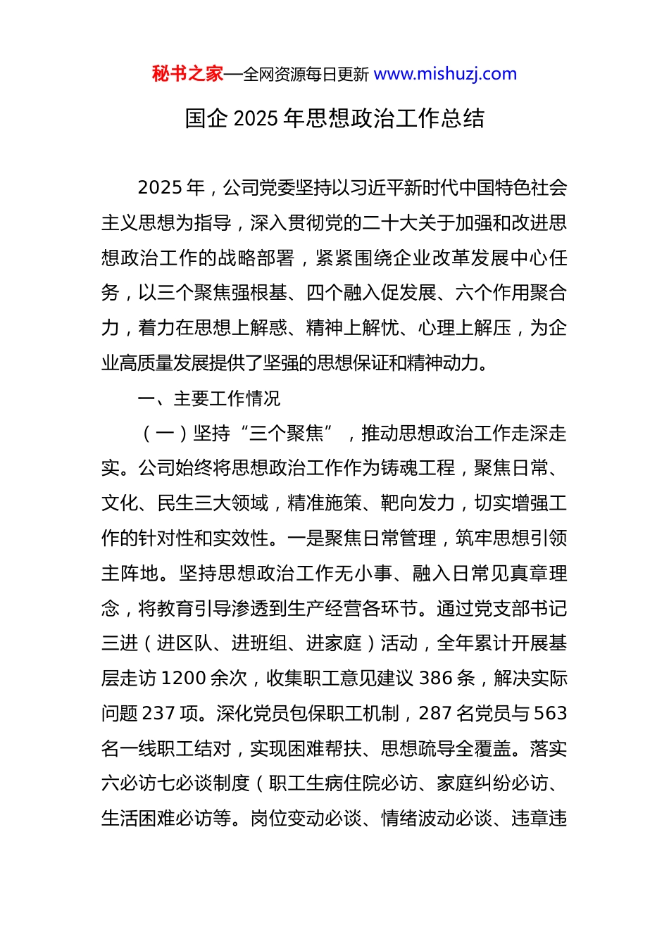 秘书之家—全网资源每日更新 www.mishuzj.com国企 2025 年思想政治工作总结 2025 年,公司党委坚持以习近平新时代中国特色社会主义思想为指导,深入贯彻党的二十大关于加强和改进思想政治工作的战略部署,紧紧围绕企业改革发展中心任务,以三个聚焦强根基、四个融入促发展、六个作用聚合力,着力在思想上解惑、精神上解忧、心理上解压,为企业高质量发展提供了坚强的思想保证和精神动力。一、主要工作情况(一)坚持“三个聚焦”,推动思想政治工作走深走实。公司始终将思想政治工作作为铸魂工程,聚焦日常、文化、民生三大领域,精准施策、靶向发力,切实增强工作的针对性和实效性。一是聚焦日常管理,筑牢思想引领主阵地。坚持思想政治工作无小事、融入日常见真章理念,将教育引导渗透到生产经营各环节。通过党支部书记三进(进区队、进班组、进家庭)活动,全年累计开展基层走访 1200 余次,收集职工意见建议 386 条,解决实际问题 237 项。深化党员包保职工机制,287 名党员与 563名一线职工结对,实现困难帮扶、思想疏导全覆盖。落实六必访七必谈制度(职工生病住院必访、家庭纠纷必访、生活困难必访等。岗位变动必谈、情绪波动必谈、违章违秘书之家—全网资源每日更新 www.mishuzj.com纪必谈等),全年开展谈心谈话 1.2 万余人次,有效化解矛盾隐患,职工队伍凝聚力显著增强。二是聚焦文化建设,激活企业发展软实力。以家文化建设为核心,推动精神文明创建与思想政治工作深度融合。开展出彩公司人年度十大新闻等评选活动,选树先进典型 46 人,制作《榜样的力量》系列宣传视频 28 期,营造学有榜样、赶有目标的浓厚氛围。深耕传统文化品牌,成功举办书画艺术展舞龙舞狮大赛戏迷擂台赛消夏文化节等特色活动 32 场,参与职工超万人次,企业向心力、归属感持续提升。三是聚焦民生保障,画好服务职工同心圆。践行企业发展、职工共享理念,将解决思想问题与实际困难相结合。投入 1500 万元推进井下空调全覆盖工程,改善井下作业环境。实施十大民生实事项目,完成职工宿舍升级、食堂菜品优化、通勤班车加密等惠民举措,职工满意度达 98.6%。深化 EAP 心理疏导机制,组建专业心理咨询团队,开展阳光心态压力管理等专题辅导 56 场,惠及职工 8000 余人,培育形成积极向上的团队氛围。(二)突出“四个融入”,为企业高质量发展赋能增值。公司坚持思想政治工作与中心工作同频共振,将其深度融入安全生产、提质增效、重点项目、素质提升等关键领域,实现思想引领力向发展推动力的有效转化。一是融秘书之家—全网资源每日更新 www.mishuzj.com入安全生产,筑牢红色防线。构建三位一体融合机制。坚持组织无盲区,在安全生产各环节设立党员责任岗 89 个、示范岗 56 个,实现党组织设置与生产单元全覆盖。坚持机制不可少,建立安全思想动态分析会隐患整改党员带头制,全年排查整改安全思想隐患 423 项。坚持保障有力度,推行党建+安全考核模式,将思想政治工作成效纳入干部绩效评价体系,推动安全事故率同比下降 18%,创历史最优水平。二是融入提质增效,激活红色引擎。创新五个结合工作法,提升思想政治工作感染力。重宣教与真沟通结合,开展形势任务教育 60 余场,组织效益大家谈座谈会48 次。有声势与润无声结合,利用宣传栏、短视频等载体营造氛围,同时通过车间微党课、岗位故事会潜移默化渗透。面对面与键对键结合,线下开展思政大篷车基层巡演,线上依托企业微信平台推送微课堂 200 余期。大众化与个性化结合,既开展全员性主题教育,又针对青年、老职工等群体定制方案。说教式与帮扶式结合,在政策宣讲中同步提供技能培训、困难帮扶,推动企业全年营收增长12%,利润提升 15.6%。三是融入重点项目,锻造红色攻坚队。围绕效益提升工程、安全攻坚行动等五大重点项目,组建党员攻坚小组 32 个,设立党员创新工作室 18个。在智慧矿山建设中,引导技术骨干开展对标挖潜,完秘书之家—全网资源每日更新 www.mishuzj.com成智能化采煤设备改造、大数据调度系统升级等创新项目19 项,降本增效超 8000 万元。在绿色低碳发展中,通过党员...