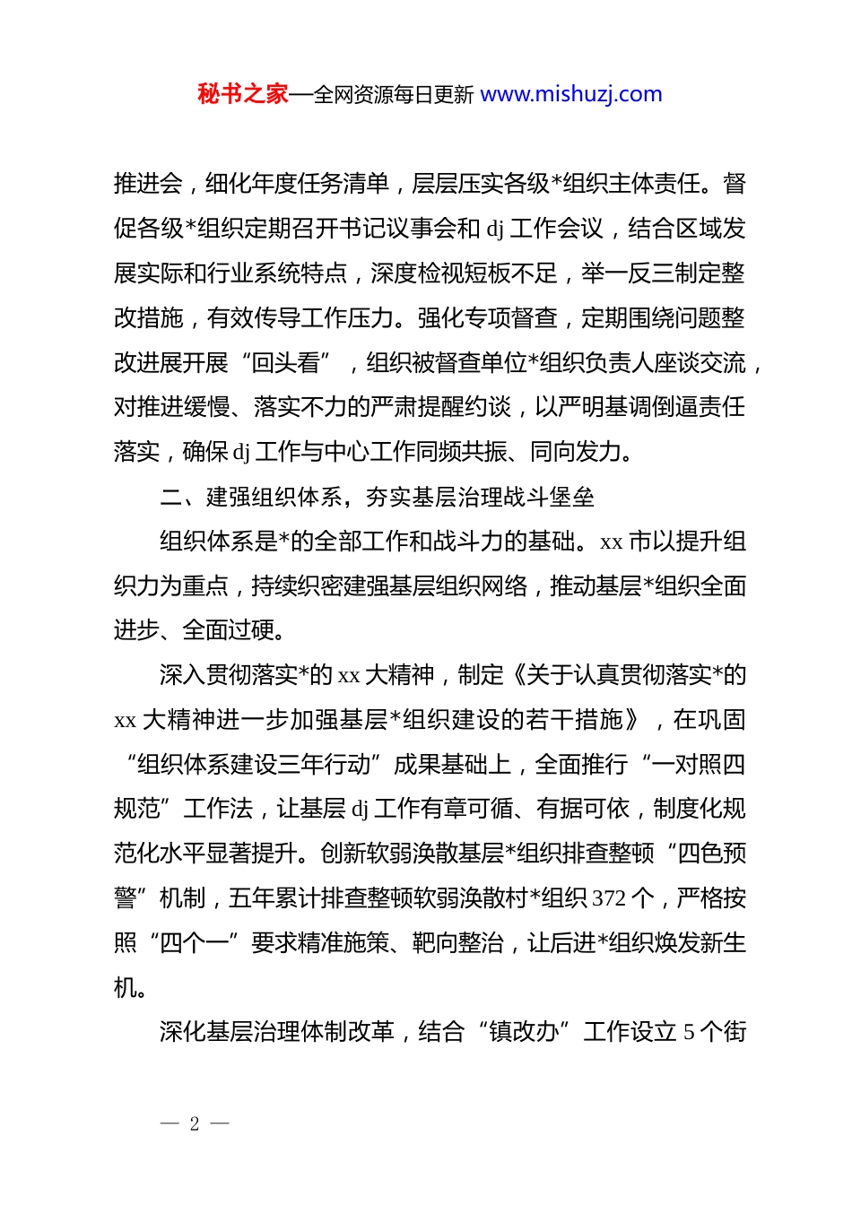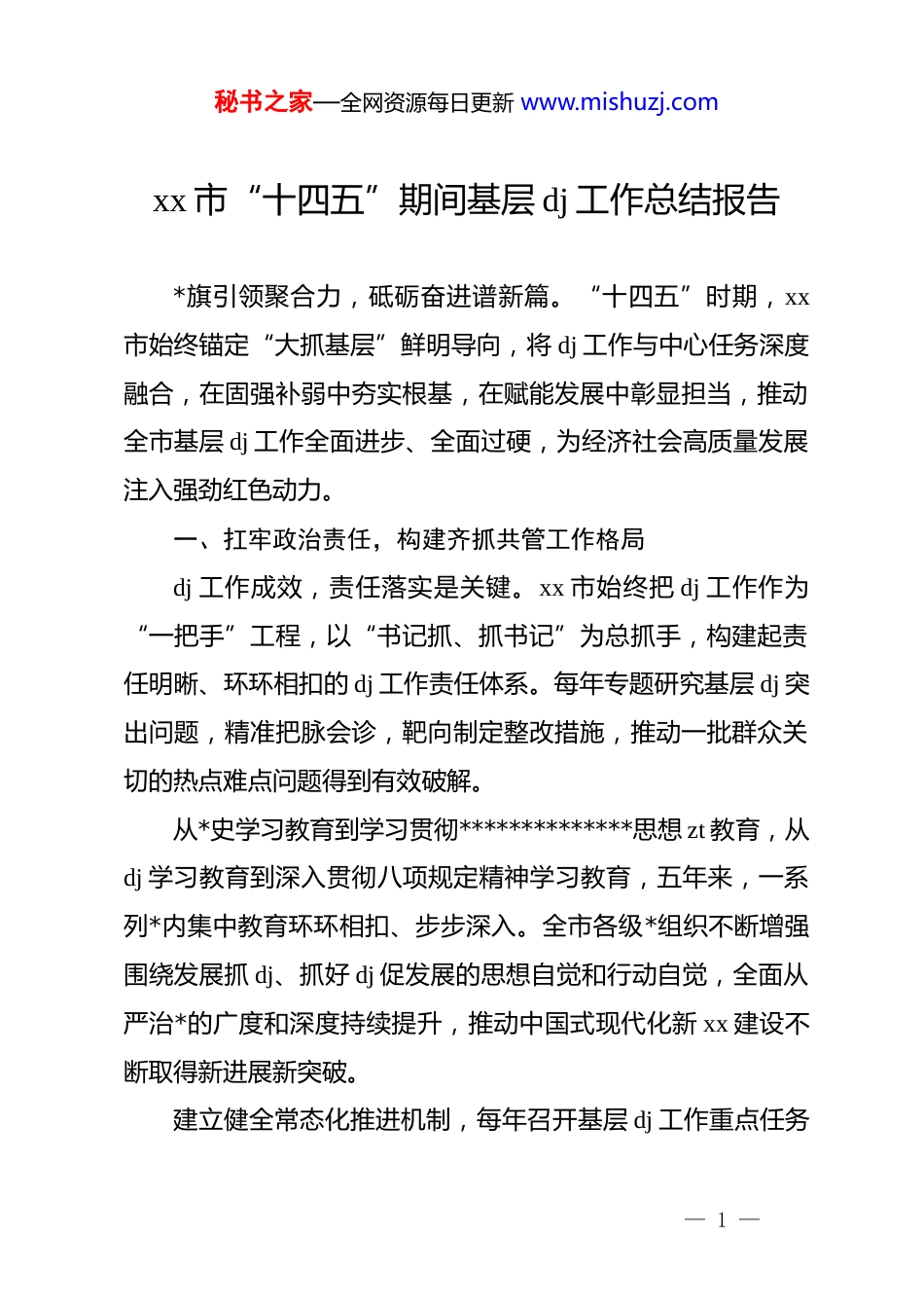 秘书之家—全网资源每日更新 www.mishuzj.comxx 市“十四五”期间基层 dj 工作总结报告*旗引领聚合力,砥砺奋进谱新篇。“十四五”时期,xx市始终锚定“大抓基层”鲜明导向,将 dj 工作与中心任务深度融合,在固强补弱中夯实根基,在赋能发展中彰显担当,推动全市基层 dj 工作全面进步、全面过硬,为经济社会高质量发展注入强劲红色动力。一、扛牢政治责任,构建齐抓共管工作格局dj 工作成效,责任落实是关键。xx 市始终把 dj 工作作为“一把手”工程,以“书记抓、抓书记”为总抓手,构建起责任明晰、环环相扣的 dj 工作责任体系。每年专题研究基层 dj 突出问题,精准把脉会诊,靶向制定整改措施,推动一批群众关切的热点难点问题得到有效破解。从*史学习教育到学习贯彻**************思想 zt 教育,从dj 学习教育到深入贯彻八项规定精神学习教育,五年来,一系列*内集中教育环环相扣、步步深入。全市各级*组织不断增强围绕发展抓 dj、抓好 dj 促发展的思想自觉和行动自觉,全面从严治*的广度和深度持续提升,推动中国式现代化新 xx 建设不断取得新进展新突破。建立健全常态化推进机制,每年召开基层 dj 工作重点任务— 1 —秘书之家—全网资源每日更新 www.mishuzj.com推进会,细化年度任务清单,层层压实各级*组织主体责任。督促各级*组织定期召开书记议事会和 dj 工作会议,结合区域发展实际和行业系统特点,深度检视短板不足,举一反三制定整改措施,有效传导工作压力。强化专项督查,定期围绕问题整改进展开展“回头看”,组织被督查单位*组织负责人座谈交流,对推进缓慢、落实不力的严肃提醒约谈,以严明基调倒逼责任落实,确保 dj 工作与中心工作同频共振、同向发力。二、建强组织体系,夯实基层治理战斗堡垒组织体系是*的全部工作和战斗力的基础。xx 市以提升组织力为重点,持续织密建强基层组织网络,推动基层*组织全面进步、全面过硬。深入贯彻落实*的 xx 大精神,制定《关于认真贯彻落实*的xx 大精神进一步加强基层*组织建设的若干措施》,在巩固“组织体系建设三年行动”成果基础上,全面推行“一对照四规范”工作法,让基层 dj 工作有章可循、有据可依,制度化规范化水平显著提升。创新软弱涣散基层*组织排查整顿“四色预警”机制,五年累计排查整顿软弱涣散村*组织 372 个,严格按照“四个一”要求精准施策、靶向整治,让后进*组织焕发新生机。深化基层治理体制改革,结合“镇改办”工作设立 5 个街— 2 —秘书之家—全网资源每日更新 www.mishuzj.com道办事处,同步设置 dj 办公室等职能机构,全面推进“五权”下放,理顺街道管理体制,让基层有权办事、有能服务。制定《dj 引领城乡社区基层治理重点任务分工方案》,构建共建共治共享治理体系,推动城市基层治理效能持续提升。实施“村(社区)干部学历素质提升工程”,动员 1257 名村(社区)干部报读电大大专、中职班,实现学历素质“双提升”。畅通晋升渠道,近年来 35 名优秀村(社区)*组织书记通过考录、考核聘用成为行政事业干部,极大激发基层干部干事创业热情活力。针对社区工作者素质能力不足问题,投入669.7 万元实施社区工作者职业体系建设工程,与省内高等职业技术学院签订 4 项专项培养协议,系统化提升队伍专业素养,让社区服务更专业更贴心。三、强化 dj 引领,激活高质量发展新引擎xx 市始终坚持把 dj 工作深度融入经济社会发展各领域,以高质量 dj 引领高质量发展,让*旗在发展一线高高飘扬。聚焦乡村振兴战略,制定《抓 dj 促乡村振兴 40 条措施》,扎实做好三轮驻村第一书记和工作队调整轮换工作。2021 年向631 个脱贫村、易地搬迁安置村(点)、乡村振兴重点村选派1921 名驻村干部,2023 年选派 1906 名,2025 年选派 1899 名,一批政治过硬、能力突出的干部扎根基层、助力振兴。印发— 3 —秘书之家—全网资源每日更新 www.mishuzj.com《关于严格第一书记和工作队员选派管理服务工作的通知》,组建驻村干部管理专班,建立“四方联动”工作机制,通过比武竞赛、模拟访谈、实操教学等多样化培训方式,对驻村...