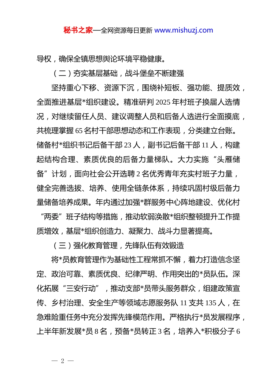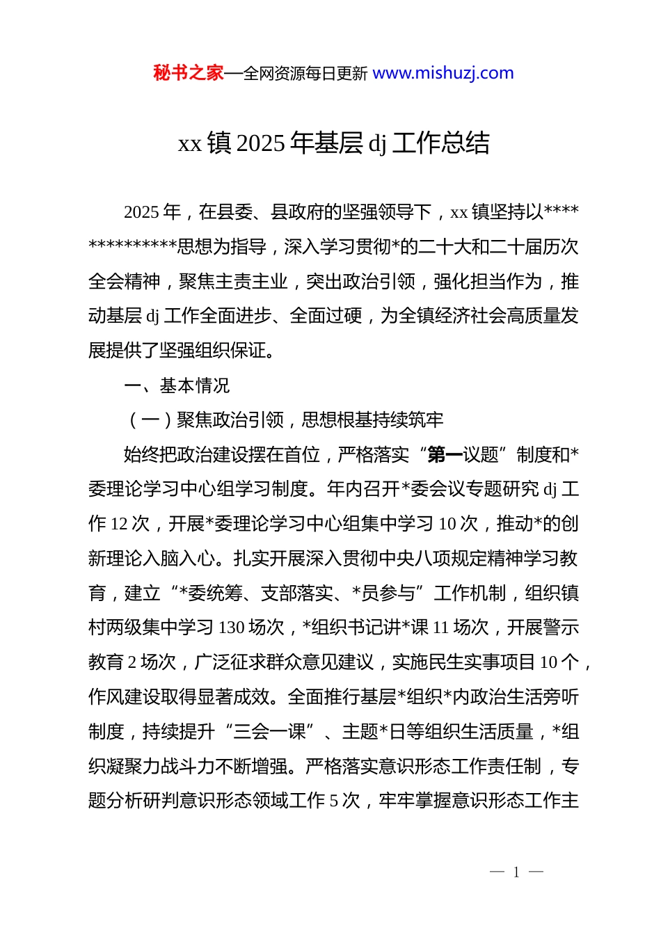 秘书之家—全网资源每日更新 www.mishuzj.comxx 镇 2025 年基层 dj 工作总结2025 年,在县委、县政府的坚强领导下,xx 镇坚持以**************思想为指导,深入学习贯彻*的二十大和二十届历次全会精神,聚焦主责主业,突出政治引领,强化担当作为,推动基层 dj 工作全面进步、全面过硬,为全镇经济社会高质量发展提供了坚强组织保证。一、基本情况(一)聚焦政治引领,思想根基持续筑牢始终把政治建设摆在首位,严格落实“第一议题”制度和*委理论学习中心组学习制度。年内召开*委会议专题研究 dj 工作 12 次,开展*委理论学习中心组集中学习 10 次,推动*的创新理论入脑入心。扎实开展深入贯彻中央八项规定精神学习教育,建立“*委统筹、支部落实、*员参与”工作机制,组织镇村两级集中学习 130 场次,*组织书记讲*课 11 场次,开展警示教育 2 场次,广泛征求群众意见建议,实施民生实事项目 10 个,作风建设取得显著成效。全面推行基层*组织*内政治生活旁听制度,持续提升“三会一课”、主题*日等组织生活质量,*组织凝聚力战斗力不断增强。严格落实意识形态工作责任制,专题分析研判意识形态领域工作 5 次,牢牢掌握意识形态工作主— 1 —秘书之家—全网资源每日更新 www.mishuzj.com导权,确保全镇思想舆论环境平稳健康。(二)夯实基层基础,战斗堡垒不断建强坚持重心下移、资源下沉,围绕补短板、强功能、提质效,全面推进基层*组织建设。精准研判 2025 年村班子换届人选情况,对继续留任人员、建议调整人员和后备人选进行全面摸底,共梳理掌握 65 名村干部思想动态和工作表现,分类建立台账。储备村*组织书记后备干部 23 人,副书记后备干部 11 人,构建起结构合理、素质优良的后备力量梯队。大力实施“头雁储备”计划,面向社会公开选聘 2 名优秀青年充实村班子力量,健全完善选拔、培养、使用全链条体系,持续巩固村级后备力量储备培养成果。年内通过加强*群服务中心阵地建设、优化村“两委”班子结构等措施,推动软弱涣散*组织整顿提升工作提质增效,基层*组织创造力、凝聚力、战斗力显著提高。(三)强化教育管理,先锋队伍有效锻造将*员教育管理作为基础性工程常抓不懈,着力打造信念坚定、政治可靠、素质优良、纪律严明、作用突出的*员队伍。深化拓展“三安行动”,推动支部*员带头服务群众,组建政策宣传、乡村治理、安全生产等领域志愿服务队 11 支共 135 人,在急难险重任务中充分发挥先锋模范作用。严格执行*员发展程序,上半年新发展*员 8 名,预备*员转正 3 名,培养入*积极分子 6— 2 —秘书之家—全网资源每日更新 www.mishuzj.com名、发展对象 26 名,*员队伍规模稳步扩大、结构持续优化。在元旦、春节及“七一”等重要节点,累计走访慰问生活困难*员和老*员 66 人,颁发“光荣在*50 年”纪念章 4 人,切实提升*员的荣誉感归属感。建立流动*员动态信息库,依托线上平台加强日常联系与服务管理,确保流动*员“离乡不离*、流动不流失”。(四)聚力实干担当,发展大局有力服务深化拓展“揭榜挂帅”机制,年内推进整改问题 19 个、攻坚任务 32 项、创新项目 12 个,有效促进 dj 优势转化为发展优势。构建以村*组织为核心、龙头企业和专业合作社为支撑的“一核多元”组织体系,高标准打造 xx 坝和 xx 分生态健康设施瓜菜产业园、xx 田地万只肉羊养殖场等示范园区,为生态农业发展注入强劲动力。大力推行“五配套+粮食+制种”模块化农业发展模式,新建 xx 沟村、xx 分村 2 个千亩高效节水葵花制种示范基地,辐射带动全镇制种面积达到 3.6 万亩以上,产业聚集力和核心竞争力持续提升。深入实施村级集体经济倍增计划,因地制宜实施壮大集体经济项目 37 个,截至目前,全镇实现村级集体经济总收入 282.58 万元,村集体经济发展活力显著增强。(五)强化责任担当,民生福祉稳步增进— 3 —秘书之家—全网资源每日更新 www.mishuzj.com坚持 dj 引领美丽乡村建设,稳步推进人居环境整治和基础设施建设。全力推进 xx 庄村和 xx 村生态及地质灾害避险搬迁集中安置点建设,新...