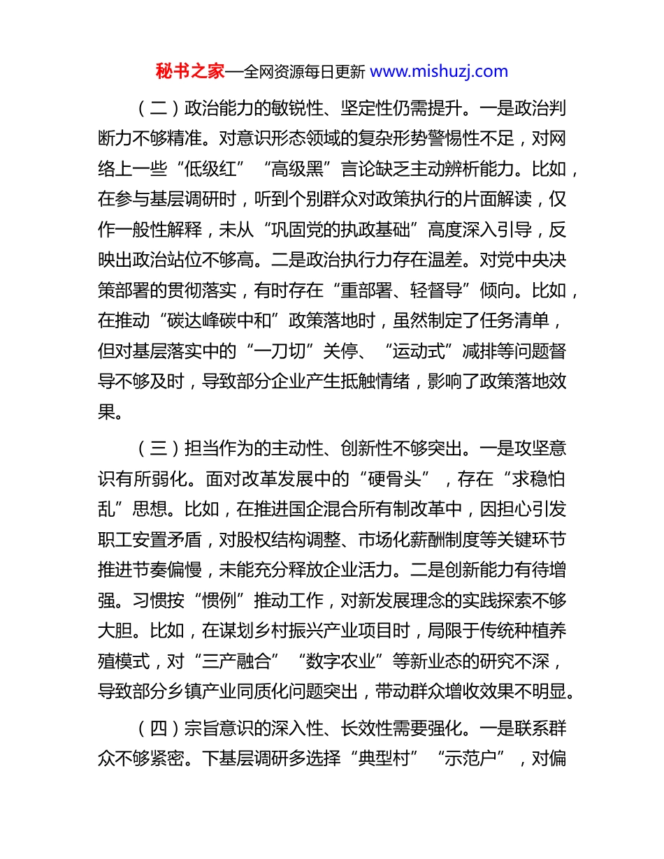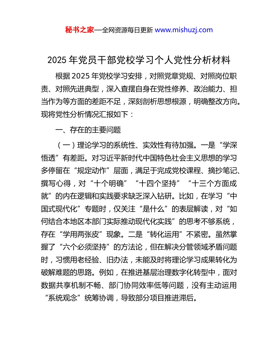 秘书之家—全网资源每日更新 www.mishuzj.com2025 年党员干部党校学习个人党性分析材料根据 2025 年党校学习安排,对照党章党规、对照岗位职责、对照先进典型,深入查摆自身在党性修养、政治能力、担当作为等方面的差距不足,深刻剖析思想根源,明确整改方向。现将党性分析情况汇报如下:一、存在的主要问题(一)理论学习的系统性、实效性有待加强。一是“学深悟透”有差距。对习近平新时代中国特色社会主义思想的学习多停留在“规定动作”层面,满足于完成党校课程、摘抄笔记、撰写心得,对“十个明确”“十四个坚持”“十三个方面成就”的内在逻辑和实践要求缺乏深入钻研。比如,在学习“中国式现代化”专题时,仅关注“是什么”的表层解读,对“如何结合本地区本部门实际推动现代化实践”的思考不够系统,存在“学用两张皮”现象。二是“转化运用”不紧密。虽然掌握了“六个必须坚持”的方法论,但在解决分管领域矛盾问题时,习惯用老经验、旧办法,未能及时将理论学习成果转化为破解难题的思路。例如,在推进基层治理数字化转型中,面对数据共享机制不畅、部门协同效率低等问题,没有主动运用“系统观念”统筹协调,导致部分项目推进滞后。秘书之家—全网资源每日更新 www.mishuzj.com(二)政治能力的敏锐性、坚定性仍需提升。一是政治判断力不够精准。对意识形态领域的复杂形势警惕性不足,对网络上一些“低级红”“高级黑”言论缺乏主动辨析能力。比如,在参与基层调研时,听到个别群众对政策执行的片面解读,仅作一般性解释,未从“巩固党的执政基础”高度深入引导,反映出政治站位不够高。二是政治执行力存在温差。对党中央决策部署的贯彻落实,有时存在“重部署、轻督导”倾向。比如,在推动“碳达峰碳中和”政策落地时,虽然制定了任务清单,但对基层落实中的“一刀切”关停、“运动式”减排等问题督导不够及时,导致部分企业产生抵触情绪,影响了政策落地效果。(三)担当作为的主动性、创新性不够突出。一是攻坚意识有所弱化。面对改革发展中的“硬骨头”,存在“求稳怕乱”思想。比如,在推进国企混合所有制改革中,因担心引发职工安置矛盾,对股权结构调整、市场化薪酬制度等关键环节推进节奏偏慢,未能充分释放企业活力。二是创新能力有待增强。习惯按“惯例”推动工作,对新发展理念的实践探索不够大胆。比如,在谋划乡村振兴产业项目时,局限于传统种植养殖模式,对“三产融合”“数字农业”等新业态的研究不深,导致部分乡镇产业同质化问题突出,带动群众增收效果不明显。(四)宗旨意识的深入性、长效性需要强化。一是联系群众不够紧密。下基层调研多选择“典型村”“示范户”,对偏秘书之家—全网资源每日更新 www.mishuzj.com远村、困难群众的走访较少。比如,今年以来到联系点调研 6次,其中 4 次集中在产业基础较好的 A 村,对矛盾较多、基础薄弱的 B 村仅去 1 次,未能全面掌握群众真实需求。二是解决问题不够彻底。对群众反映的急难愁盼问题,有时存在“完成即交账”心态。比如,针对社区居民反映的“停车难”问题,协调相关部门施划了临时停车位,但未从“优化小区规划、共享周边单位车位”等长效机制入手,导致高峰期停车矛盾依然突出。(五)纪律规矩的严格性、自觉性仍需巩固。一是细节执行存在松懈。对“八小时外”社交圈、生活圈的自我约束有时不够严格。比如,参加同学聚会时,对个别朋友打听干部任免信息的行为,虽未透露具体内容,但未严肃制止,反映出纪律防线不够牢固。二是警示教育成效不足。在分管领域开展廉政教育时,多以会议传达、文件学习的形式为主,对“身边人身边事”的案例剖析不够深入。比如,今年某下属单位发生违规发放津补贴问题,我虽组织了通报批评,但未举一反三开展“以案促改”专项整治,导致同类问题在另一家单位再次发生。二、原因分析上述问题的产生,根源在于理论武装的自觉性、党性修养的持续性、宗旨立场的坚定性存在不足,具体分析如下:秘书之家—全网资源每日更新 www.mishuzj.com(一)理论武装的“根”扎得不深。没有把理论学习作为“终身课题”,存在“实用主义”倾向,对与分管工作直接相...