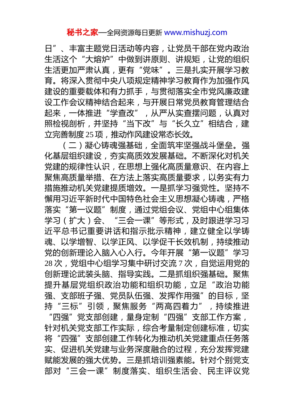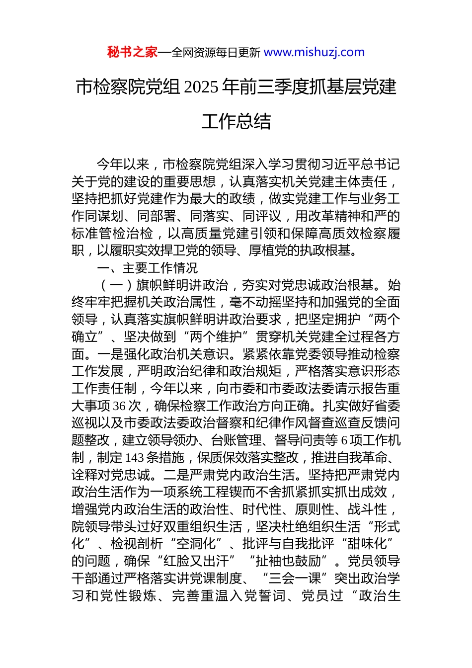 秘书之家—全网资源每日更新 www.mishuzj.com市检察院党组 2025 年前三季度抓基层党建工作总结今年以来,市检察院党组深入学习贯彻习近平总书记关于党的建设的重要思想,认真落实机关党建主体责任,坚持把抓好党建作为最大的政绩,做实党建工作与业务工作同谋划、同部署、同落实、同评议,用改革精神和严的标准管检治检,以高质量党建引领和保障高质效检察履职,以履职实效捍卫党的领导、厚植党的执政根基。一、主要工作情况(一)旗帜鲜明讲政治,夯实对党忠诚政治根基。始终牢牢把握机关政治属性,毫不动摇坚持和加强党的全面领导,认真落实旗帜鲜明讲政治要求,把坚定拥护“两个确立”、坚决做到“两个维护”贯穿机关党建全过程各方面。一是强化政治机关意识。紧紧依靠党委领导推动检察工作发展,严明政治纪律和政治规矩,严格落实意识形态工作责任制,今年以来,向市委和市委政法委请示报告重大事项 36 次,确保检察工作政治方向正确。扎实做好省委巡视以及市委政法委政治督察和纪律作风督查巡查反馈问题整改,建立领导领办、台账管理、督导问责等 6 项工作机制,制定 143 条措施,保质保效落实整改,推进自我革命、诠释对党忠诚。二是严肃党内政治生活。坚持把严肃党内政治生活作为一项系统工程锲而不舍抓紧抓实抓出成效,增强党内政治生活的政治性、时代性、原则性、战斗性,院领导带头过好双重组织生活,坚决杜绝组织生活“形式化”、检视剖析“空洞化”、批评与自我批评“甜味化”的问题,确保“红脸又出汗”“扯袖也鼓励”。党员领导干部通过严格落实讲党课制度、“三会一课”突出政治学习和党性锻炼、完善重温入党誓词、党员过“政治生秘书之家—全网资源每日更新 www.mishuzj.com日”、丰富主题党日活动等内容,让党员干部在党内政治生活这个“大熔炉”中做到讲原则、讲规矩,让党的组织生活更加严肃认真,更有“党味”。三是扎实开展学习教育。将深入贯彻中央八项规定精神学习教育作为加强作风建设的重要载体和有力抓手,与贯彻落实全市党风廉政建设工作会议精神结合起来,与开展日常党员教育管理结合起来,一体推进“学查改”,从严从实查摆问题,认真对照检视剖析,并坚持“当下改”与“长久立”相结合,建立完善制度 25 项,推动作风建设常态长效。(二)凝心铸魂强基础,全面筑牢坚强战斗堡垒。强化基层组织建设,夯实高质效发展基础。不断深化对机关党建的规律性认识,在思想上强化高质量意识、在内容上聚焦高质量举措、在方法上落实高质量要求,以务实有力措施推动机关党建提质增效。一是抓学习强党性。坚持不懈用习近平新时代中国特色社会主义思想凝心铸魂,严格落实“第一议题”制度,通过党组会议、党组中心组集体学习(扩大)会、“三会一课”等形式,及时跟进学习习近平总书记重要讲话和指示批示精神,建立健全以学铸魂、以学增智、以学正风、以学促干长效机制,持续推动党的创新理论入脑入心入行。今年开展“第一议题”学习28 次,党组中心组学习集中研讨交流 7 次,自觉运用党的创新理论武装头脑、指导实践。二是抓组织强基础。聚焦提升基层党组织政治功能和组织功能,立足“政治功能强、支部班子强、党员队伍强、发挥作用强”的目标,坚持“三标”引领,聚焦服务“两高四着力”,持续推进“四强”党支部创建,量身定制“四强”支部工作方案,针对机关党支部工作实际,综合考量制定创建标准,切实将“四强”支部创建工作转化为推动机关党建重点任务落实、促进机关党建与业务深度融合的过程,充分发挥党建赋能发展的强大优势。三是抓培训强素能。针对个别党支部对“三会一课”制度落实、组织生活会、民主评议党秘书之家—全网资源每日更新 www.mishuzj.com员、主题党日活动、谈心谈话等不够规范的问题,市检察院党组邀请省委党校教授对机关委员会委员、各党支部书记、支部委员及全体党务工作者,进行“做实党支部实务”专题培训,面对面讲授如何建设标准化、规范化党支部,有效提升了支部党员政治素养、业务素能、实操应用能力以及党建工作水平,促进了机关党建工作质量的提高。(三)守正创新促发展,激活党建业务融合动力。坚持紧密结合...