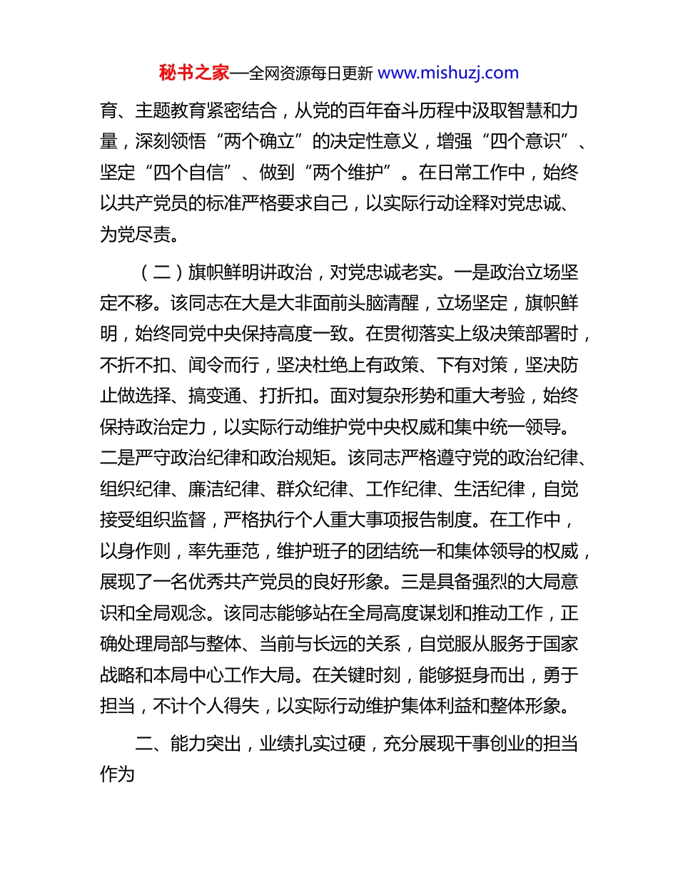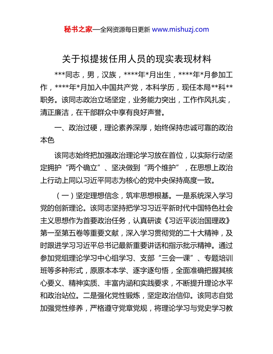 秘书之家—全网资源每日更新 www.mishuzj.com关于拟提拔任用人员的现实表现材料***同志,男,汉族,****年*月出生,****年*月参加工作,****年*月加入中国共产党,本科学历,现任本局**科**职务。该同志政治立场坚定,业务能力突出,工作作风扎实,清正廉洁,在干部群众中享有良好声誉。一、政治过硬,理论素养深厚,始终保持忠诚可靠的政治本色该同志始终把加强政治理论学习放在首位,以实际行动坚定拥护“两个确立”、坚决做到“两个维护”,在思想上政治上行动上同以习近平同志为核心的党中央保持高度一致。(一)坚定理想信念,筑牢思想根基。一是系统深入学习党的创新理论。该同志坚持把学习习近平新时代中国特色社会主义思想作为首要政治任务,认真研读《习近平谈治国理政》第一至第五卷等重要文献,深入学习贯彻党的二十大精神,及时跟进学习习近平总书记最新重要讲话和指示批示精神。通过参加党组理论学习中心组学习、支部“三会一课”、专题培训班等多种形式,原原本本学、逐字逐句悟,全面准确把握其核心要义、精神实质、丰富内涵和实践要求,不断提升理论水平和政治站位。二是强化党性锻炼,坚定政治信仰。该同志自觉加强党性修养,严格遵守党章党规,将理论学习与党史学习教秘书之家—全网资源每日更新 www.mishuzj.com育、主题教育紧密结合,从党的百年奋斗历程中汲取智慧和力量,深刻领悟“两个确立”的决定性意义,增强“四个意识”、坚定“四个自信”、做到“两个维护”。在日常工作中,始终以共产党员的标准严格要求自己,以实际行动诠释对党忠诚、为党尽责。(二)旗帜鲜明讲政治,对党忠诚老实。一是政治立场坚定不移。该同志在大是大非面前头脑清醒,立场坚定,旗帜鲜明,始终同党中央保持高度一致。在贯彻落实上级决策部署时,不折不扣、闻令而行,坚决杜绝上有政策、下有对策,坚决防止做选择、搞变通、打折扣。面对复杂形势和重大考验,始终保持政治定力,以实际行动维护党中央权威和集中统一领导。二是严守政治纪律和政治规矩。该同志严格遵守党的政治纪律、组织纪律、廉洁纪律、群众纪律、工作纪律、生活纪律,自觉接受组织监督,严格执行个人重大事项报告制度。在工作中,以身作则,率先垂范,维护班子的团结统一和集体领导的权威,展现了一名优秀共产党员的良好形象。三是具备强烈的大局意识和全局观念。该同志能够站在全局高度谋划和推动工作,正确处理局部与整体、当前与长远的关系,自觉服从服务于国家战略和本局中心工作大局。在关键时刻,能够挺身而出,勇于担当,不计个人得失,以实际行动维护集体利益和整体形象。二、能力突出,业绩扎实过硬,充分展现干事创业的担当作为秘书之家—全网资源每日更新 www.mishuzj.com该同志具有较高的专业素养和较强的工作能力,在承担的各项工作中表现出色,取得了显著成绩,赢得了领导和同事的广泛认可。(一)专业功底深厚,业务能力精湛。一是具备扎实的理论功底和实践经验。该同志长期在本局**领域工作,对相关政策法规、业务流程和行业动态有着深刻的理解和把握。通过持续学习和实践,不断更新知识结构,提升专业技能,成为本部门的业务骨干。在处理复杂问题时,能够迅速抓住核心,提出切实可行的解决方案,展现了卓越的专业判断力。二是具备较强的组织协调和执行能力。该同志善于将宏观部署转化为具体行动,能够有效地组织和调动各方资源,推动各项工作顺利开展。在承担重大任务时,能够提前谋划,周密部署,注重细节,确保工作高效率、高质量完成。例如,在**项目中,该同志主动牵头,协调多个部门和外部机构,制定详细工作方案,确保项目按期保质完成,受到上级领导的高度肯定。(二)锐意开拓创新,积极攻坚克难。一是勇于探索新思路新方法。该同志不满足于现状,在工作中注重总结经验,善于发现问题并思考创新性解决方案。面对传统模式的局限,敢于打破常规,积极引入先进理念和技术,推动工作提质增效。例如,针对**工作中的瓶颈问题,该同志通过深入调研,提出了“***”的工作模式,有效提升了工作效率,降低了运营成本。二是善于应对复杂局面和挑战。在面对急难险重任务时,秘书之家—全网资源...