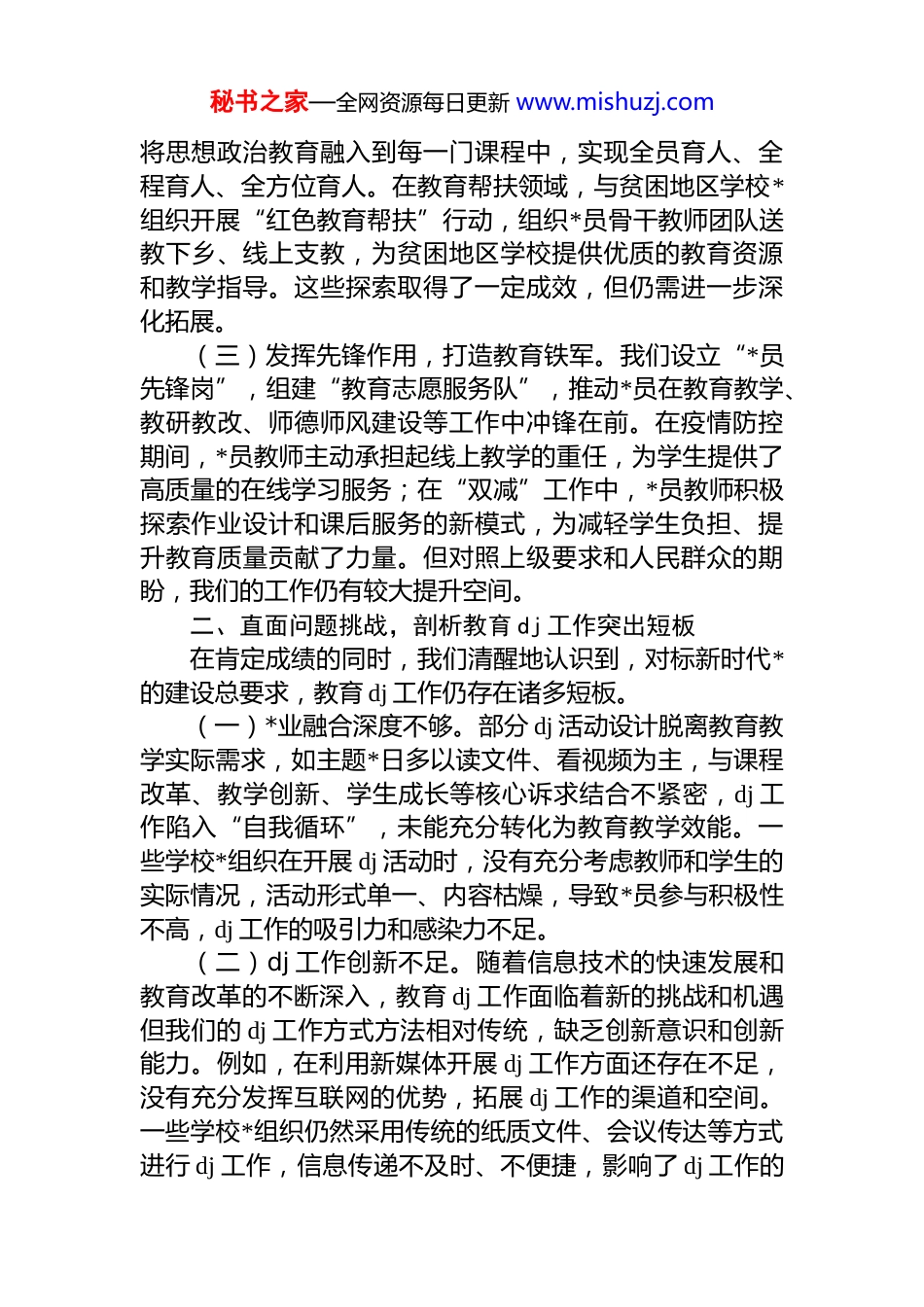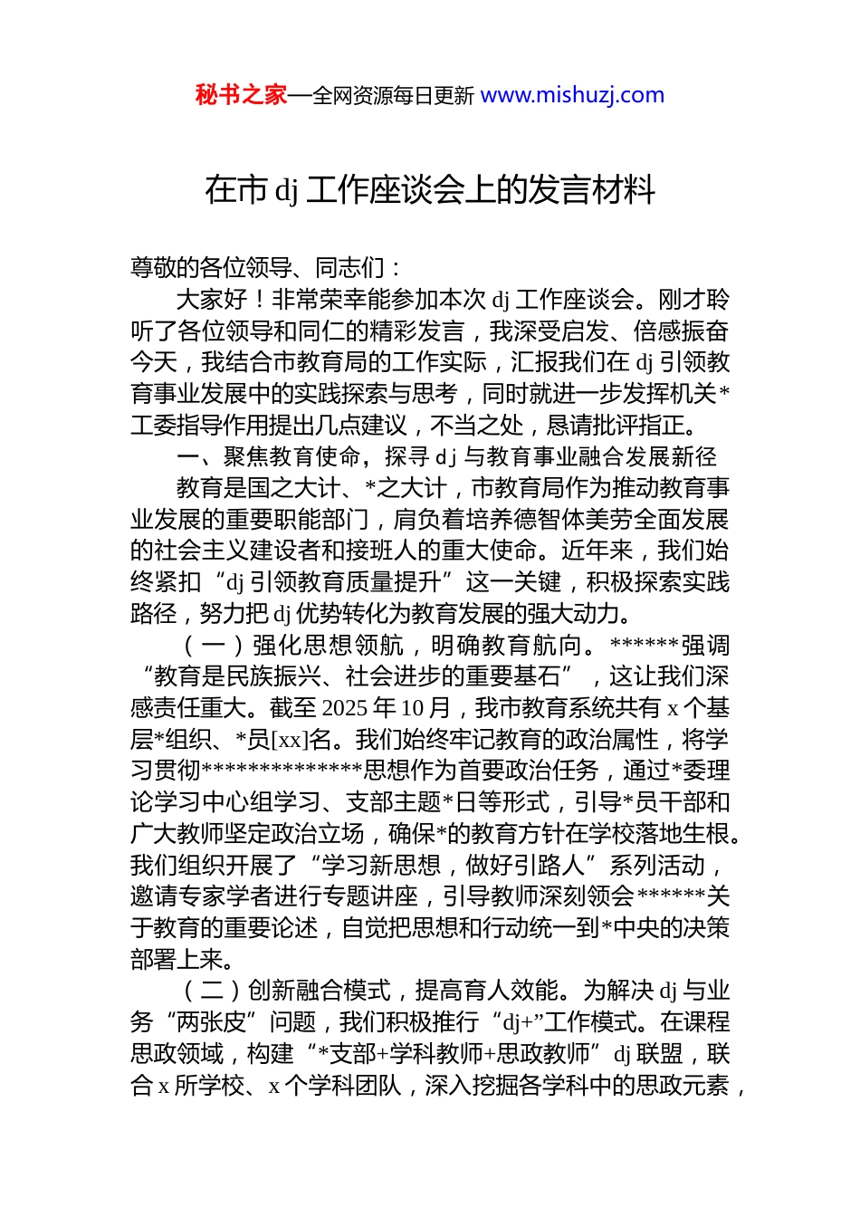 秘书之家—全网资源每日更新 www.mishuzj.com在市 dj 工作座谈会上的发言材料尊敬的各位领导、同志们:大家好!非常荣幸能参加本次 dj 工作座谈会。刚才聆听了各位领导和同仁的精彩发言,我深受启发、倍感振奋今天,我结合市教育局的工作实际,汇报我们在 dj 引领教育事业发展中的实践探索与思考,同时就进一步发挥机关*工委指导作用提出几点建议,不当之处,恳请批评指正。一、聚焦教育使命,探寻 dj 与教育事业融合发展新径教育是国之大计、*之大计,市教育局作为推动教育事业发展的重要职能部门,肩负着培养德智体美劳全面发展的社会主义建设者和接班人的重大使命。近年来,我们始终紧扣“dj 引领教育质量提升”这一关键,积极探索实践路径,努力把 dj 优势转化为教育发展的强大动力。(一)强化思想领航,明确教育航向。******强调“教育是民族振兴、社会进步的重要基石”,这让我们深感责任重大。截至 2025 年 10 月,我市教育系统共有 x 个基层*组织、*员[xx]名。我们始终牢记教育的政治属性,将学习贯彻**************思想作为首要政治任务,通过*委理论学习中心组学习、支部主题*日等形式,引导*员干部和广大教师坚定政治立场,确保*的教育方针在学校落地生根。我们组织开展了“学习新思想,做好引路人”系列活动,邀请专家学者进行专题讲座,引导教师深刻领会******关于教育的重要论述,自觉把思想和行动统一到*中央的决策部署上来。(二)创新融合模式,提高育人效能。为解决 dj 与业务“两张皮”问题,我们积极推行“dj+”工作模式。在课程思政领域,构建“*支部+学科教师+思政教师”dj 联盟,联合 x 所学校、x 个学科团队,深入挖掘各学科中的思政元素,秘书之家—全网资源每日更新 www.mishuzj.com将思想政治教育融入到每一门课程中,实现全员育人、全程育人、全方位育人。在教育帮扶领域,与贫困地区学校*组织开展“红色教育帮扶”行动,组织*员骨干教师团队送教下乡、线上支教,为贫困地区学校提供优质的教育资源和教学指导。这些探索取得了一定成效,但仍需进一步深化拓展。(三)发挥先锋作用,打造教育铁军。我们设立“*员先锋岗”,组建“教育志愿服务队”,推动*员在教育教学、教研教改、师德师风建设等工作中冲锋在前。在疫情防控期间,*员教师主动承担起线上教学的重任,为学生提供了高质量的在线学习服务;在“双减”工作中,*员教师积极探索作业设计和课后服务的新模式,为减轻学生负担、提升教育质量贡献了力量。但对照上级要求和人民群众的期盼,我们的工作仍有较大提升空间。二、直面问题挑战,剖析教育 dj 工作突出短板在肯定成绩的同时,我们清醒地认识到,对标新时代*的建设总要求,教育 dj 工作仍存在诸多短板。(一)*业融合深度不够。部分 dj 活动设计脱离教育教学实际需求,如主题*日多以读文件、看视频为主,与课程改革、教学创新、学生成长等核心诉求结合不紧密,dj 工作陷入“自我循环”,未能充分转化为教育教学效能。一些学校*组织在开展 dj 活动时,没有充分考虑教师和学生的实际情况,活动形式单一、内容枯燥,导致*员参与积极性不高,dj 工作的吸引力和感染力不足。(二)dj 工作创新不足。随着信息技术的快速发展和教育改革的不断深入,教育 dj 工作面临着新的挑战和机遇但我们的 dj 工作方式方法相对传统,缺乏创新意识和创新能力。例如,在利用新媒体开展 dj 工作方面还存在不足,没有充分发挥互联网的优势,拓展 dj 工作的渠道和空间。一些学校*组织仍然采用传统的纸质文件、会议传达等方式进行 dj 工作,信息传递不及时、不便捷,影响了 dj 工作的秘书之家—全网资源每日更新 www.mishuzj.com效率和效果。(三)*员教育管理有待加强。部分*员教师对*的理论知识学习不够深入,*性修养有待提高,先锋模范作用发挥不明显。一些学校*组织对*员教师的教育管理不够严格,存在重教学、轻 dj 的现象,对*员教师的思想政治教育和业务培训缺乏系统性和针对性。同时,在*员发展工作中,还存在程序不够规范、标准不够严格等问题,影响了*员队伍的质量。三、把握发展机遇,谋划教育 dj 工...